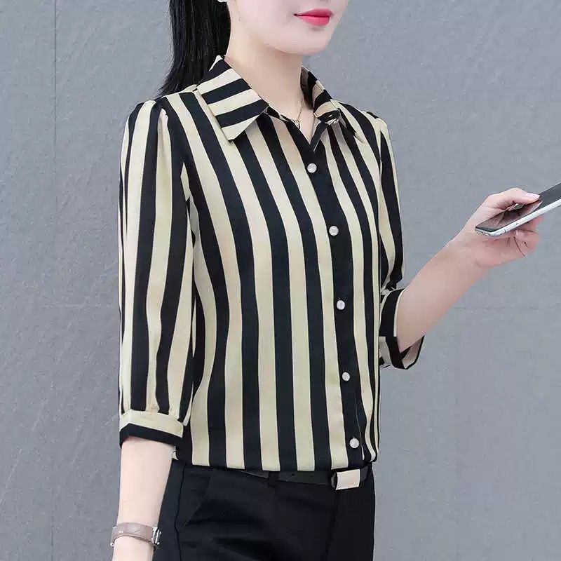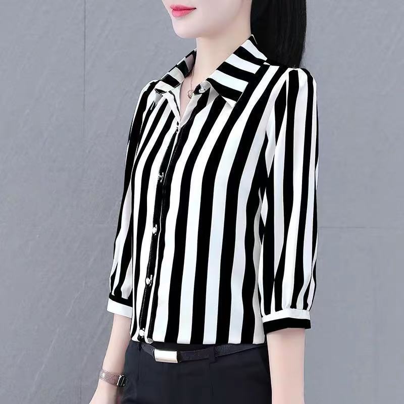Женская полосатая рубашка с рукавом три четверти, новый летний стиль, свободная и тонкая шифоновая рубашка для мам, темпераментный топ