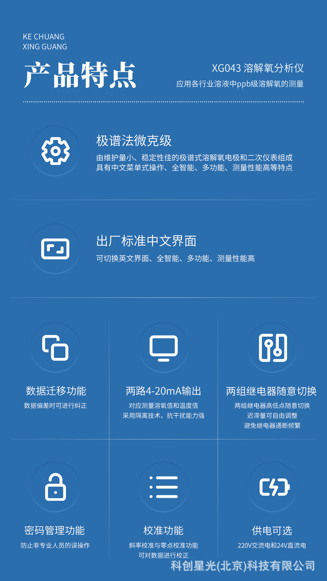 XG043溶解氧分析仪(极谱法微克级) 由维护量小、稳定性佳的极谱式溶解氧电极和二次仪表组成,具有中文菜单式操作、全智能、多功能、测量性能高等特点,广泛应用各行业溶液中ppb级溶解氧的测量。