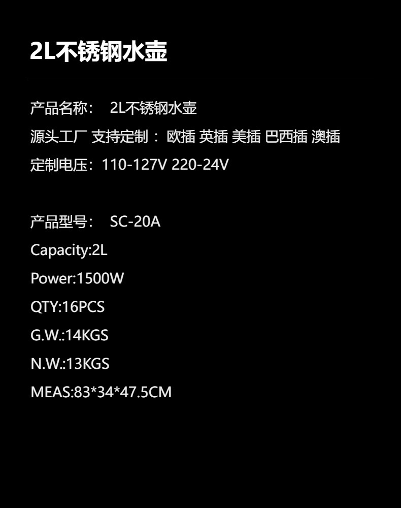Электрический чайник из нержавеющей стали 2 л для трансграничной торговли, модель SC-20A, с автоматическим отключением, от производителя для внешней торговли