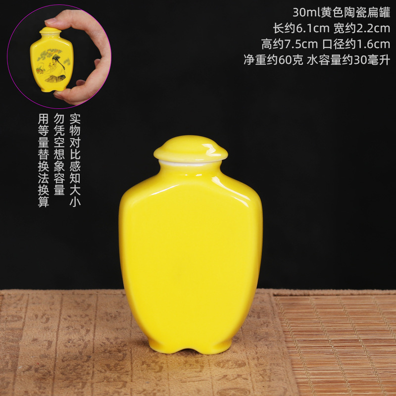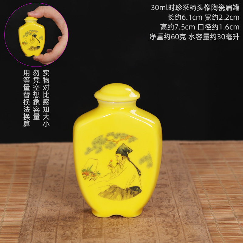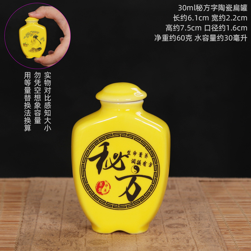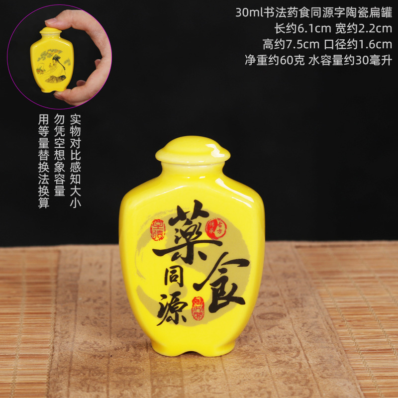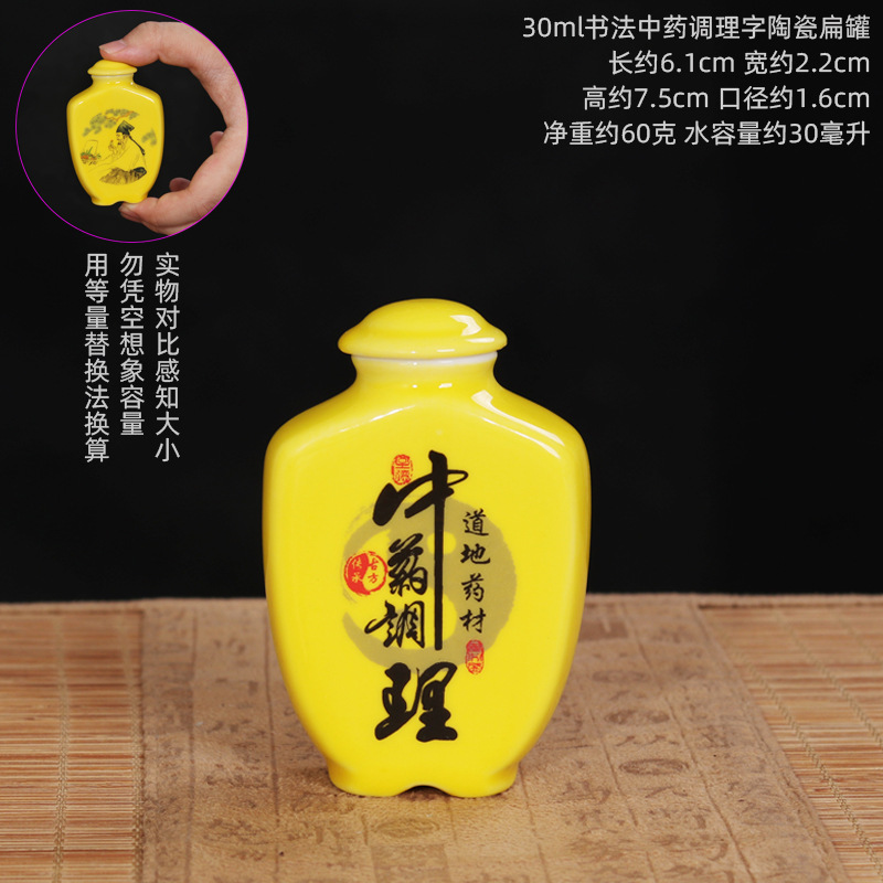 Керамическая плоская банка объемом 30 мл по секретному рецепту; 30 мл каллиграфия, китайская медицина, кондиционирование слов, керамическая плоская банка; 30 мл керамическая плоская банка для каллиграфии и еды; 30 мл Shizhen Medicinal Medicine Avatar Керамическая плоская банка; Плоская керамическая банка желтого цвета объемом 30 мл.