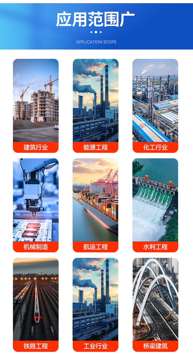 для автомобилей; Солнечная энергия; металлические изделия; Прецизионная электроника; контейнер; Машиностроение; лифт; железнодорожный транзит; напорный сосуд; архитектурное оформление; атомная энергия; Кухонная посуда для общественного питания; Химическое оборудование; Изготовление конструкционных труб