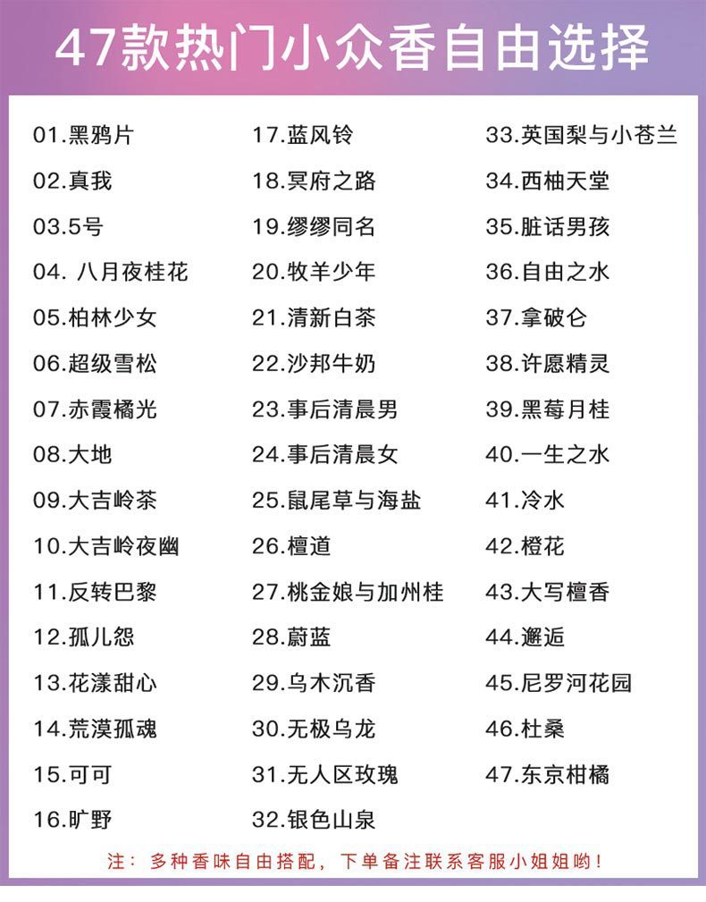 одеколон; молоко; Пачули; ветивер; лимонный вкус; цитрусовый вкус; Кремовый; Молочный вкус; Сакура вкус; сиреневый; Имбирный вкус; Вкус гардении; Мулан; деревянный тон; Вкус фрезии; Вкус уд; Аромат мирта