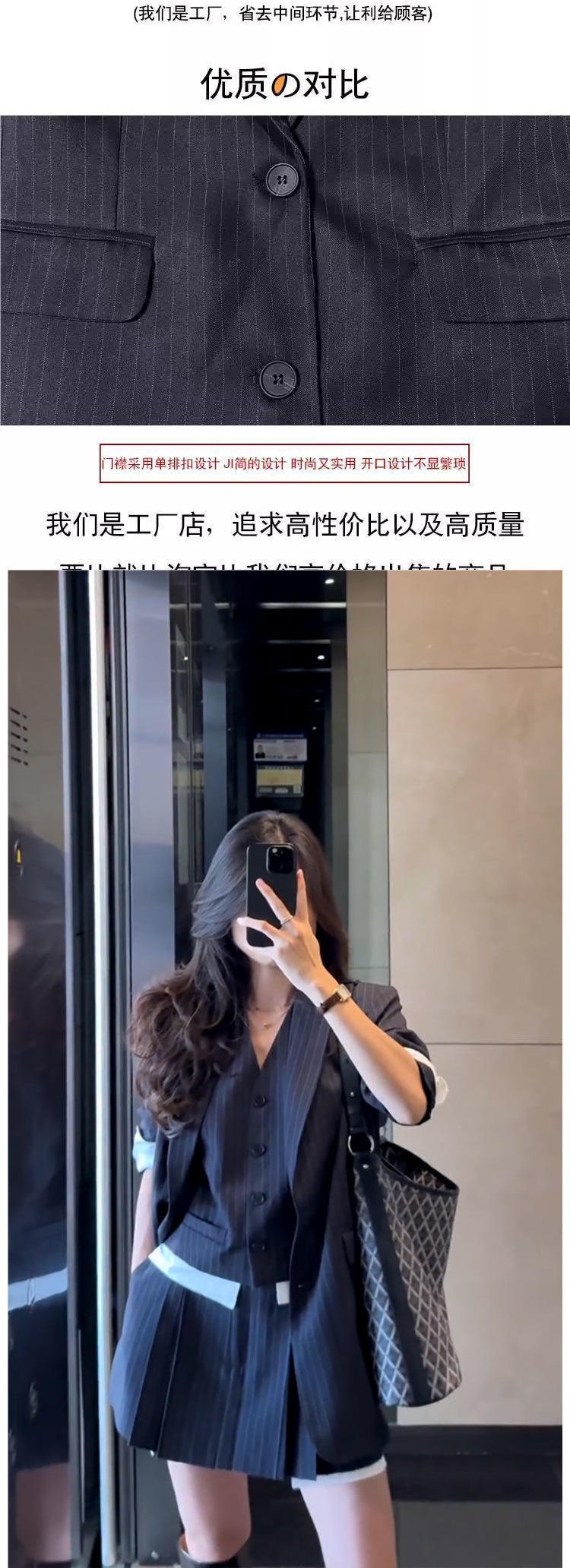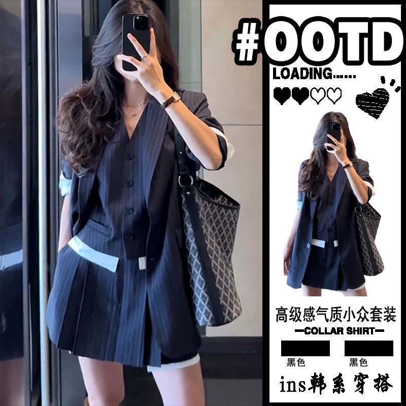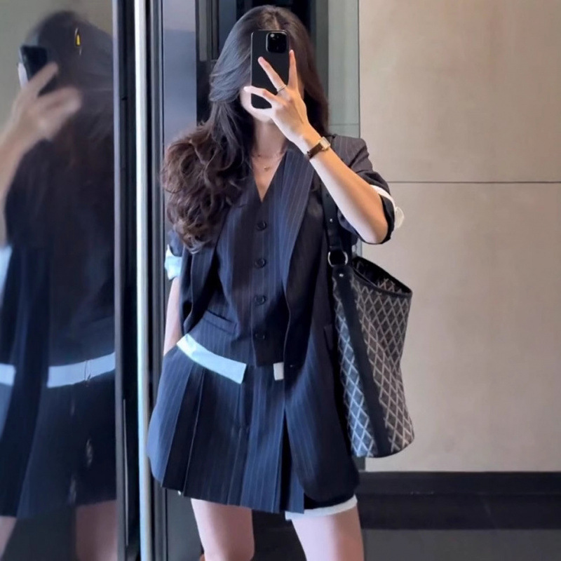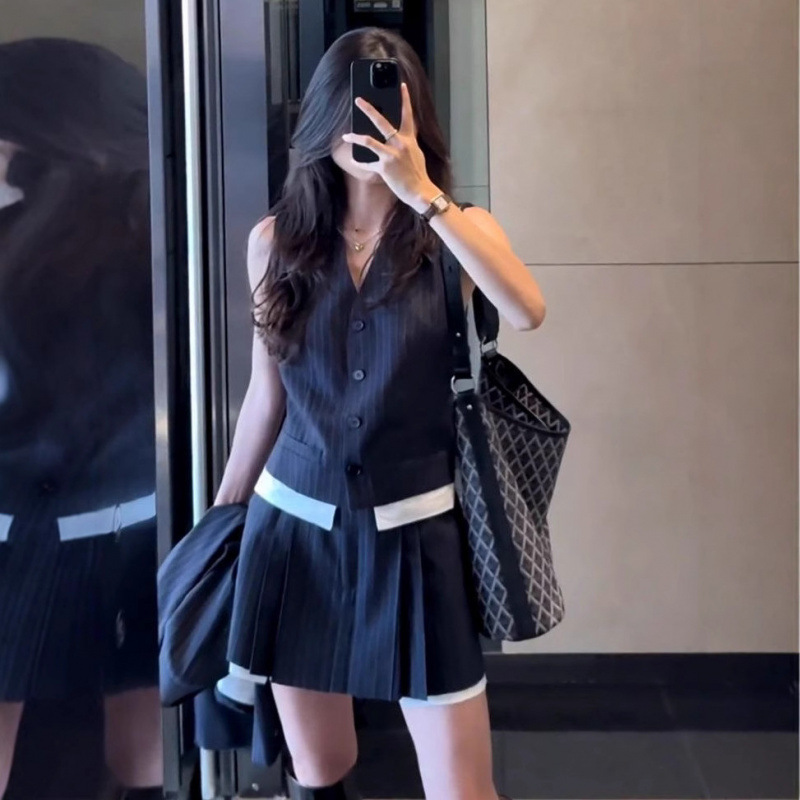 Корейский повседневный костюм в полоску, юбка, женский осенне-зимний короткий жилет с v-образным вырезом, костюм, куртка, юбка трапециевидной формы, комплект из трех предметов