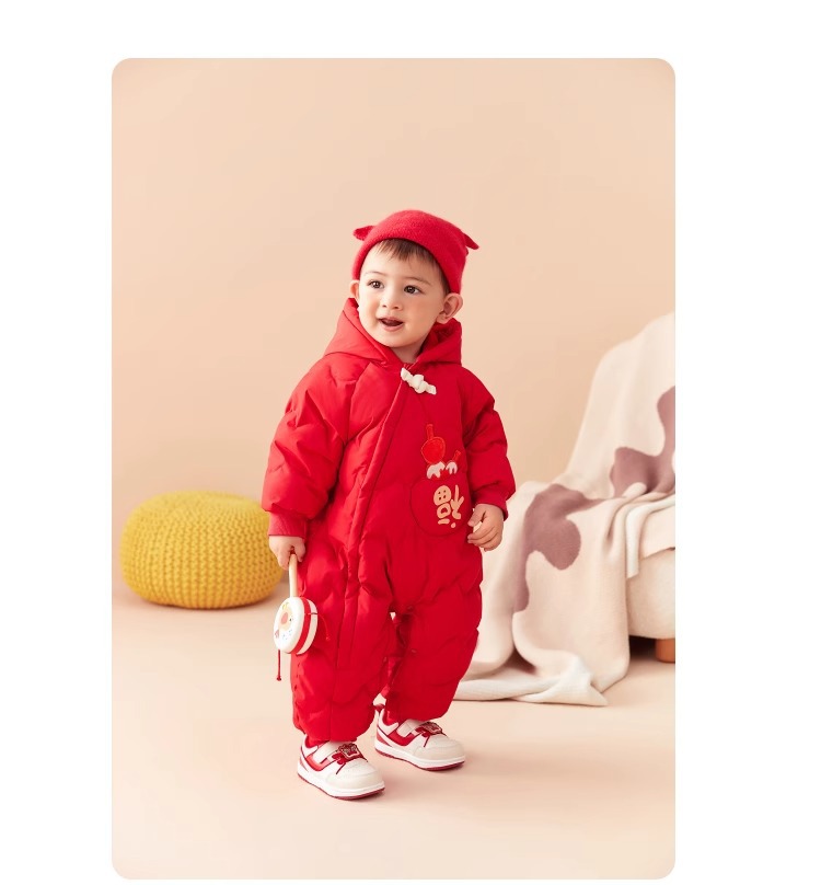 【Shifu】Пуховик-комбинезон с защитой живота для мальчиков и девочек, новый стильный утолщенный пушистый новогодний наряд 2025 года.