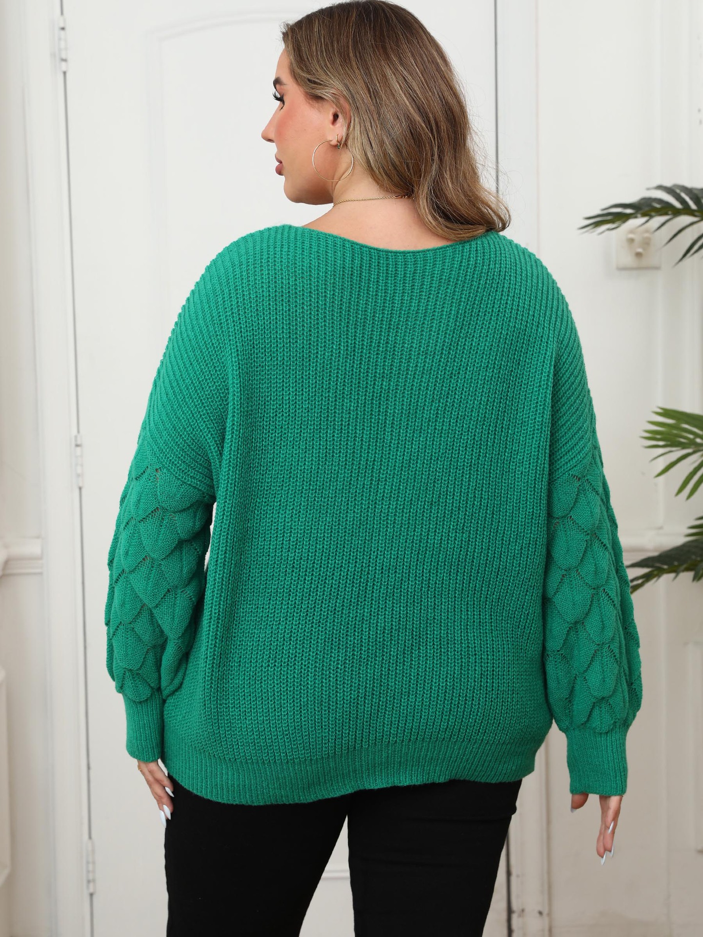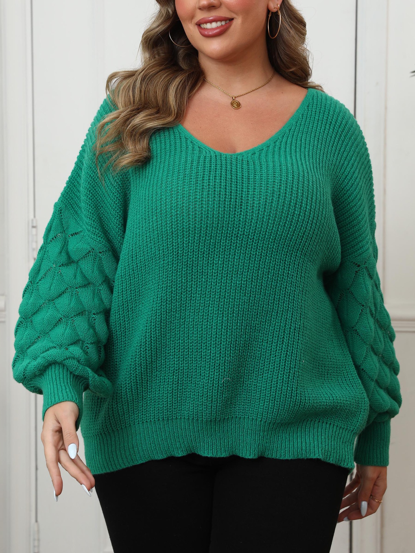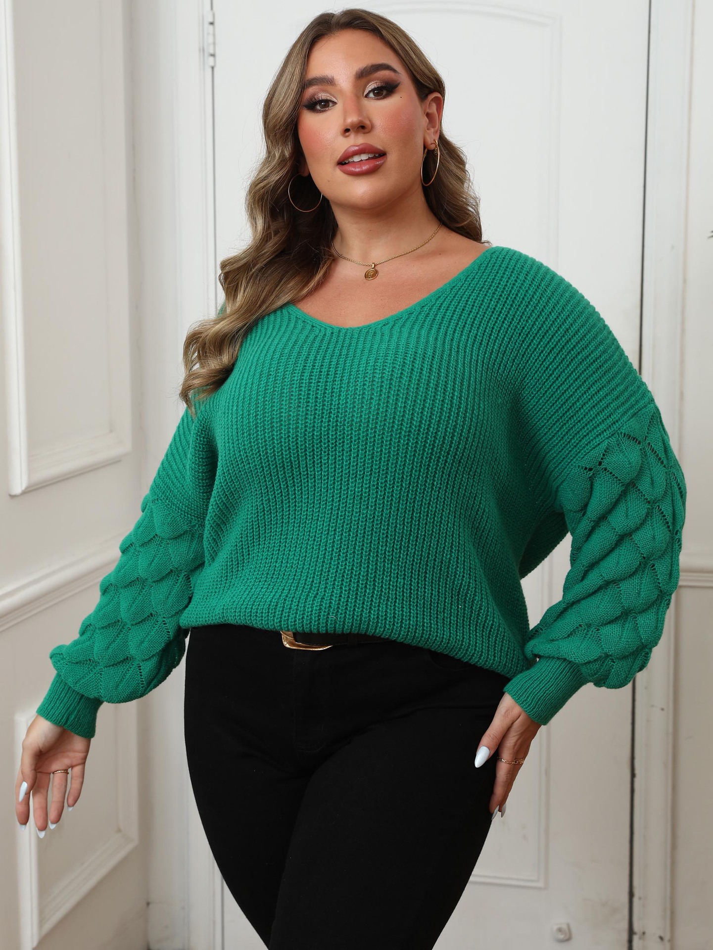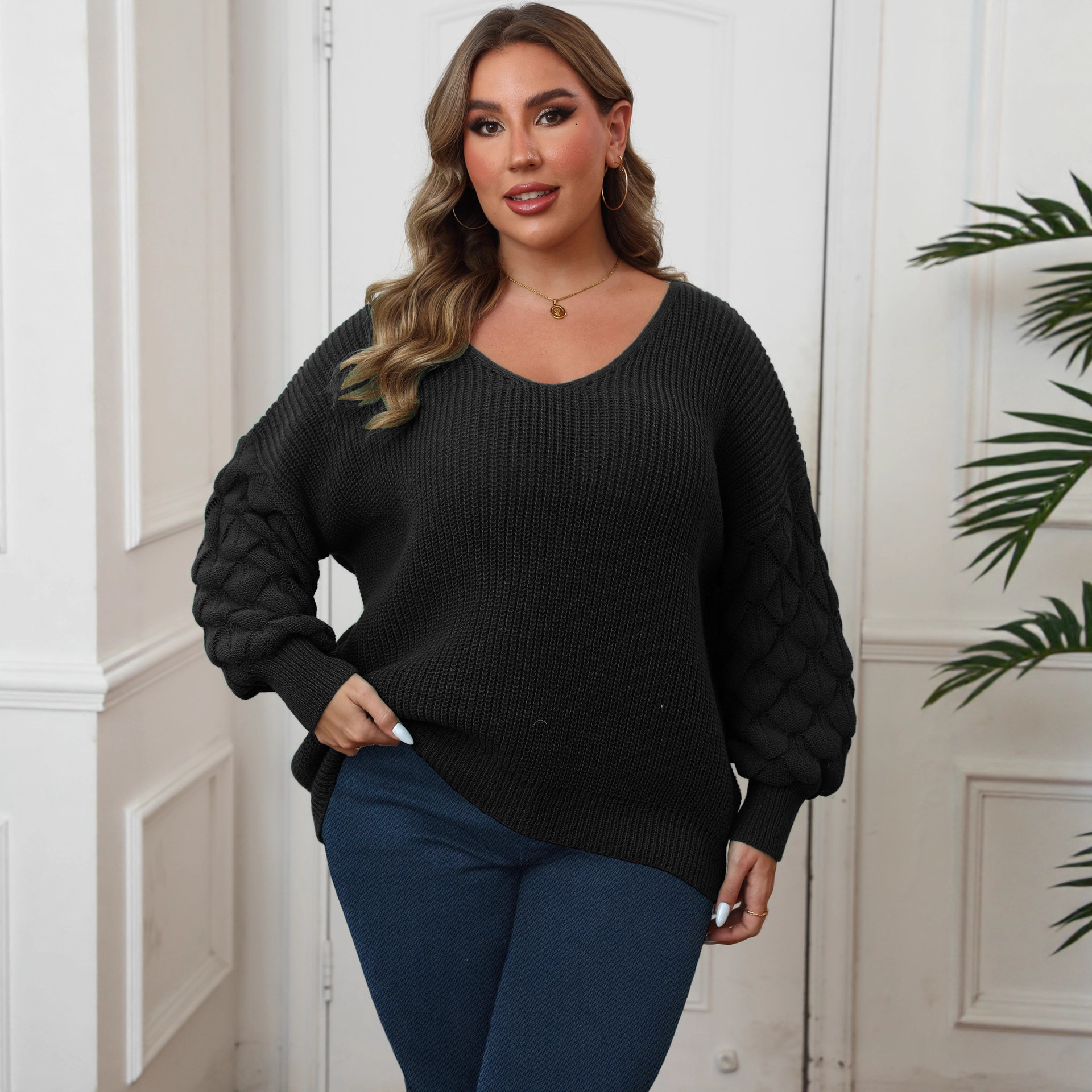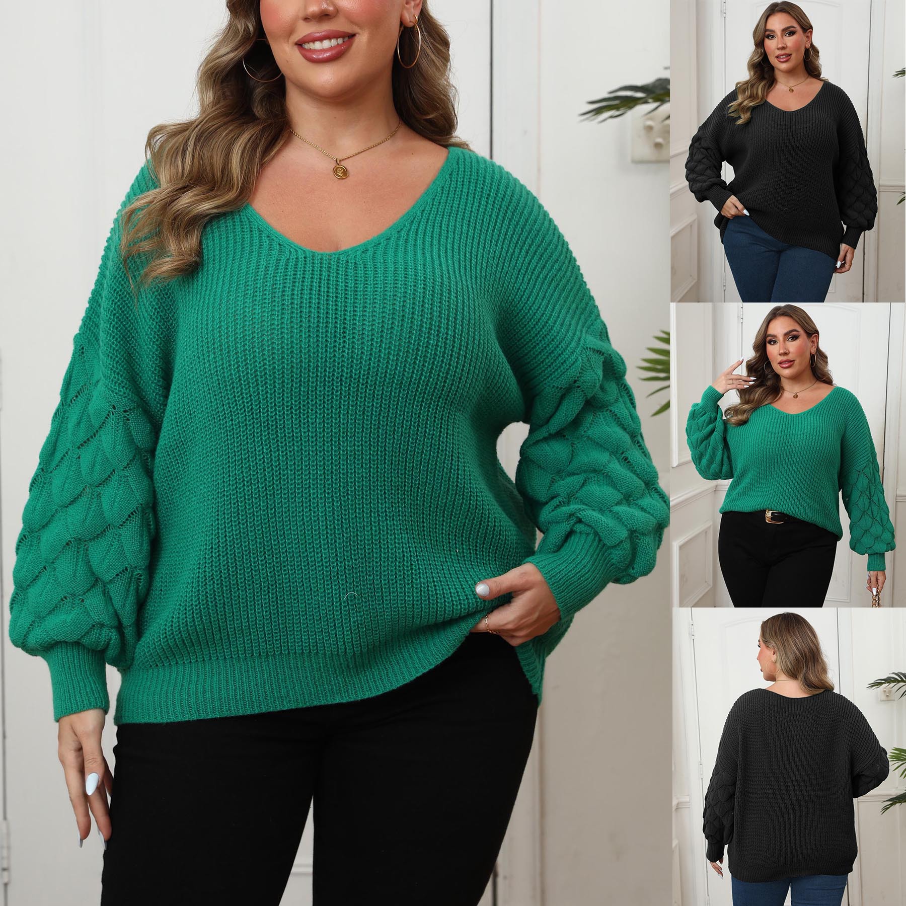 Женский свитер больших размеров, трансграничная европейская и американская женская рубашка с рукавами-ананасами и глубоким V-образным вырезом, повседневный пуловер, топ