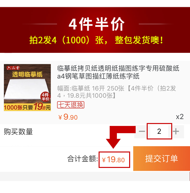 Бумага для копирования А4 250 листов [4 штуки по половинной цене (2 штуки по 4, 25,6 юаней, всего 1000 листов)]; Бумага для копирования 16 карат, 250 листов [4 штуки по половинной цене (взять 2 снимка по 4, 19,8 юаней, всего 1000 листов); Бумага для копирования А5 250 листов [4 штуки по половинной цене (взять 2 снимка по 4) всего 1000 листов]; Бумага серной кислоты А4 50 листов [4 штуки по полцены (брать 2 снимка по 4), всего 200 листов]; Бумага серной кислоты А5 50 листов [4 штуки по полцены (брать 2 снимка по 4), всего 200 листов]; Бумага серной кислоты А3 50 листов [4 штуки по полцены (брать 2 снимка по 4), всего 200 листов]