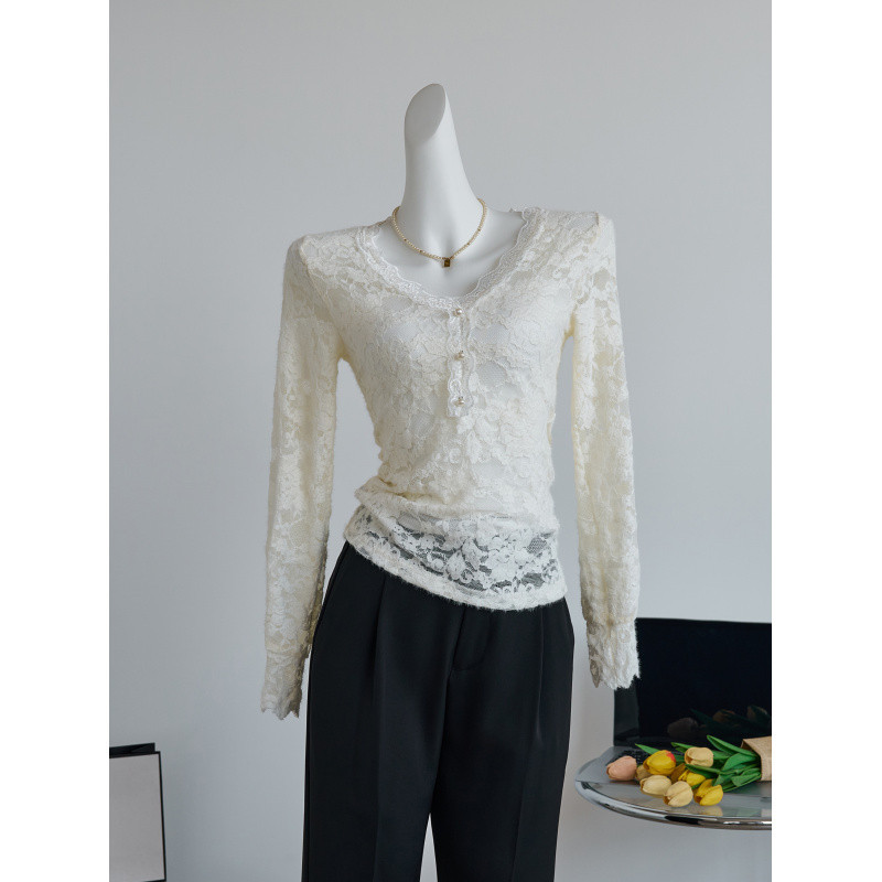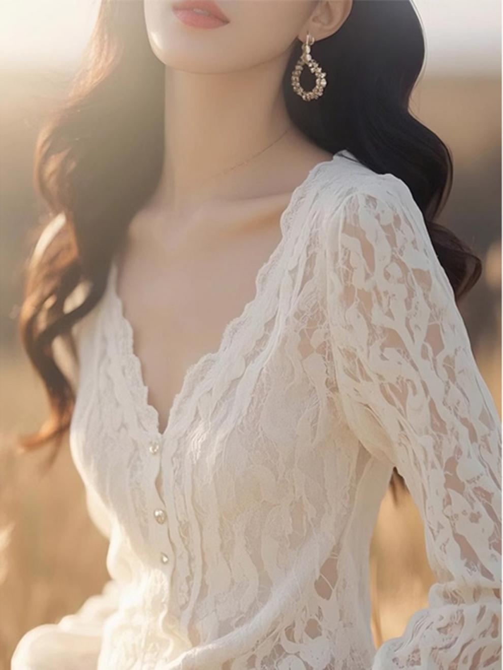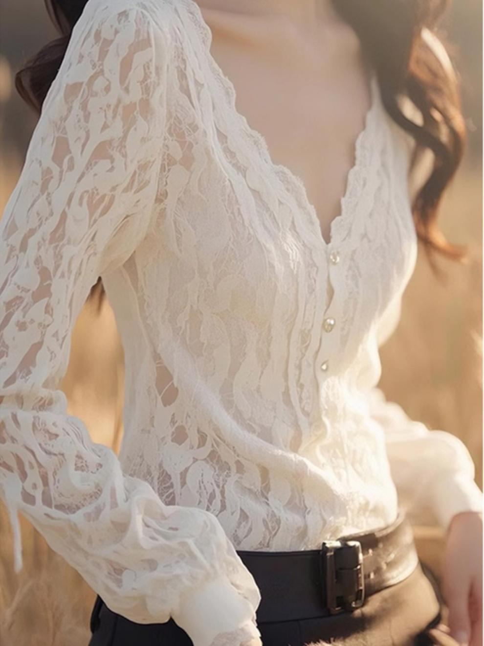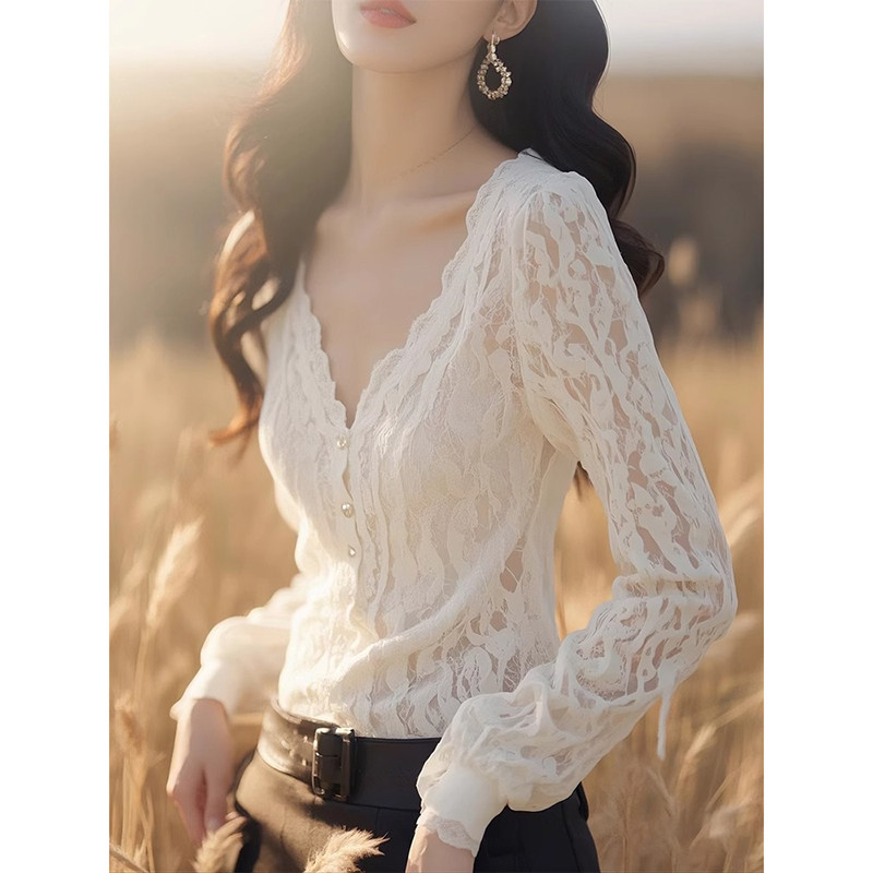 G6N весенняя рубашка во французском стиле, уникальная, шикарная, модная, крутая, доступная, роскошная, высококачественная белая кружевная рубашка с v-образным вырезом для женщин