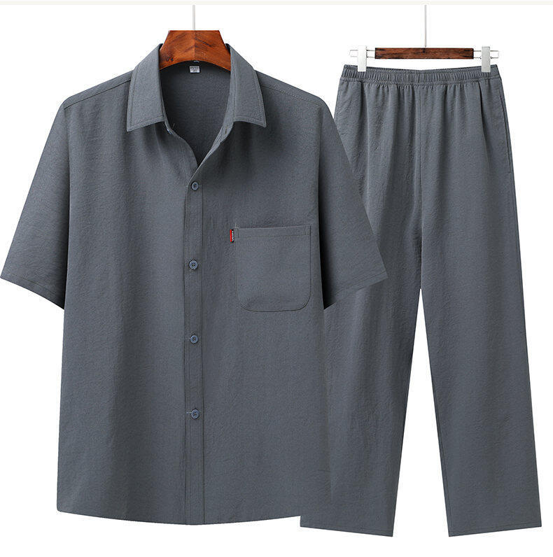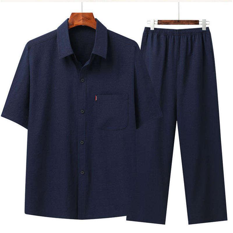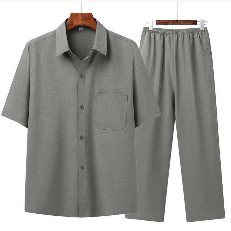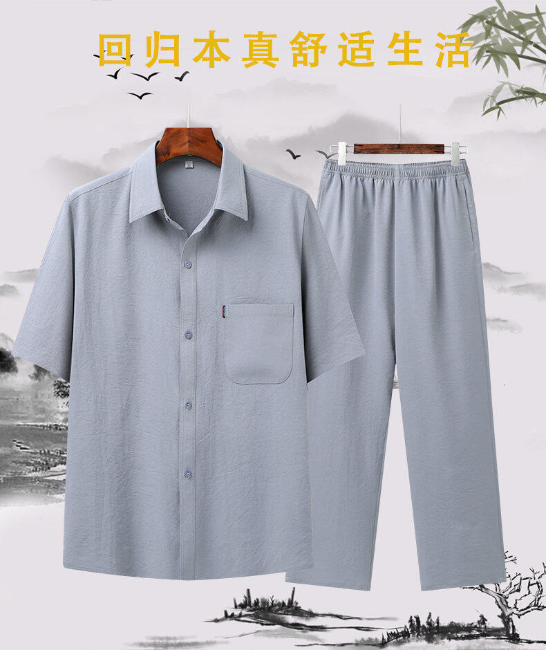 Костюм Тан в китайском стиле для летнего комплекта среднего и пожилого возраста, наряд для папы, наряд для дедушки, утренние упражнения на пуговицах в китайском стиле, элегантная однотонная вышивка.