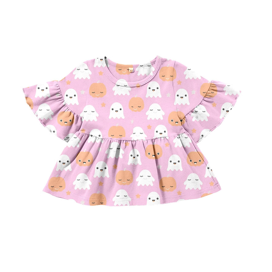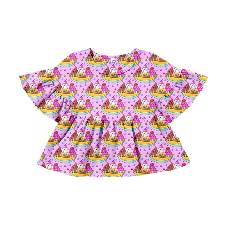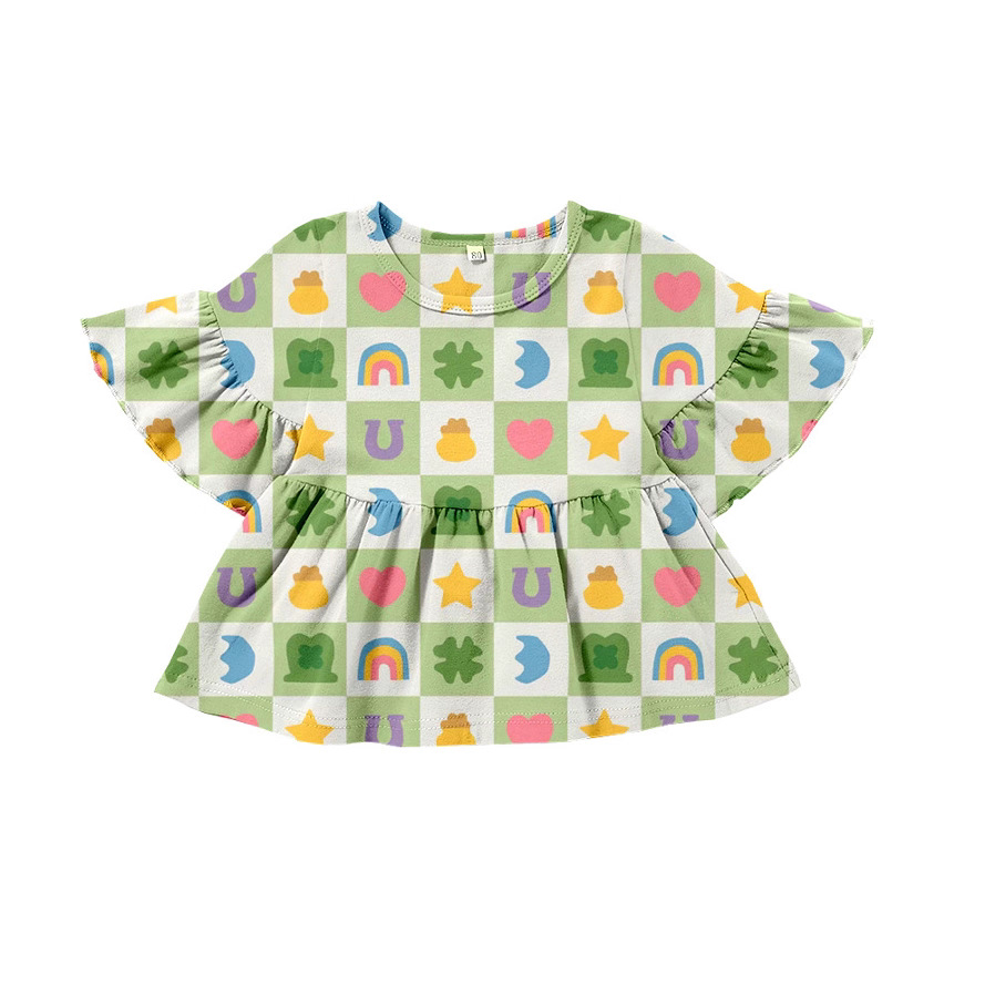 Трансграничная оптовая продажа, топ с принтом для девочек на заказ и клетчатым низом + дизайн с развевающимися рукавами, милый и свежий.