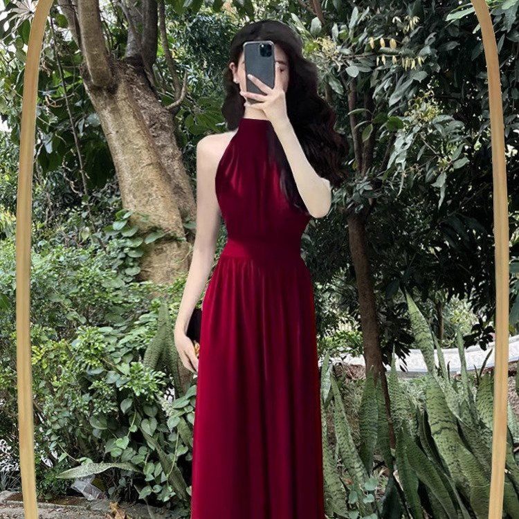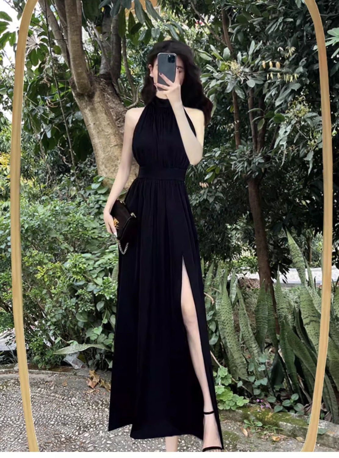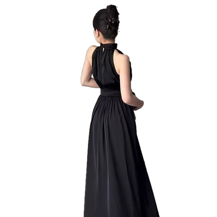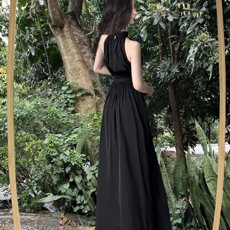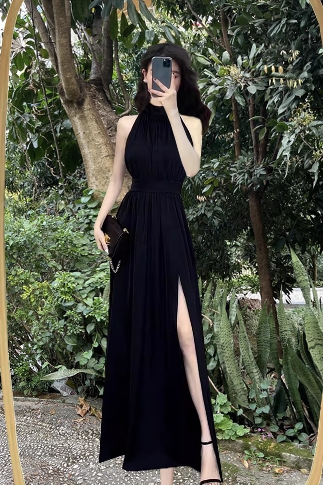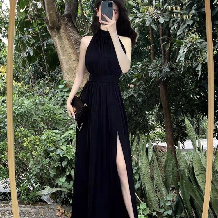 Сексуальное черное платье без рукавов с воротником на шее для женщин, лето 2025, новый стиль, длинная юбка во французском стиле с разрезом на талии