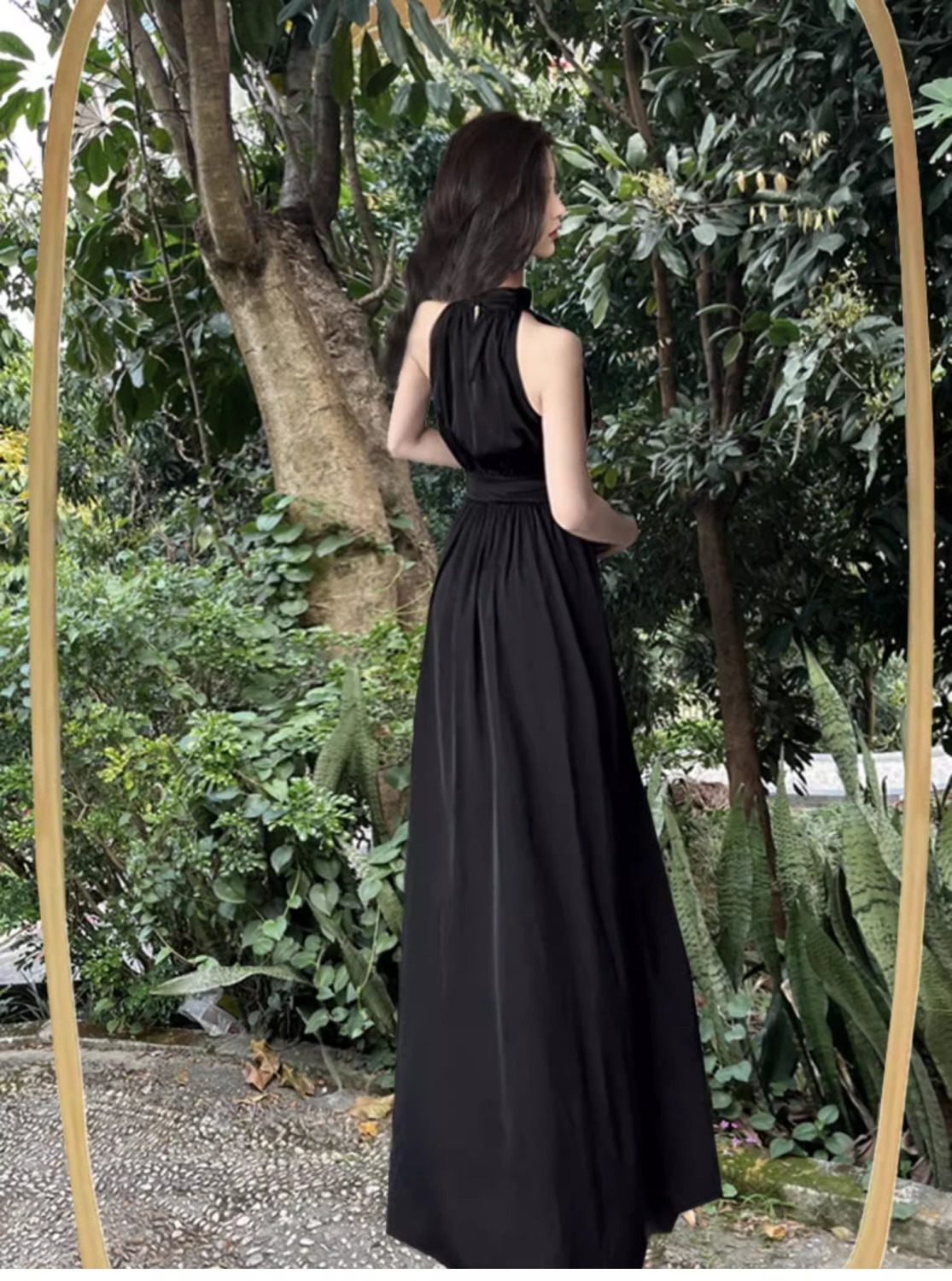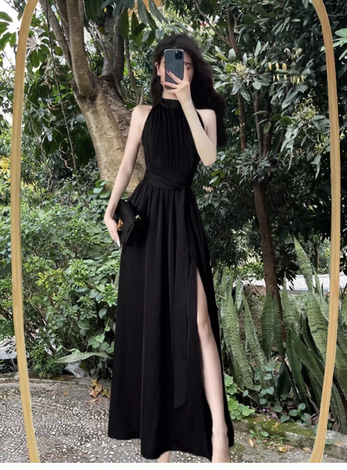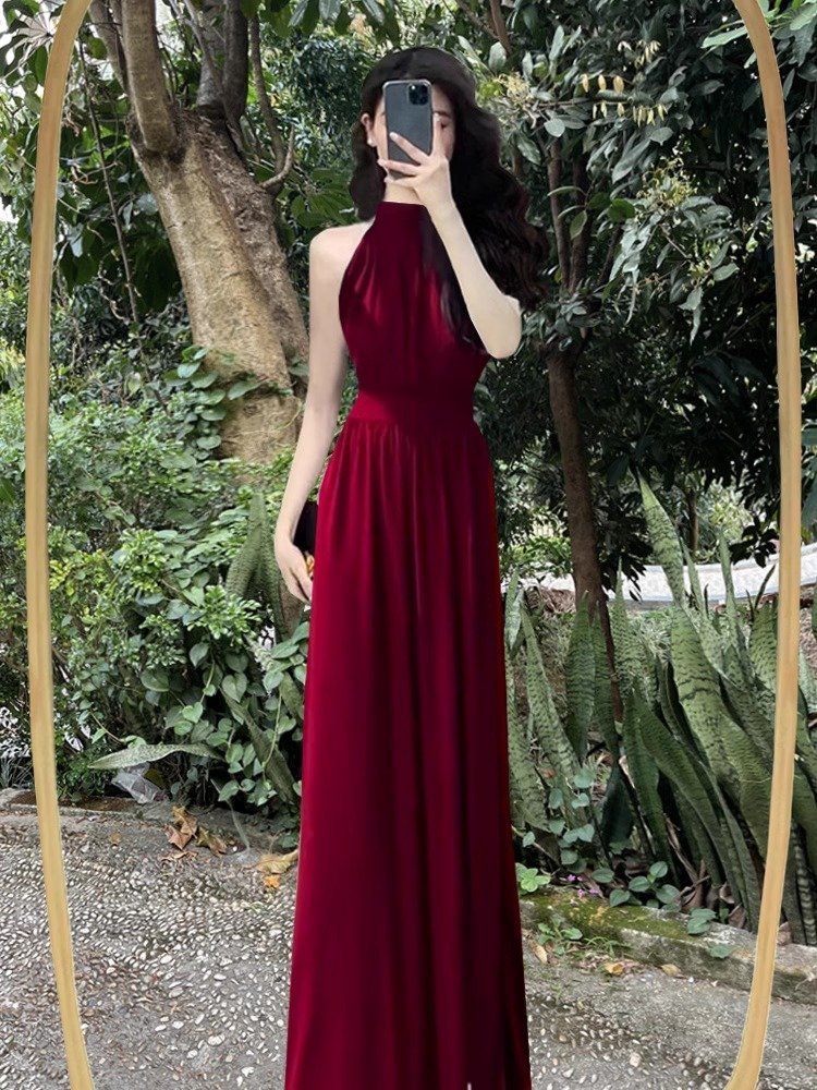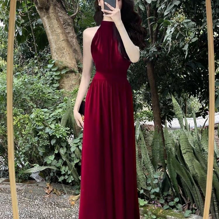 Сексуальное черное платье без рукавов с воротником на шее для женщин, лето 2025, новый стиль, длинная юбка во французском стиле с разрезом на талии