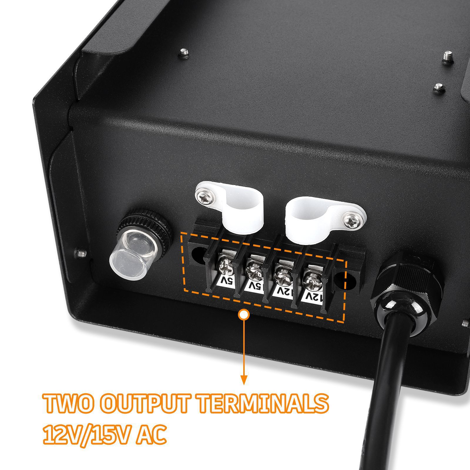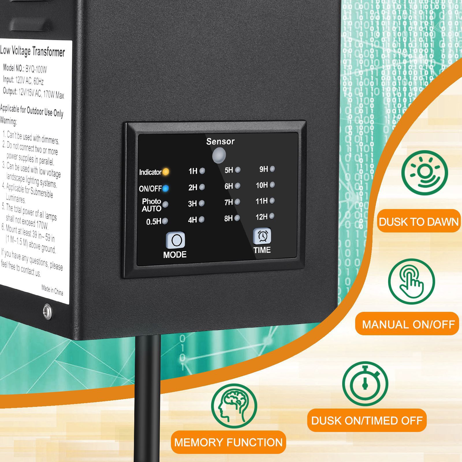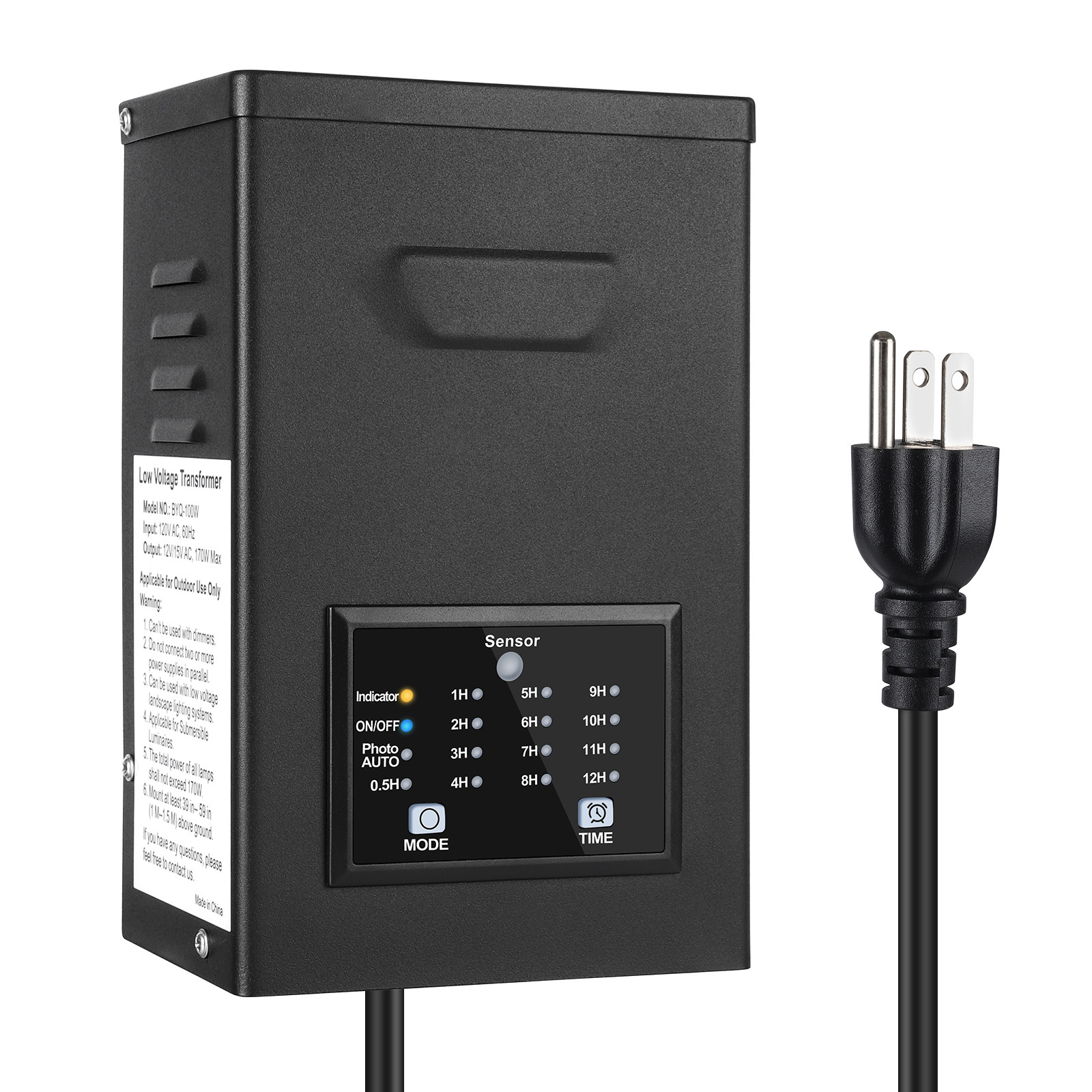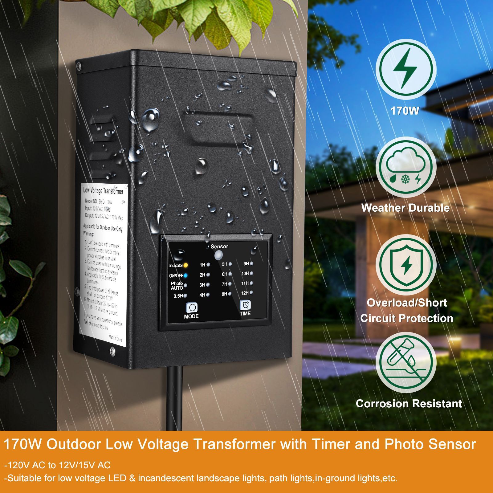 低压景观变压器,户外耐候 170W 变压器,带计时器和光电管传感器,交流 120V 至交流 12V 15V,适用于卤素灯和 LED 照明、聚光灯、走道灯