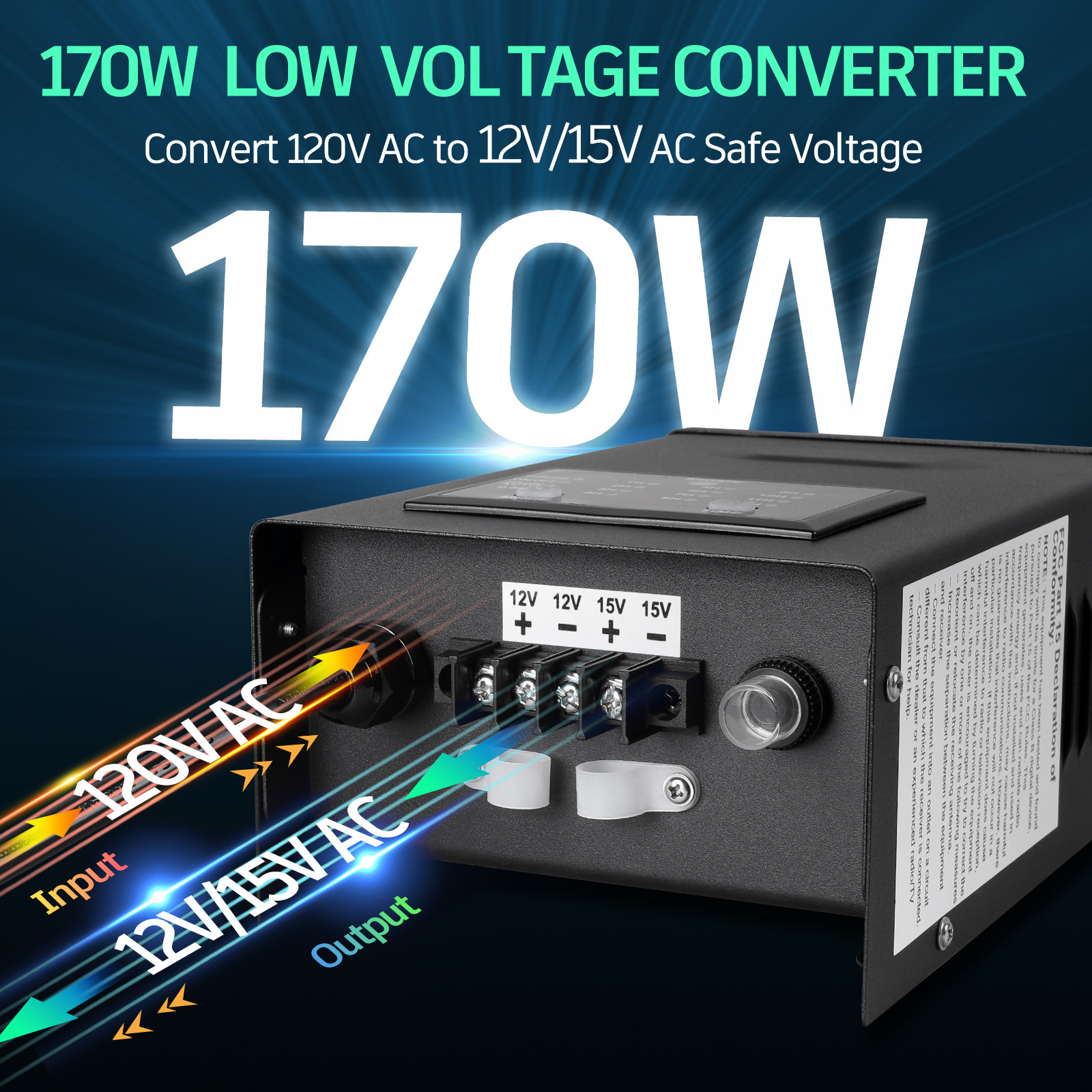 Низковольтный трансформатор 170 Вт, инвертор для уличного ландшафтного освещения, 120 В переменного тока на 12/15 В переменного тока, специальный водонепроницаемый однофазный.