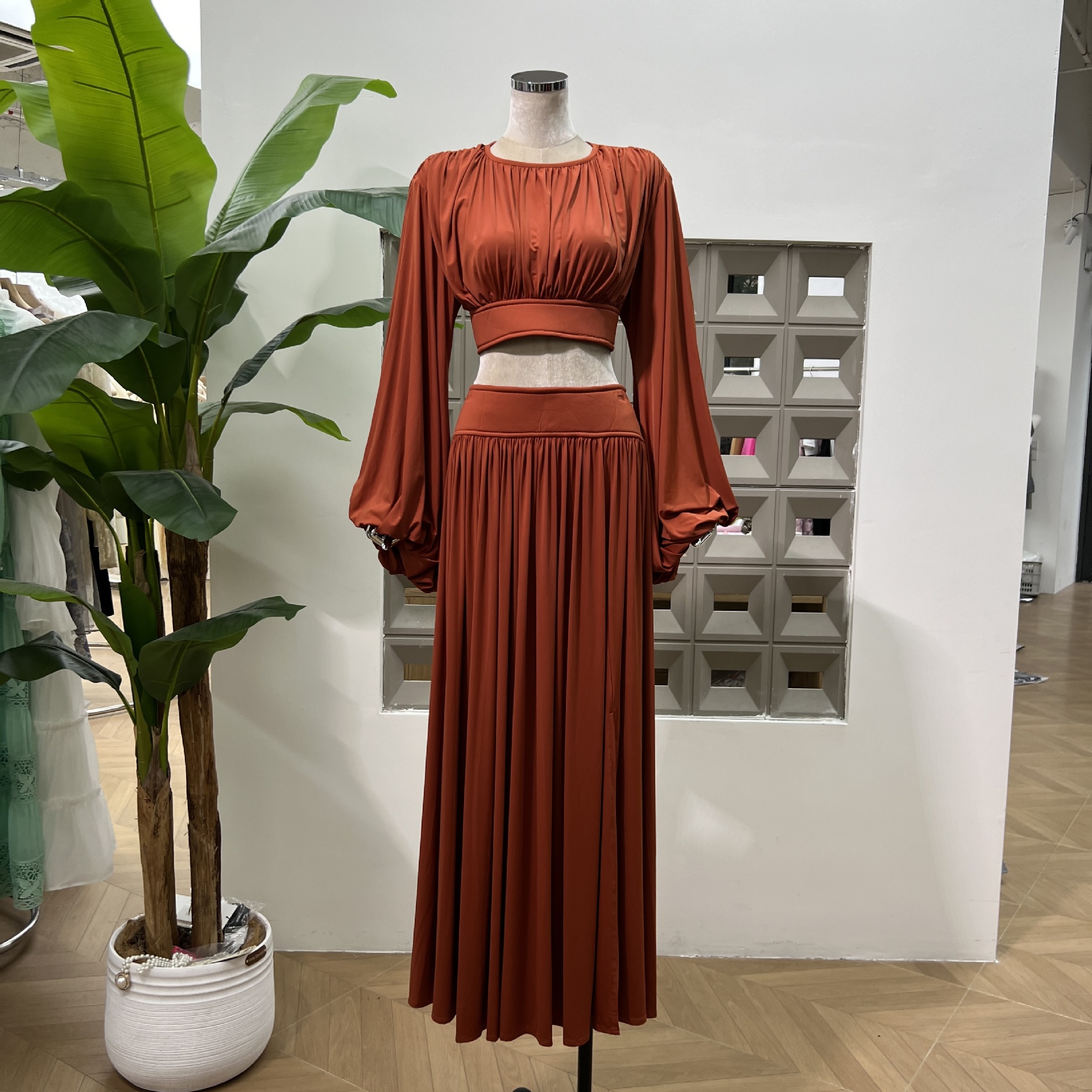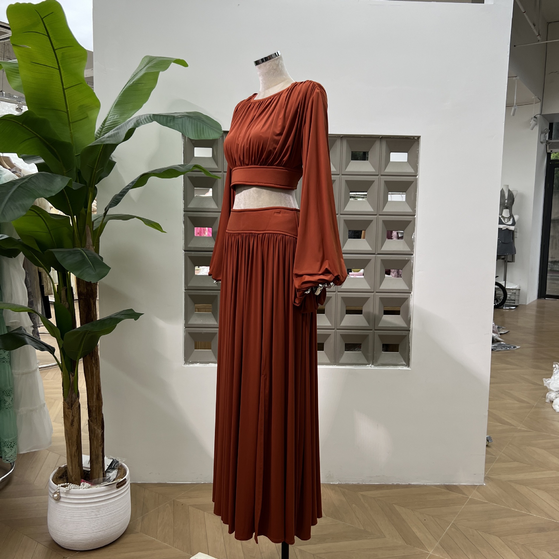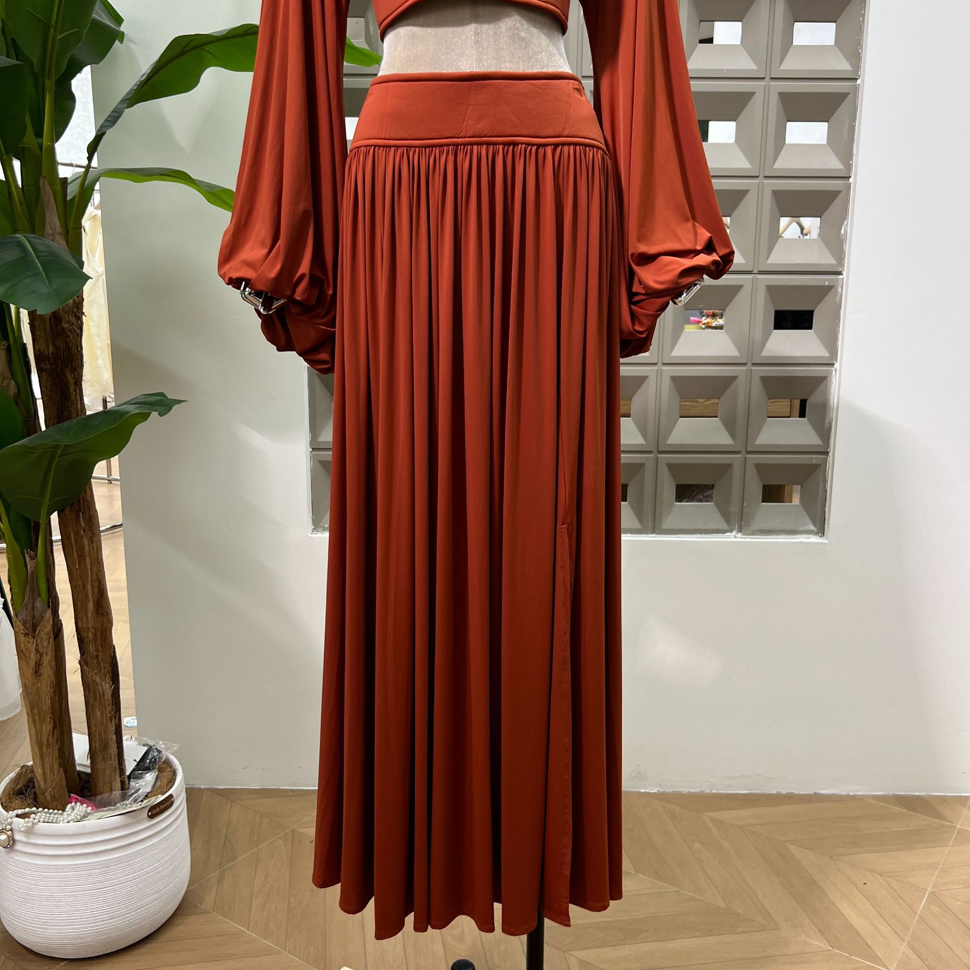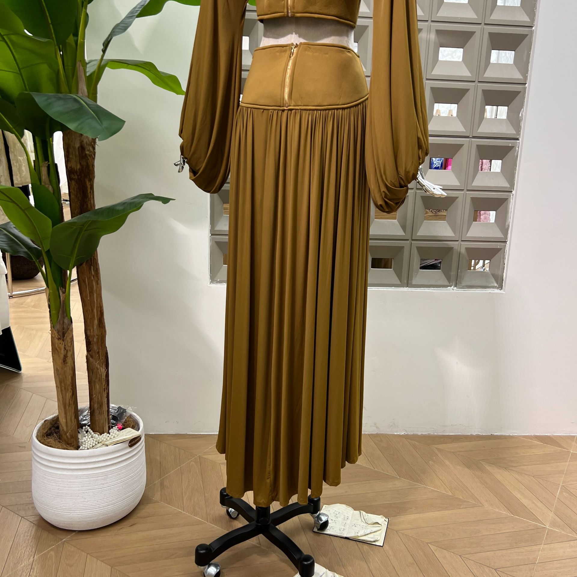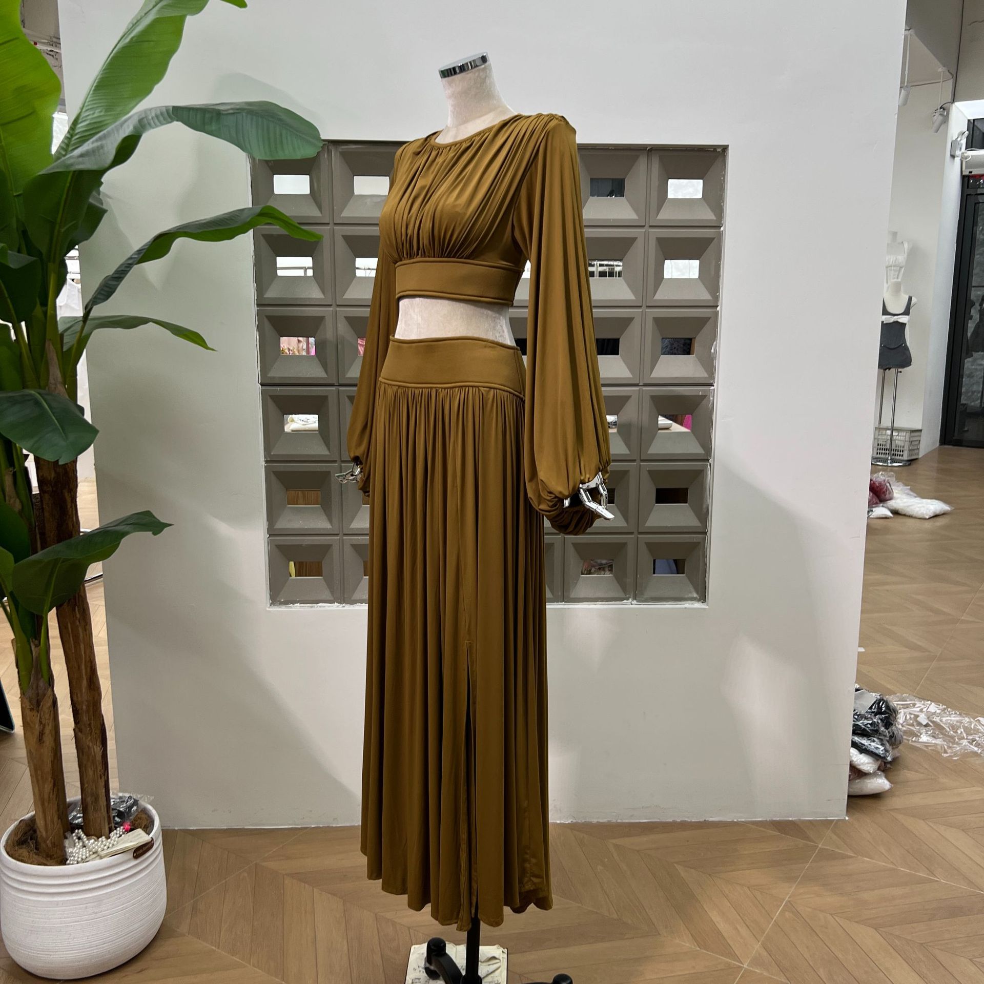 Женский летний комплект 2025 года от Amazon: мягкий топ с длинными рукавами и укороченный топ + юбка с длинным разрезом.