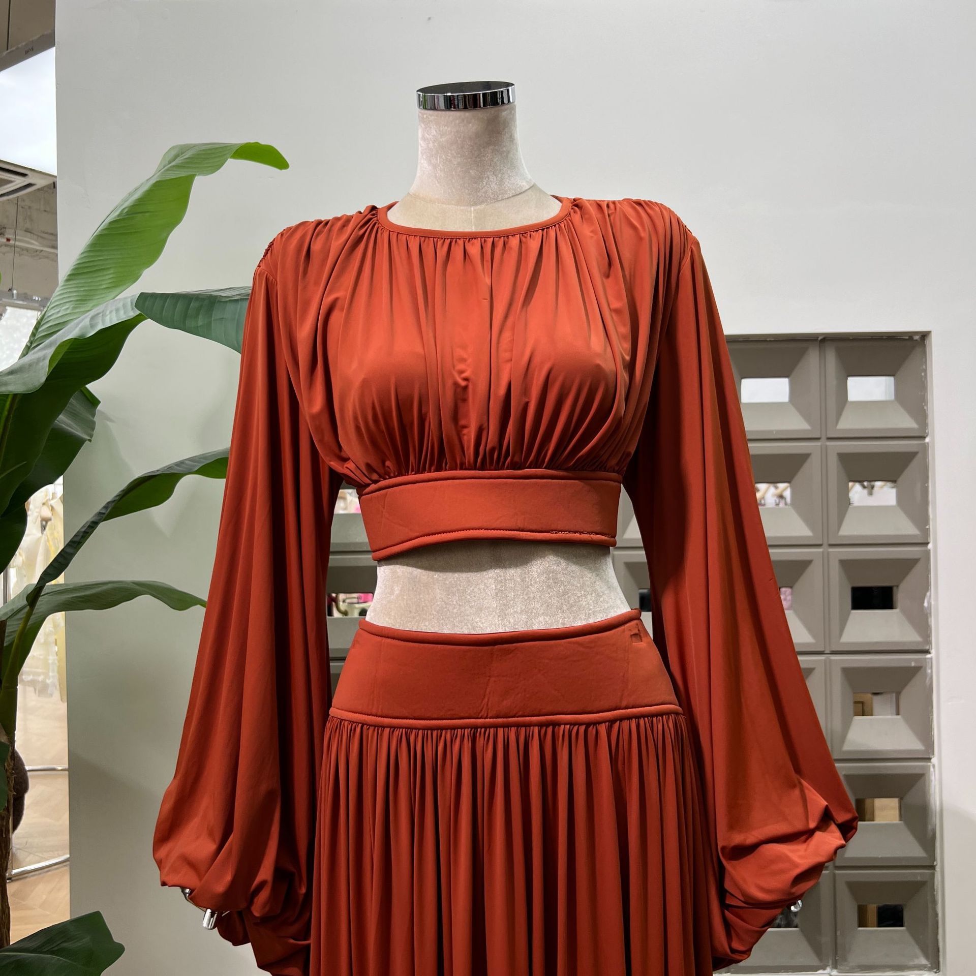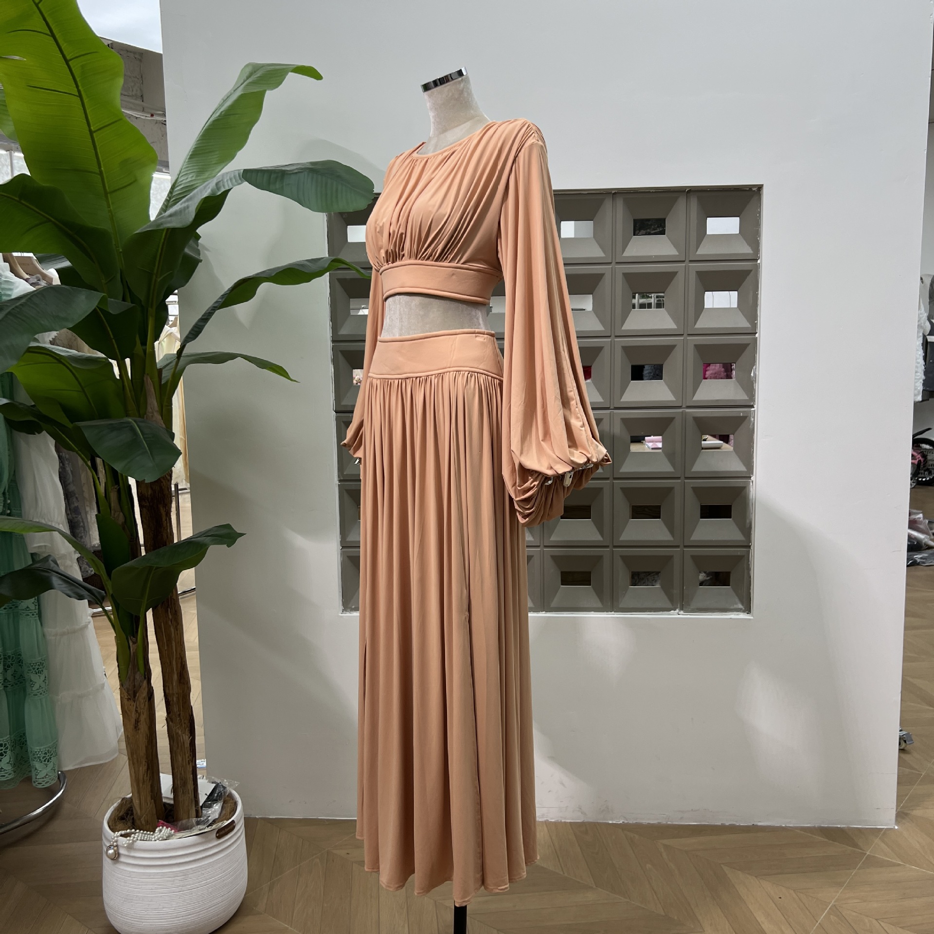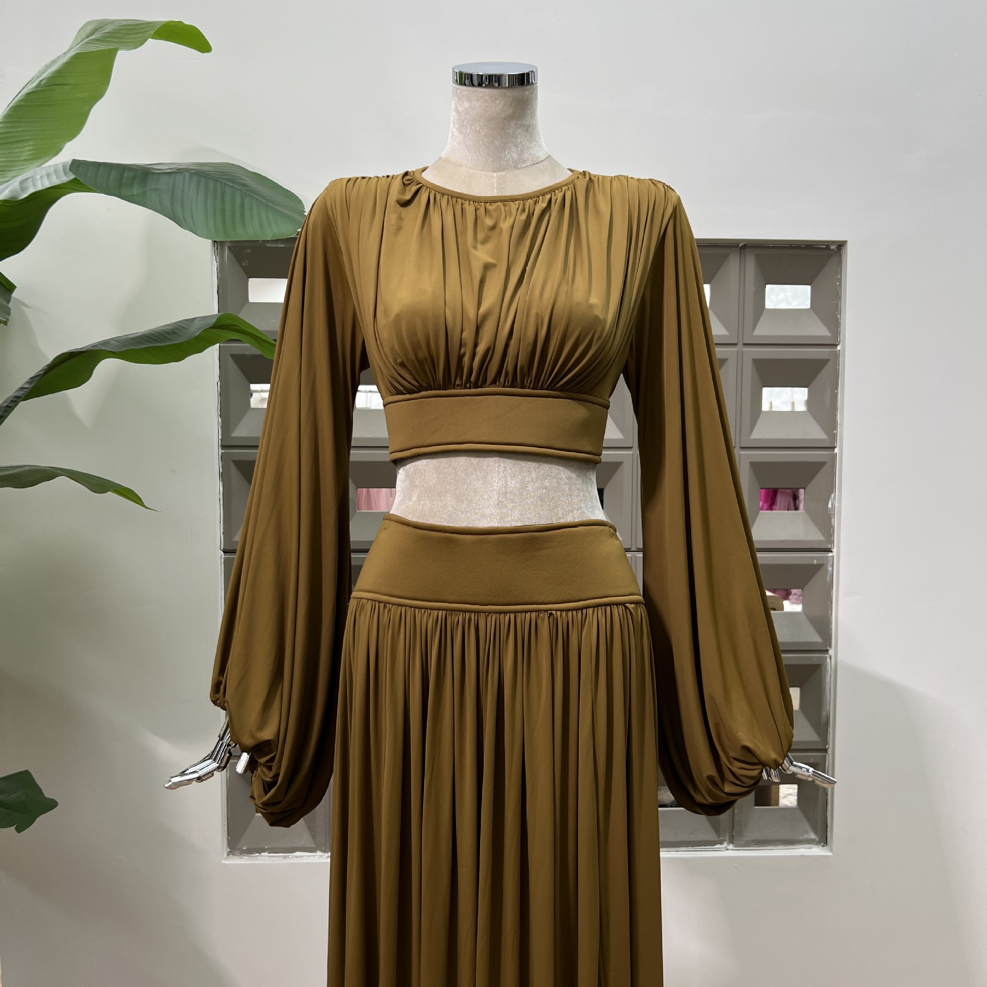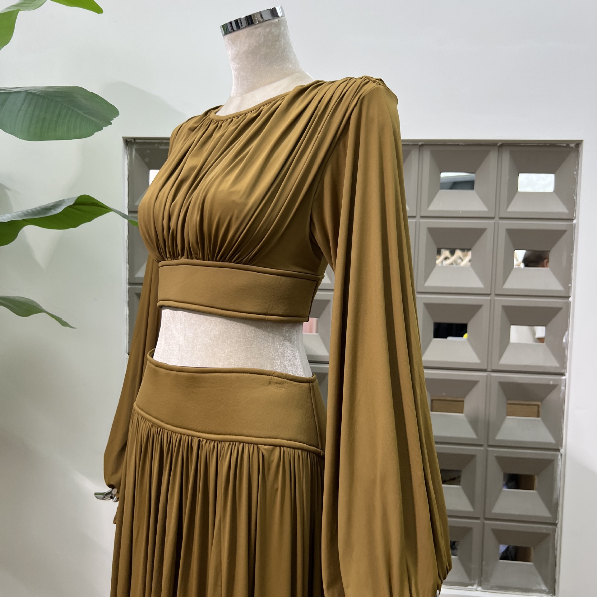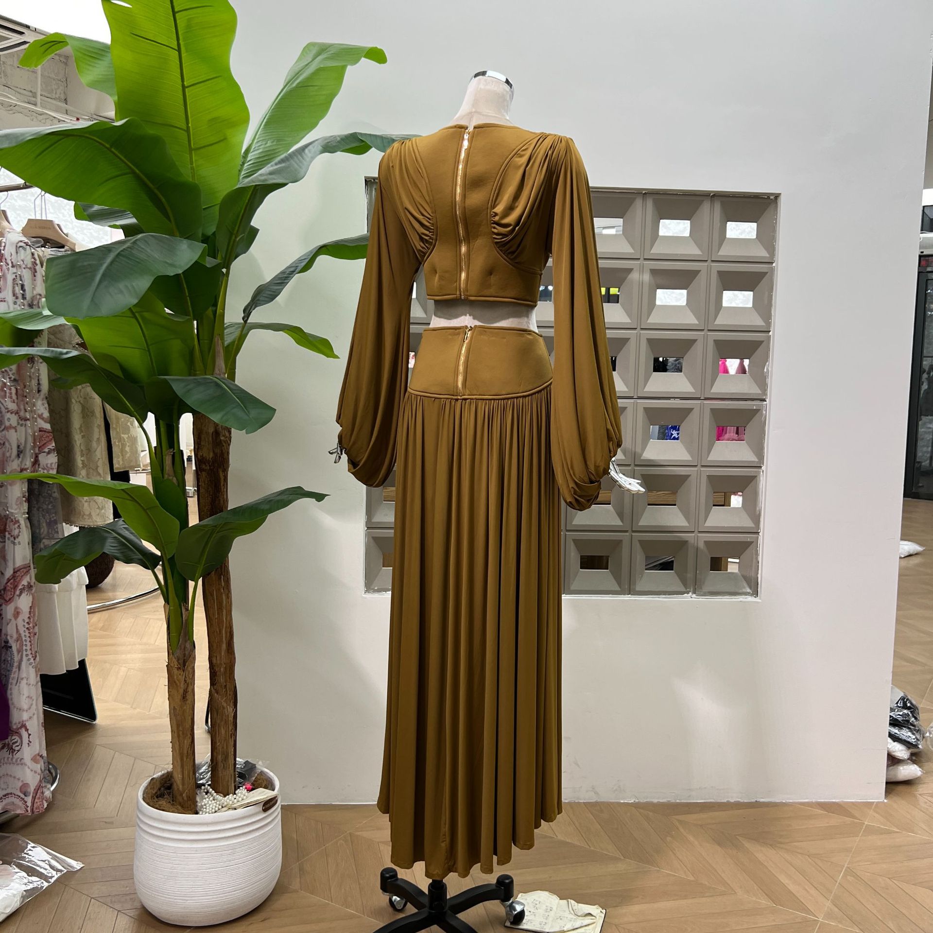 Женский летний комплект 2025 года от Amazon: мягкий топ с длинными рукавами и укороченный топ + юбка с длинным разрезом.