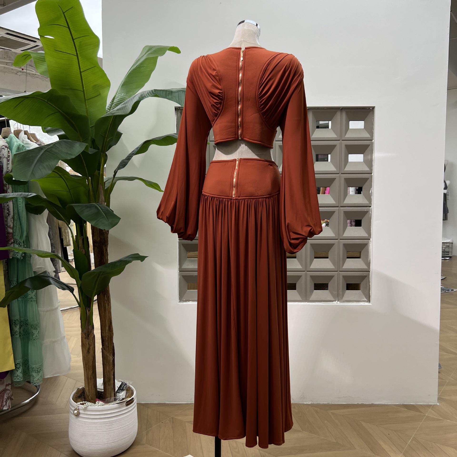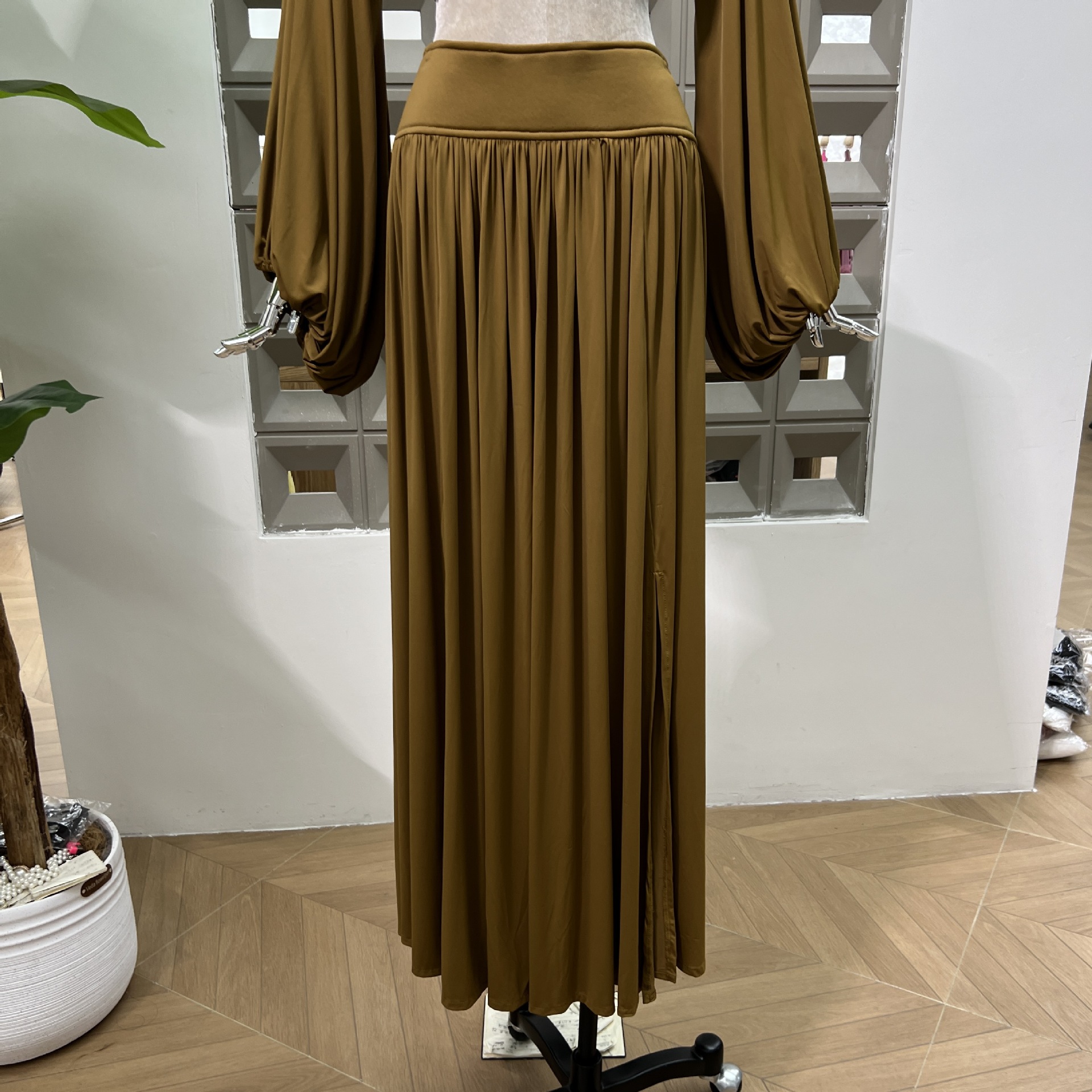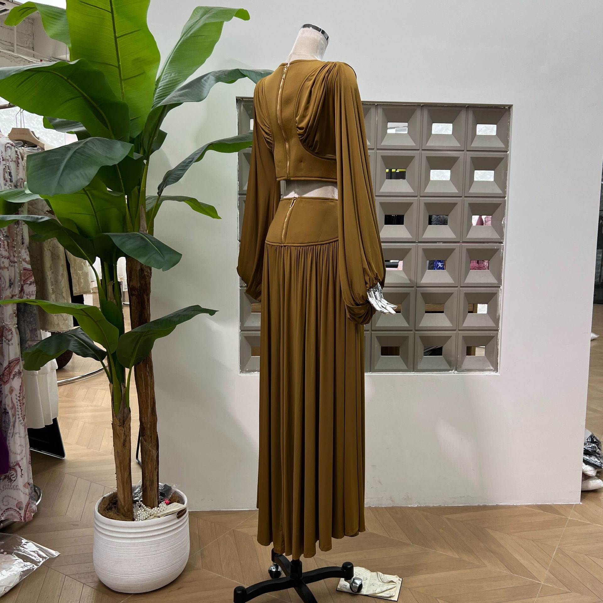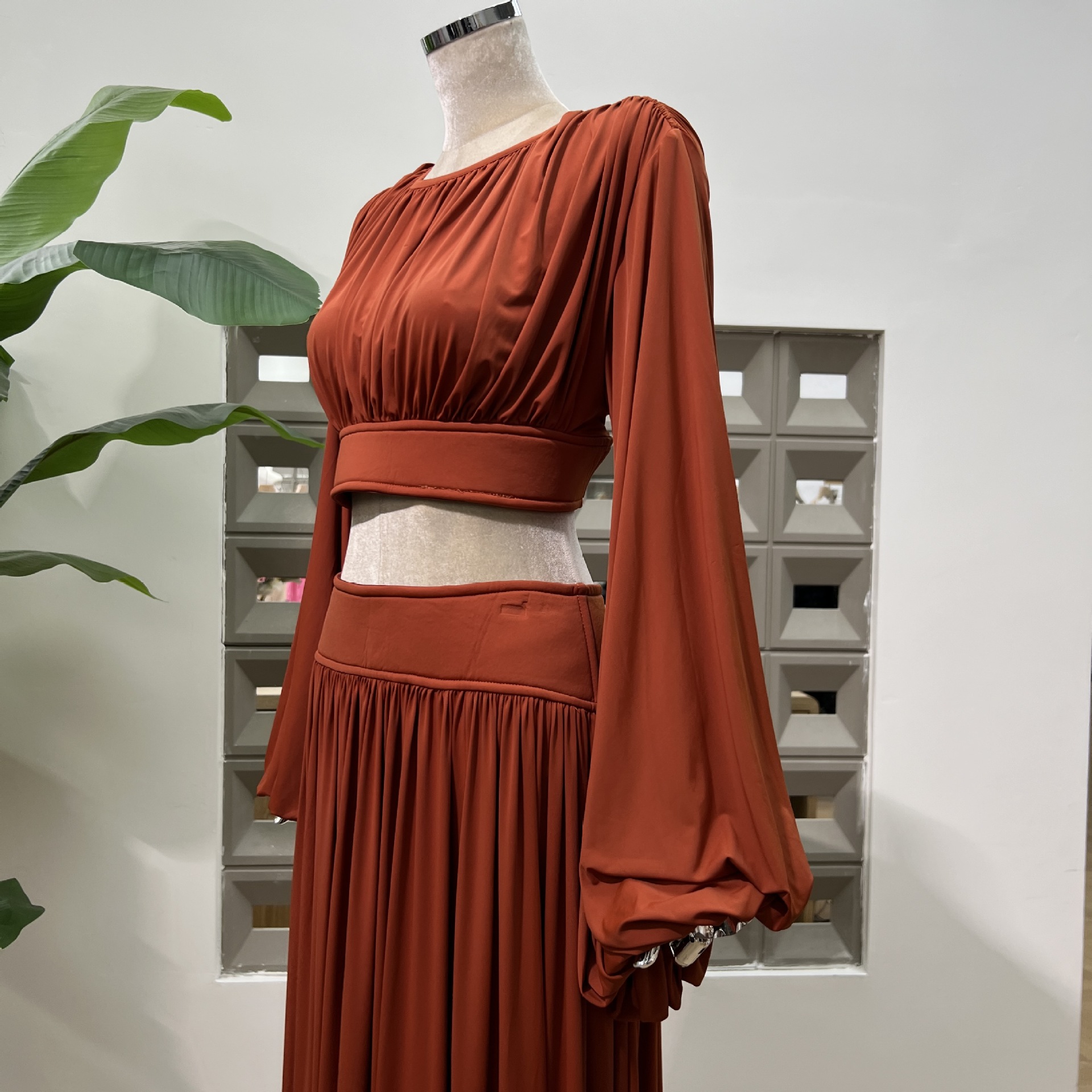 Женский летний комплект 2025 года от Amazon: мягкий топ с длинными рукавами и укороченный топ + юбка с длинным разрезом.