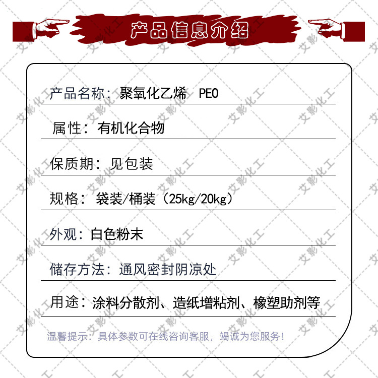 Полиэтиленовый оксид (PEO) — диспергатор для производства бумаги, добавка для утолщения и регулирования вязкости покрытий.