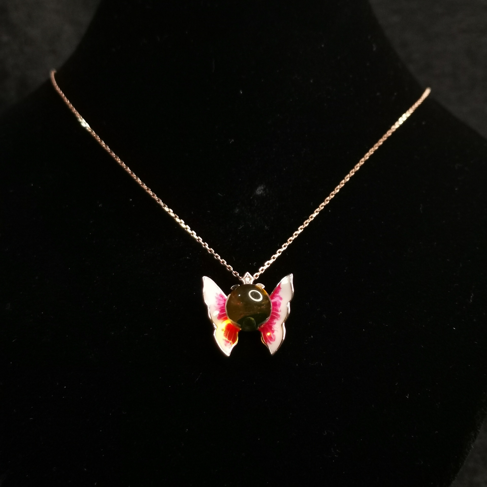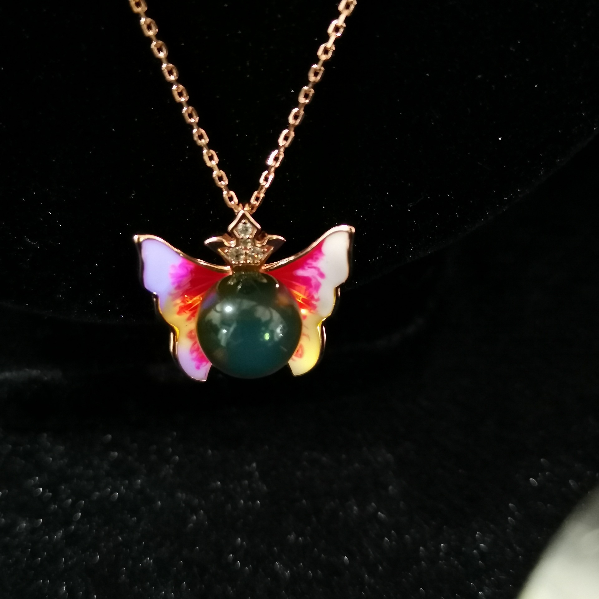 这款5A净水无杂蓝珀琅彩项链,珀体澄澈如镜,自然光下泛淡雅金,强光透迷人蓝荧光。融合琅彩工艺,色彩明快绚丽。链身精致,蓝珀与琅彩相映成趣,佩戴显优雅贵气,兼具装饰与收藏价值,是品味之选。