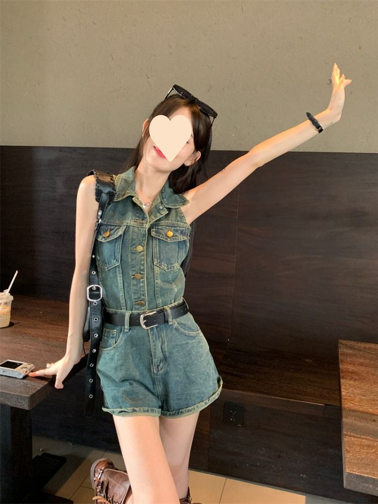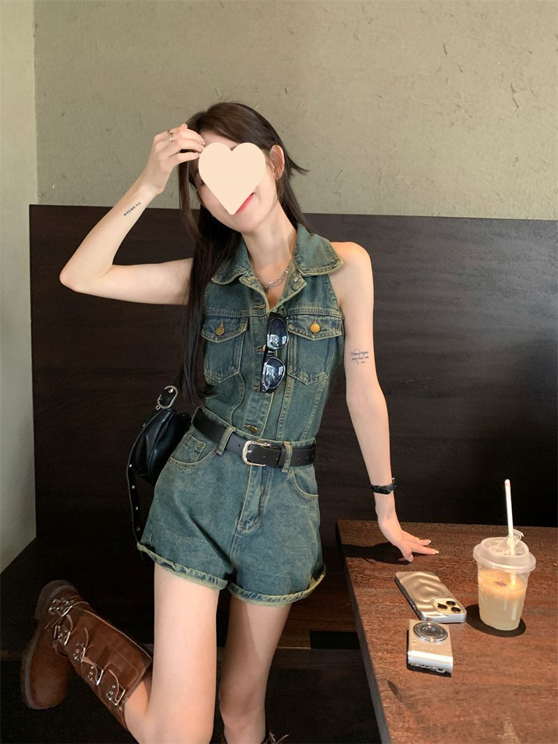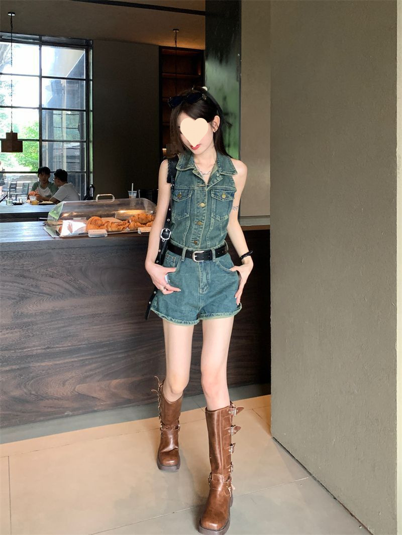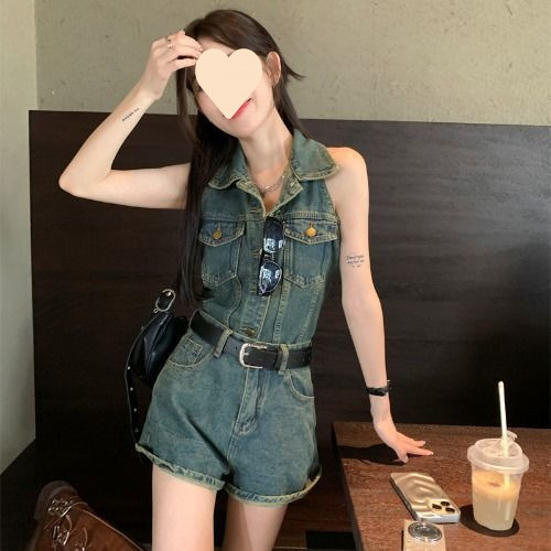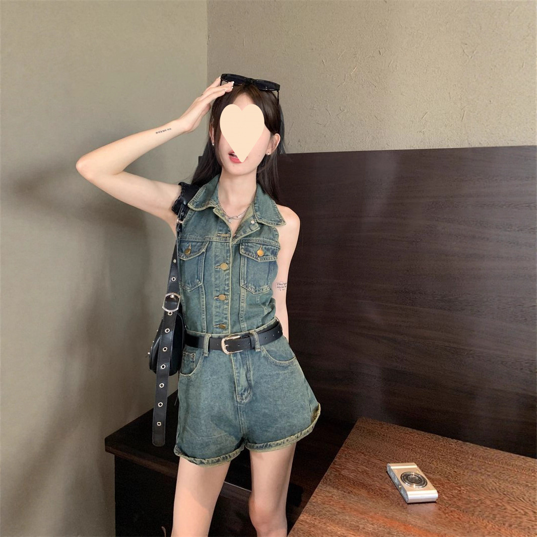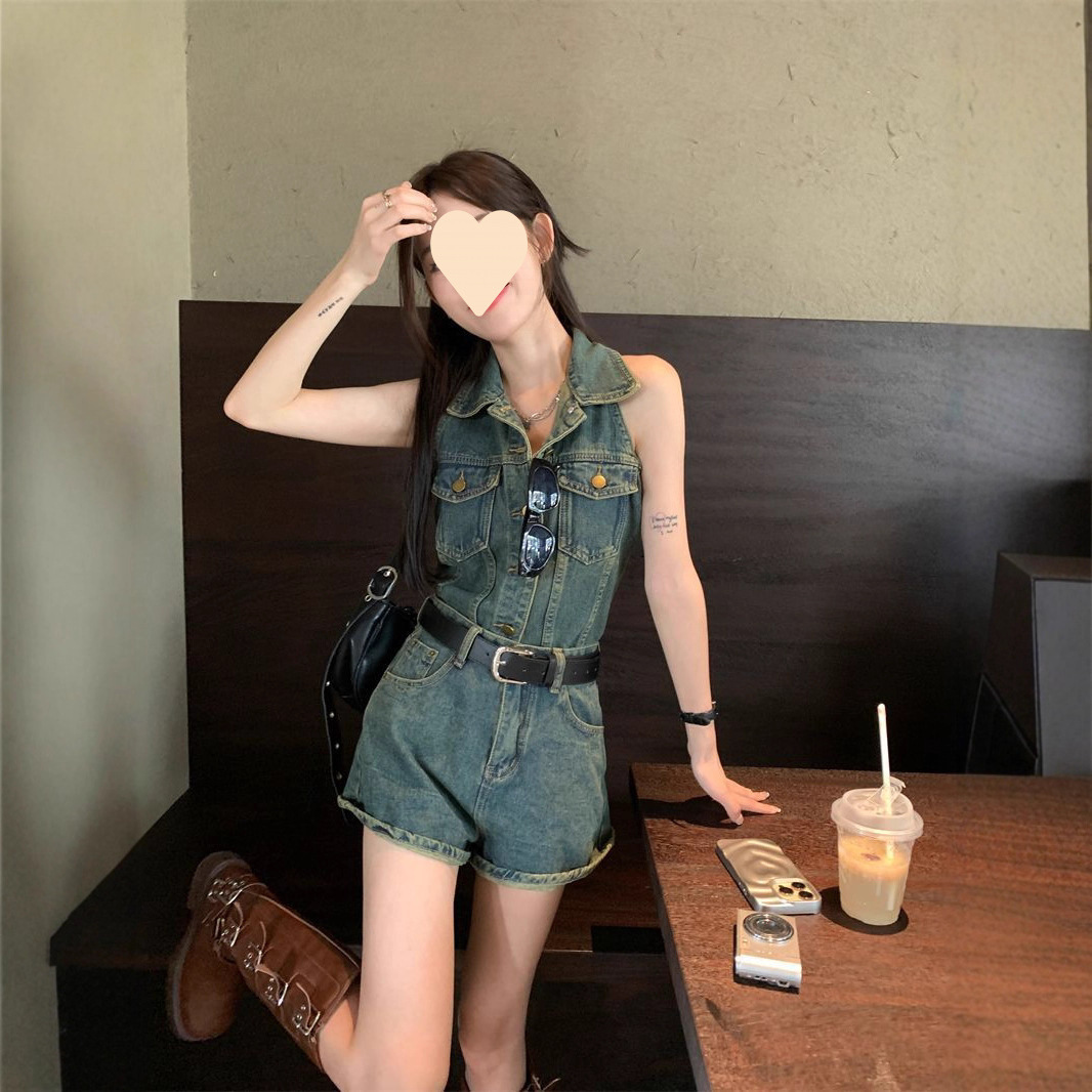 Летний ретро-комплект из денима с эффектом потертости: топ-халтер без рукавов и шорты с высокой талией, женский новый нишевый стиль 2025