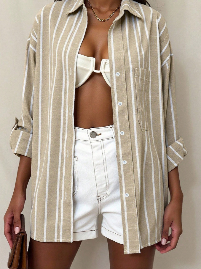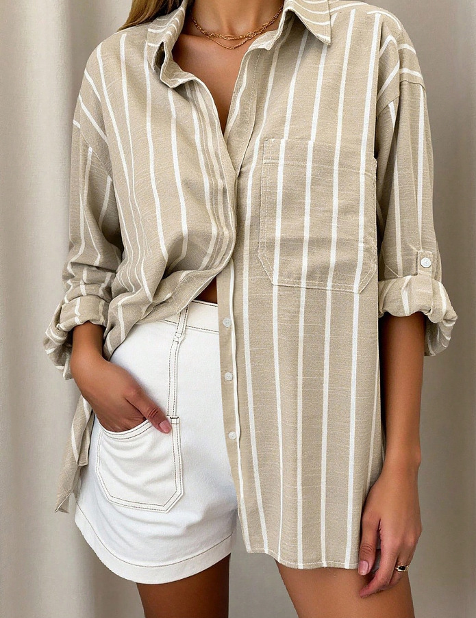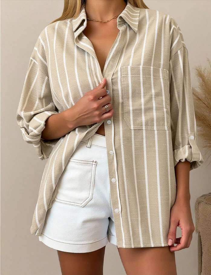 2025 новая летняя стильная французская рубашка в полоску в пригородном стиле, женская рубашка цвета хаки со средним рукавом, модный и универсальный топ