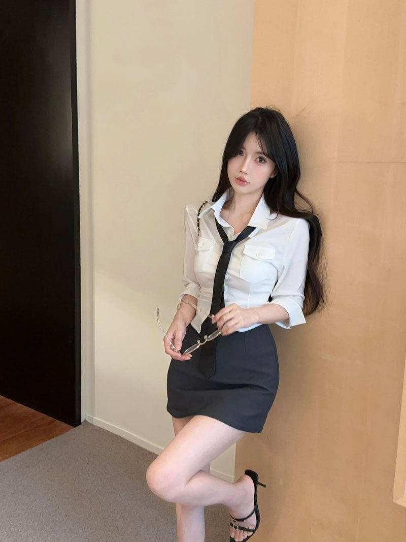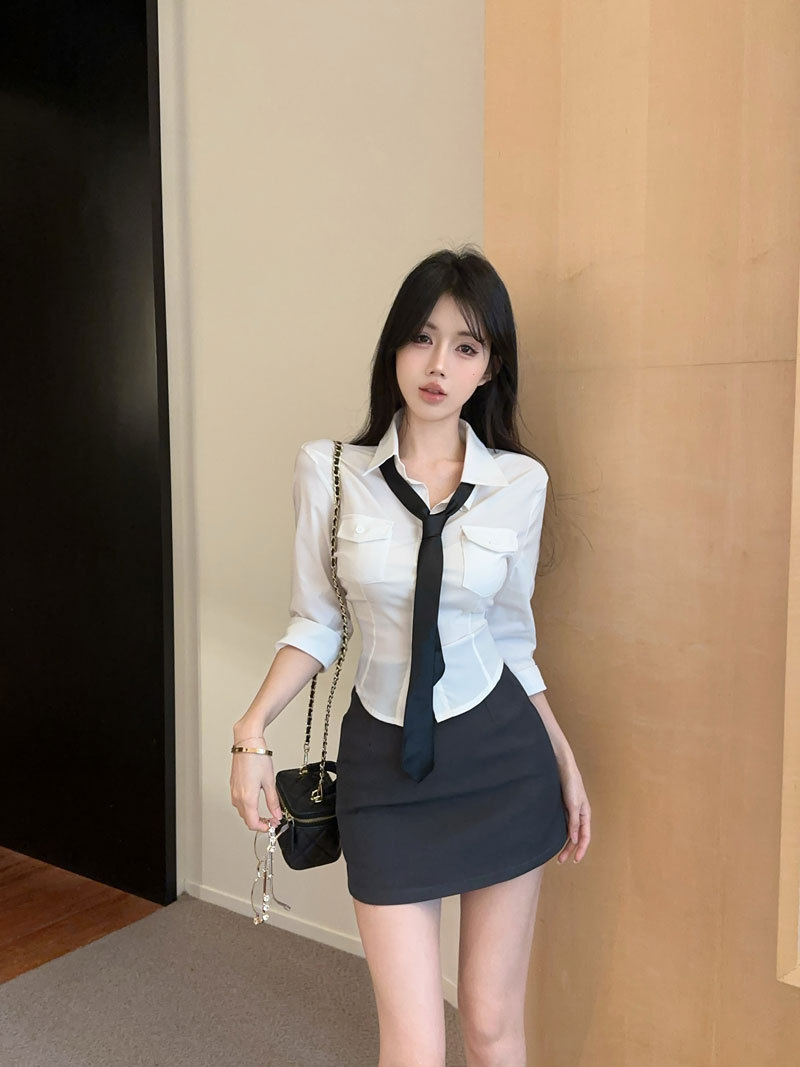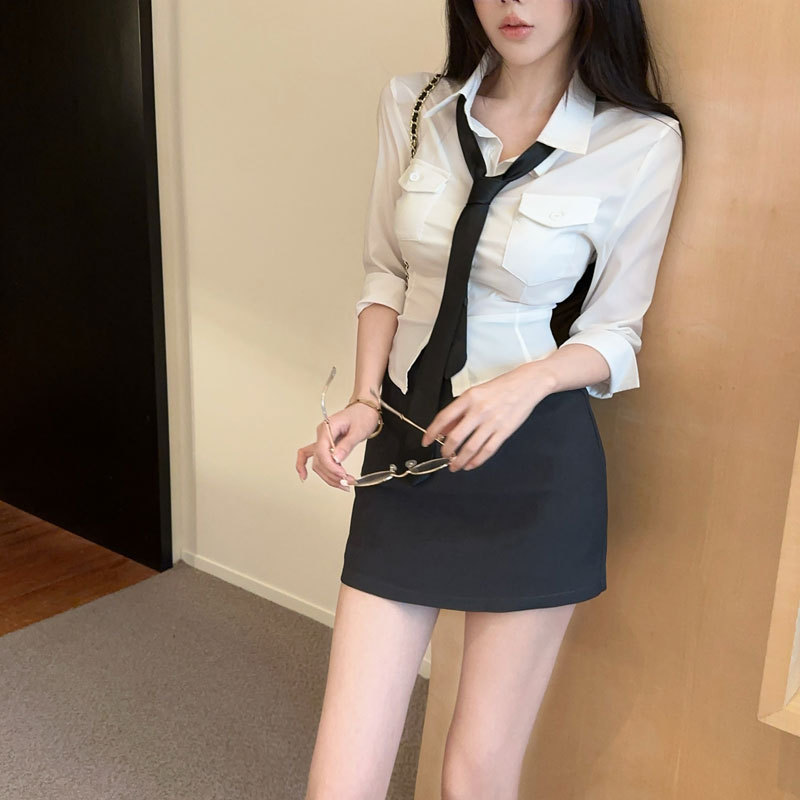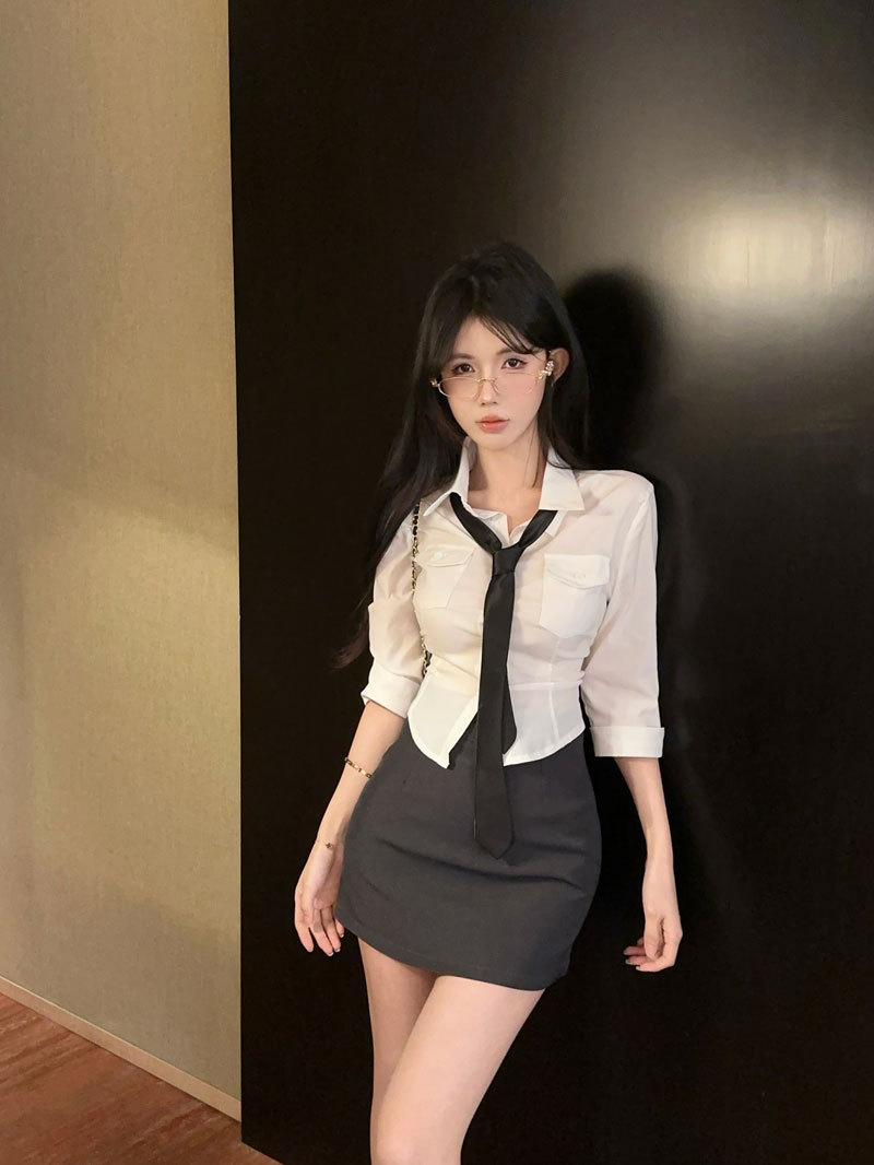 Облегающая рубашка в миниатюрном стиле преппи, топ с средними рукавами, женская облегающая короткая юбка с высокой талией, модный модный наряд