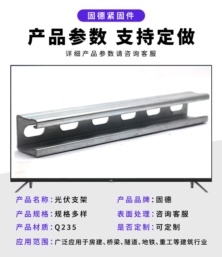 Фотоэлектрический кронштейн; 41*41*1,8 цинк алюминий магний; 41*41*2 цинк алюминий магний; 41*52*2 цинк алюминий магний; 41*52*2,5 цинк алюминий магний; 41*41*1,8 горячеоцинкованное покрытие; 41*41*2 оцинкованный горячим способом; 41*52*2 оцинкованное горячее; 41*52*2,5, оцинкованное горячее; сторона среднего давления; Треугольный разъем; Фотоэлектрическая нажимная пластина; Пластиковая барашковая гайка; Дополнительные характеристики поддерживают настройку.