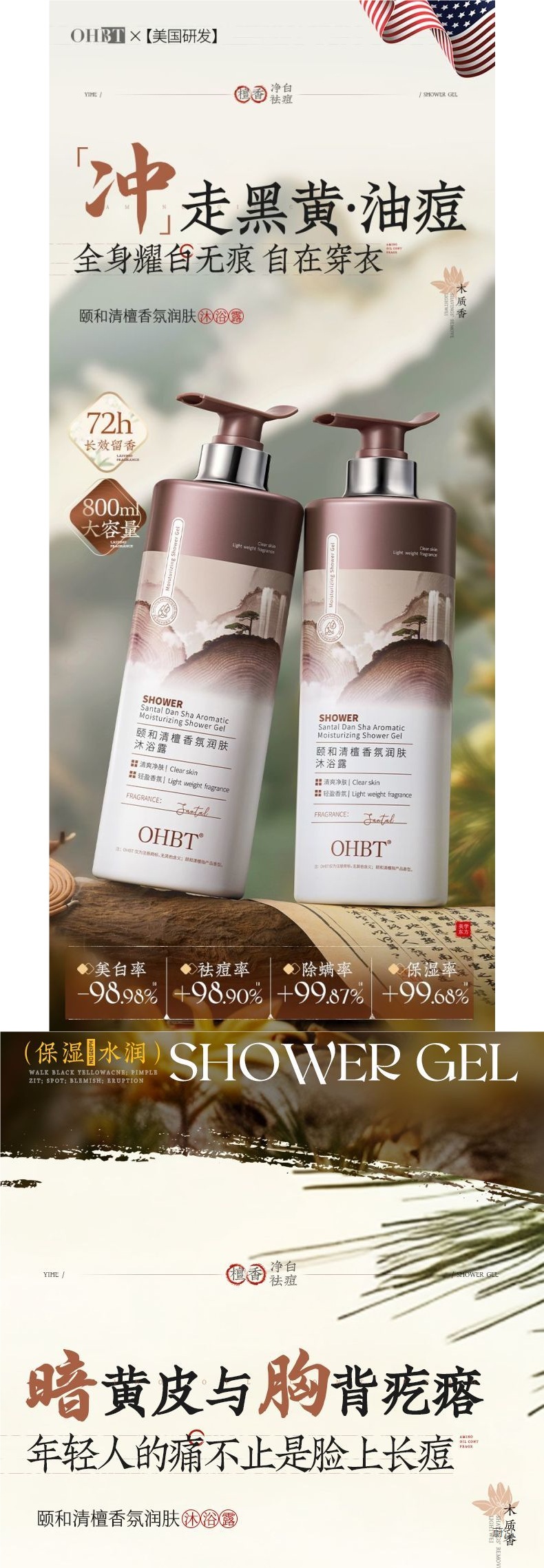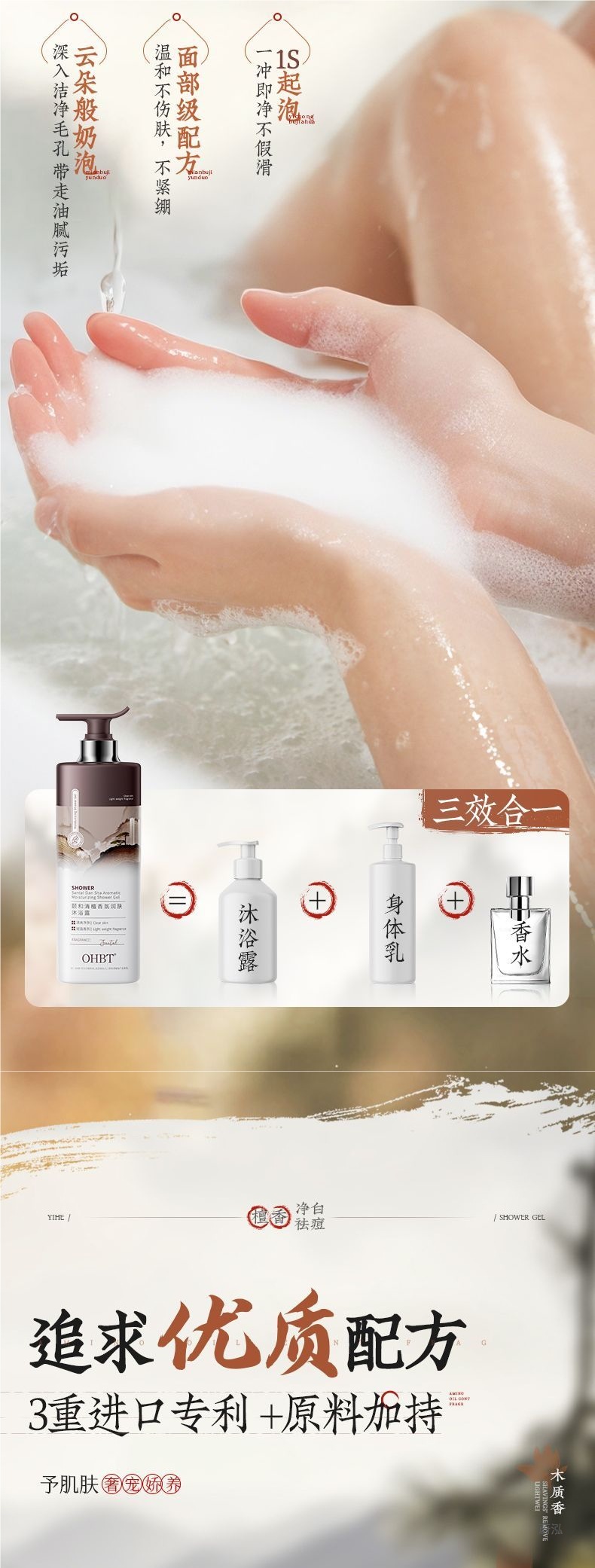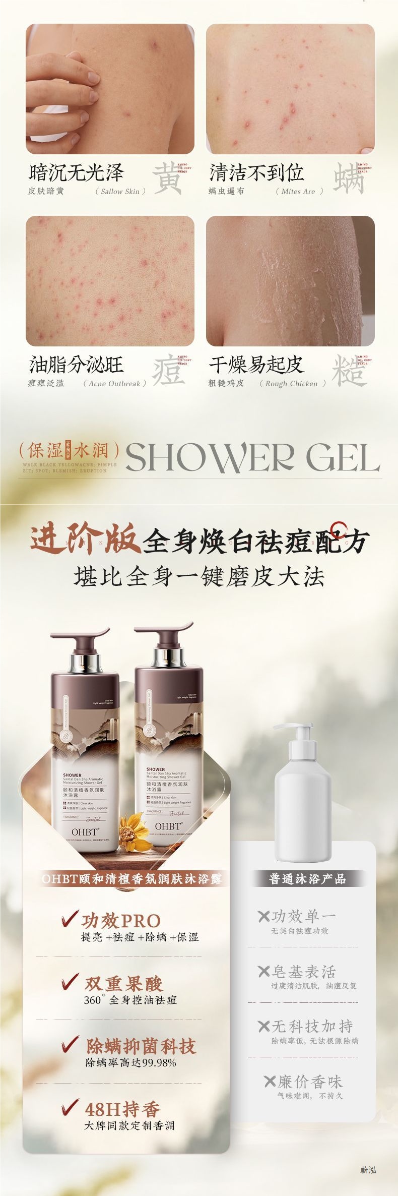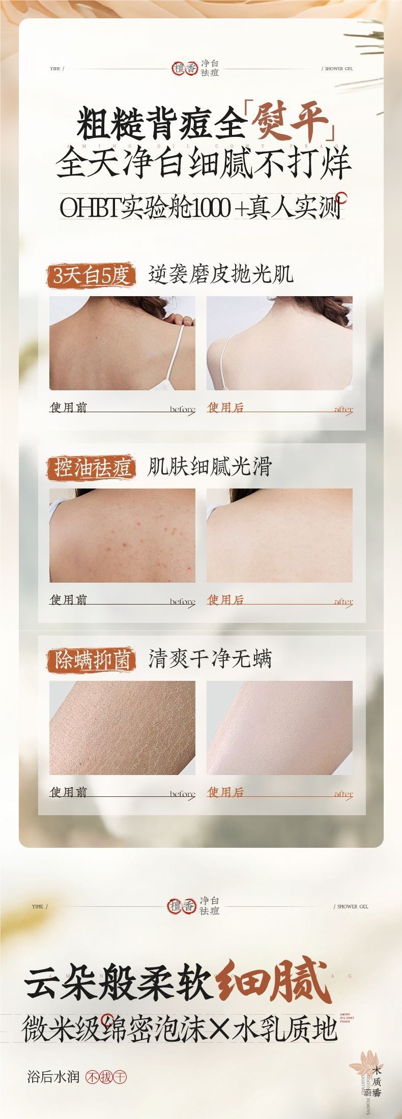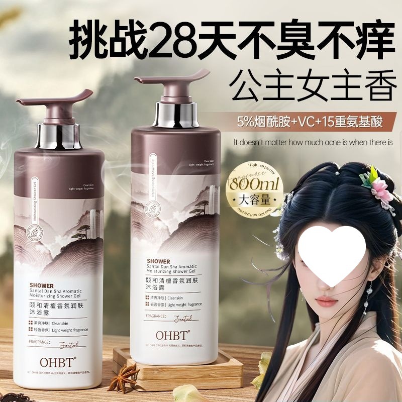 OHBT Yihetian Сандаловое дерево Гель для душа Отбеливание спины Борьба с прыщами Контроль жирности Увлажняющее очищение Освежающее увлажнение Нежный аромат Увлажнение