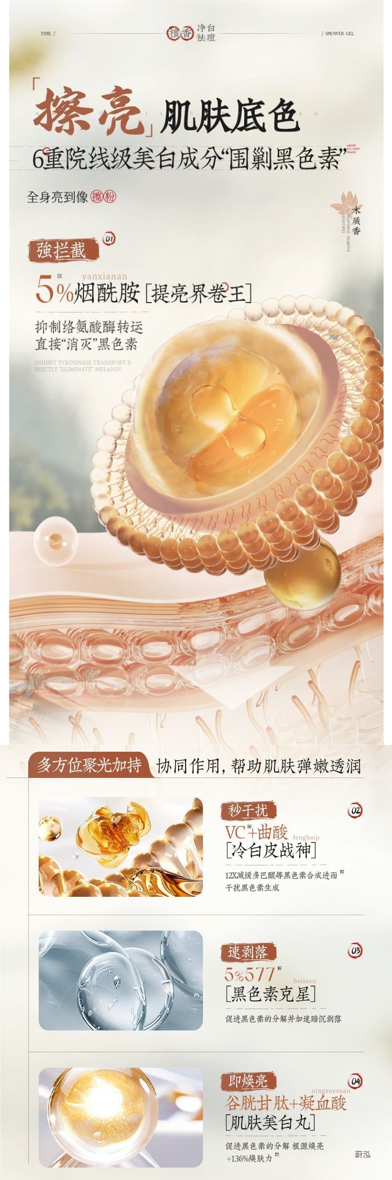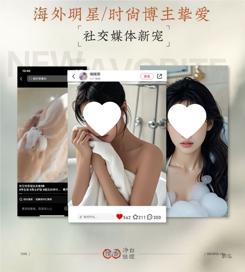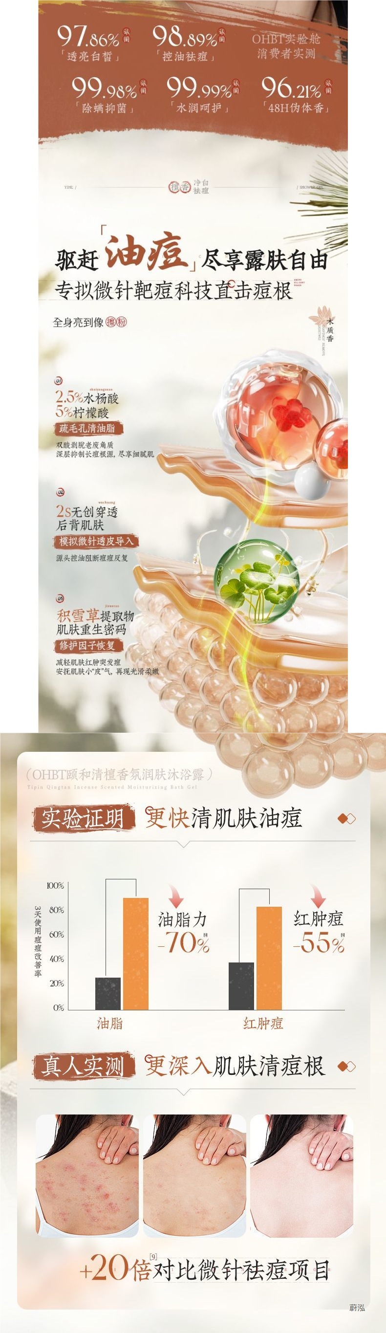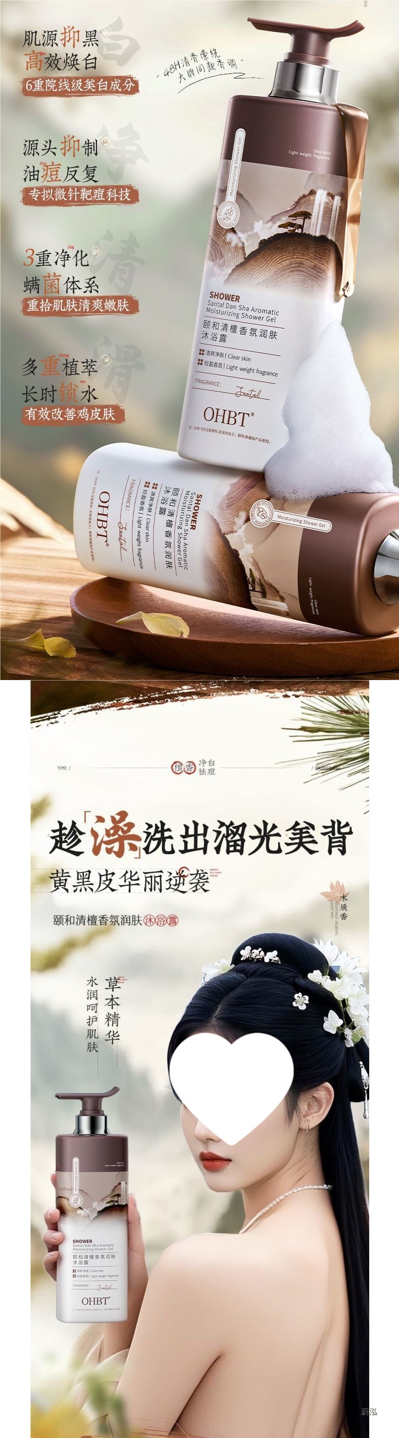 OHBT Yihetian Сандаловое дерево Гель для душа Отбеливание спины Борьба с прыщами Контроль жирности Увлажняющее очищение Освежающее увлажнение Нежный аромат Увлажнение