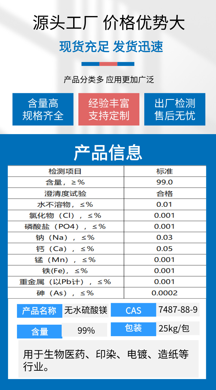 Анализационный безводный сульфат магния AR-класса, 7487-88-9, чистота 99%, для школьных экспериментов.