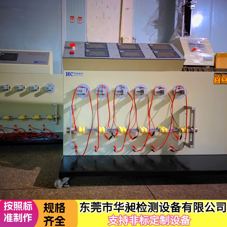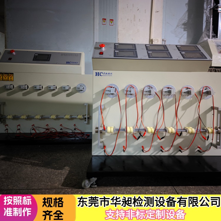 本机专门测试插头引出线及电线之耐折强度,试法是将试料固定在夹具上,并加一定荷重,试验时夹具左右摆动,经一定次数后,检视其断线率;或至无法通电时,查看其总计摆动次数,本机能自动计数,试料弯折至断线无法通电时,并能自动停止操作.