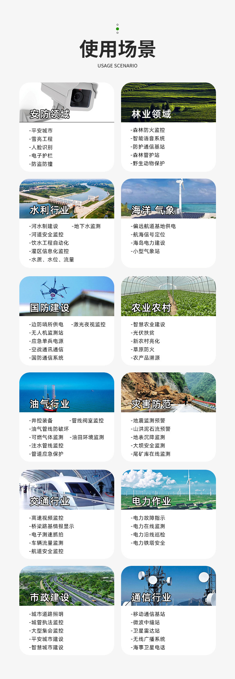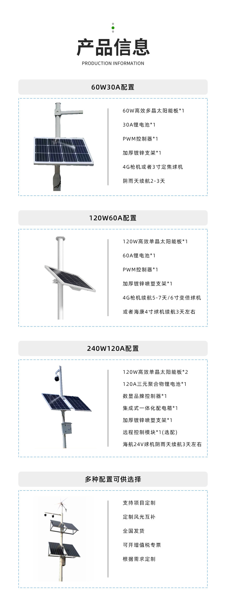Индивидуальная система солнечного энергоснабжения (гибридная ветро- и солнечная энергия); 40 Вт-20 Ач (для небольших нагрузок, таких как датчики, приборы и т. д.); 60 Вт-30 Ач (12-вольтовый пистолет обеспечивает работу в течение 3 дождливых дней); 80W-40AH (4G пистолетная камера на 4 дня или 2inch шаровая камера на 4 дня); 120W-60AH (3 дня для машины с 4inch мячами или 2 дня для машины с 6inch мячами); 150W-80AH (3 дня для машины с 4inch мячами или 2 дня для машины с 6inch мячами); 240W-120AH (24V4G шариковый автомат на 2 дня); 300W-160AH24V4G шариковый генератор, доставка за 2 дня (правый); 400 Вт-240 Ач (24 В PTZ-камера на 5 дней + беспроводной маршрутизатор 4G или беспроводной мост); Ветряная турбина с вертикальной осью мощностью 300 Вт (гибридная ветро-солнечная); Модуль удаленного мониторинга Интернета вещей