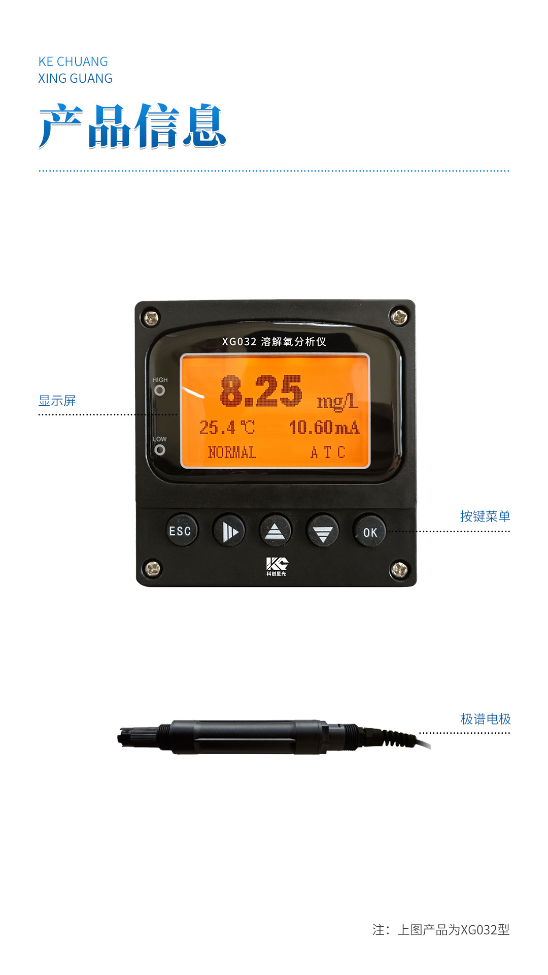 XG032 溶解氧分析仪(极谱法毫克级)由维护量小、稳定性佳的极谱式溶解氧电极和二次仪表组成,具有中文菜单式操作、全智能、多功能、测量性能高等特点,广泛应用各行业溶液中ppm级溶解氧的测量。
