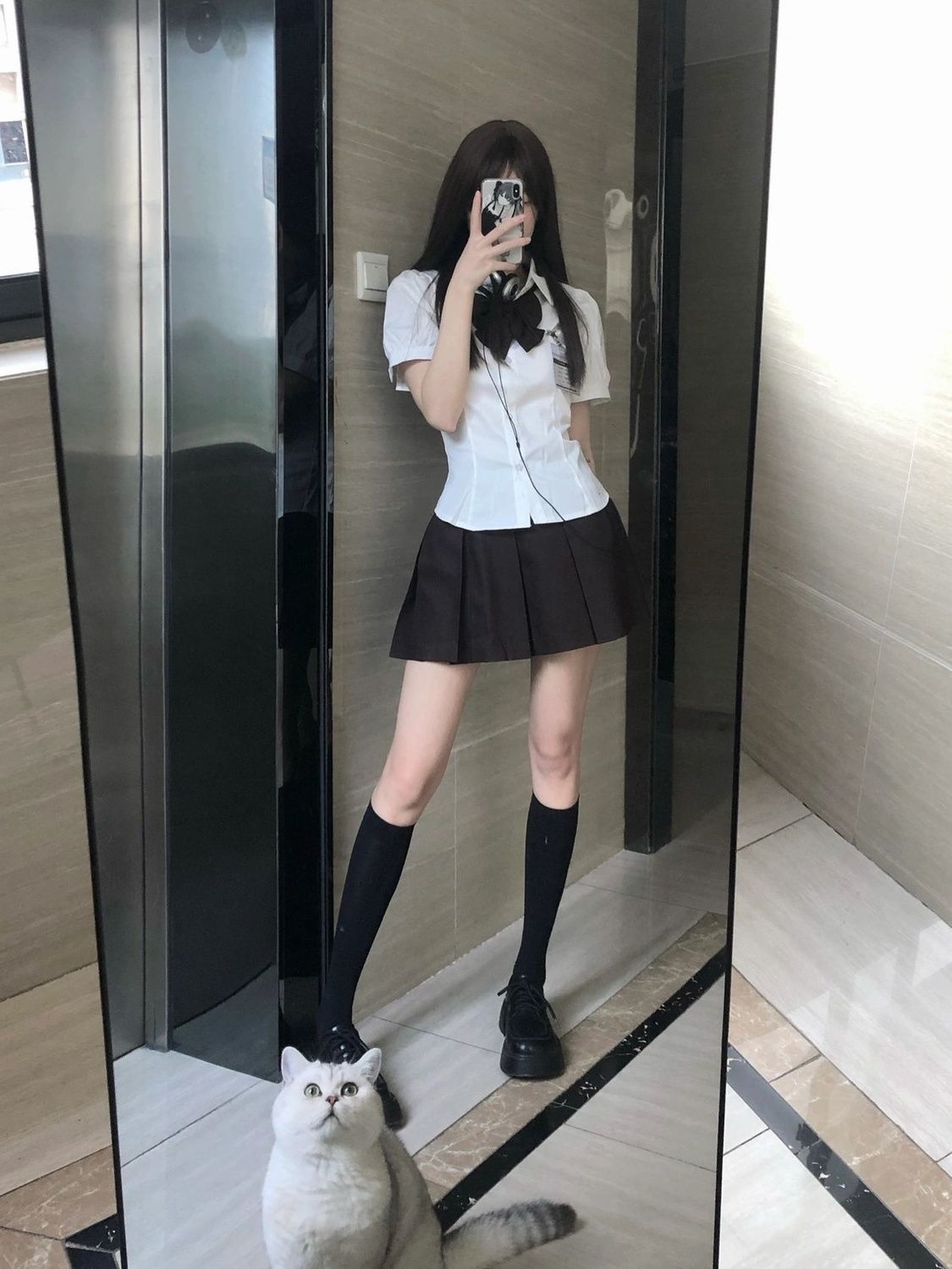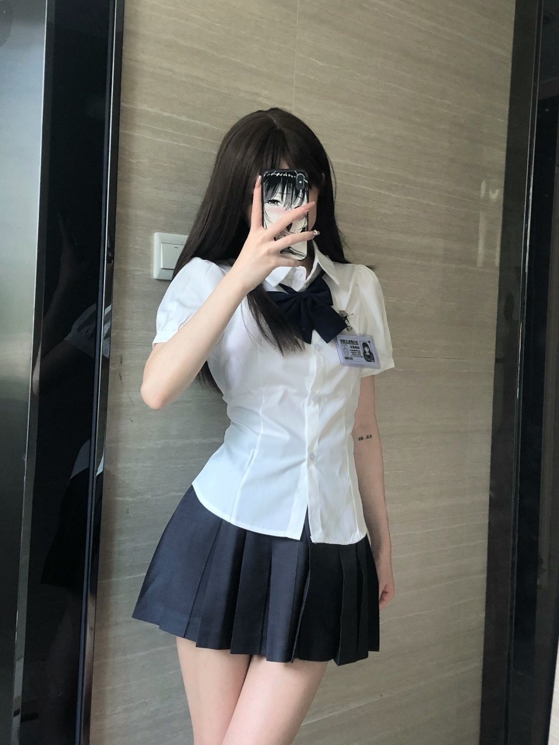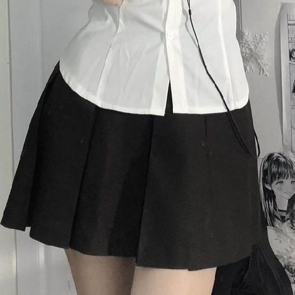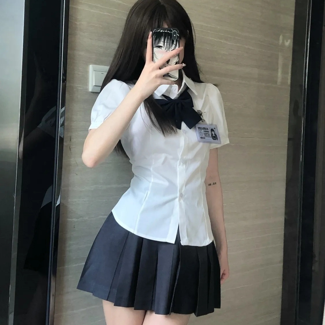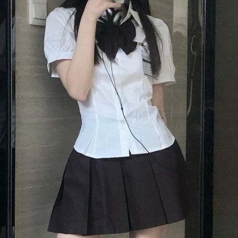 Белая одинарная рубашка; Белая рубашка + черный бант; Белая рубашка + черная плиссированная юбка + черный бант.; черная плиссированная юбка