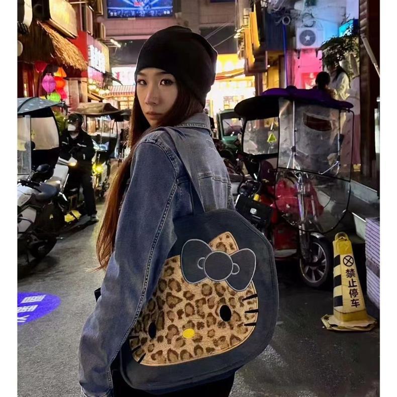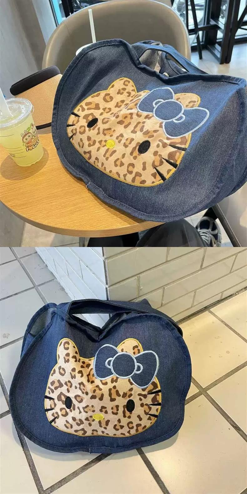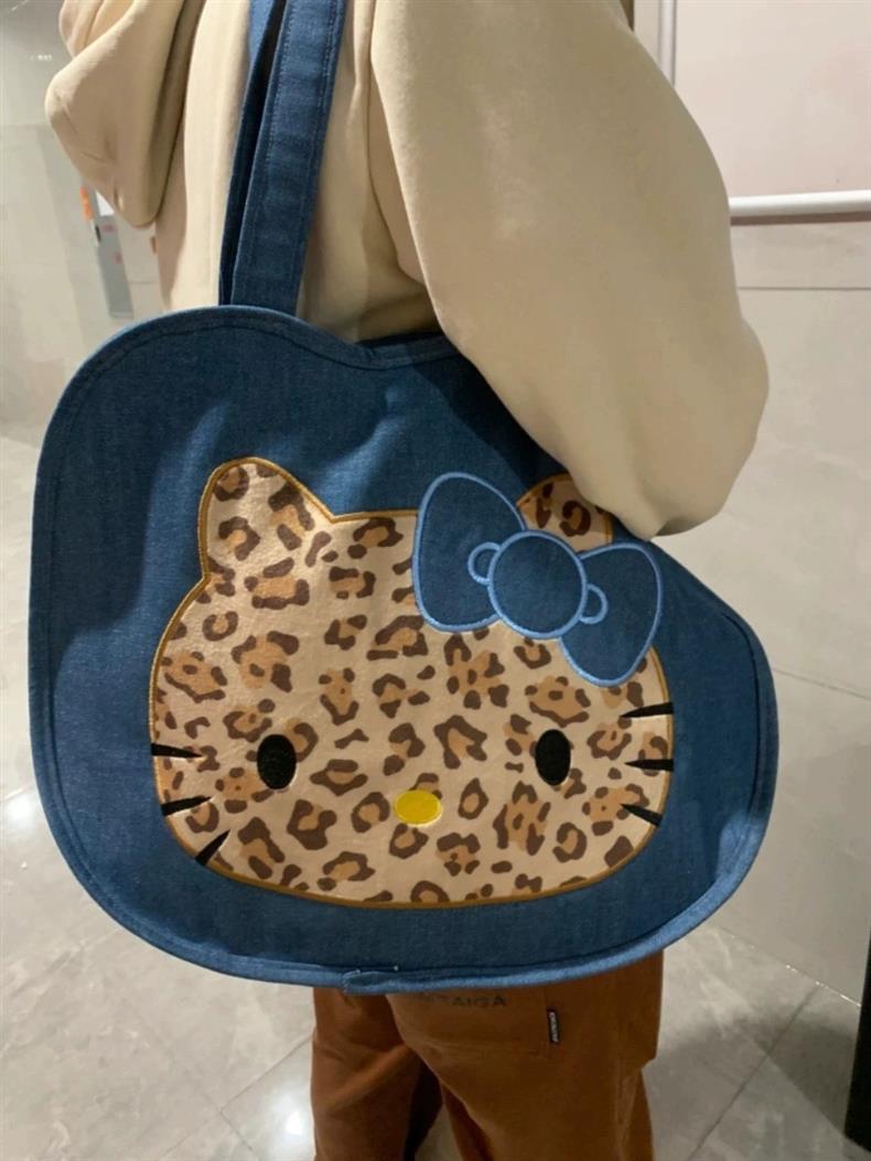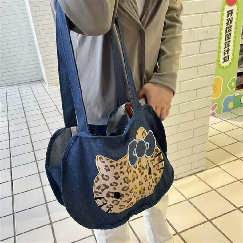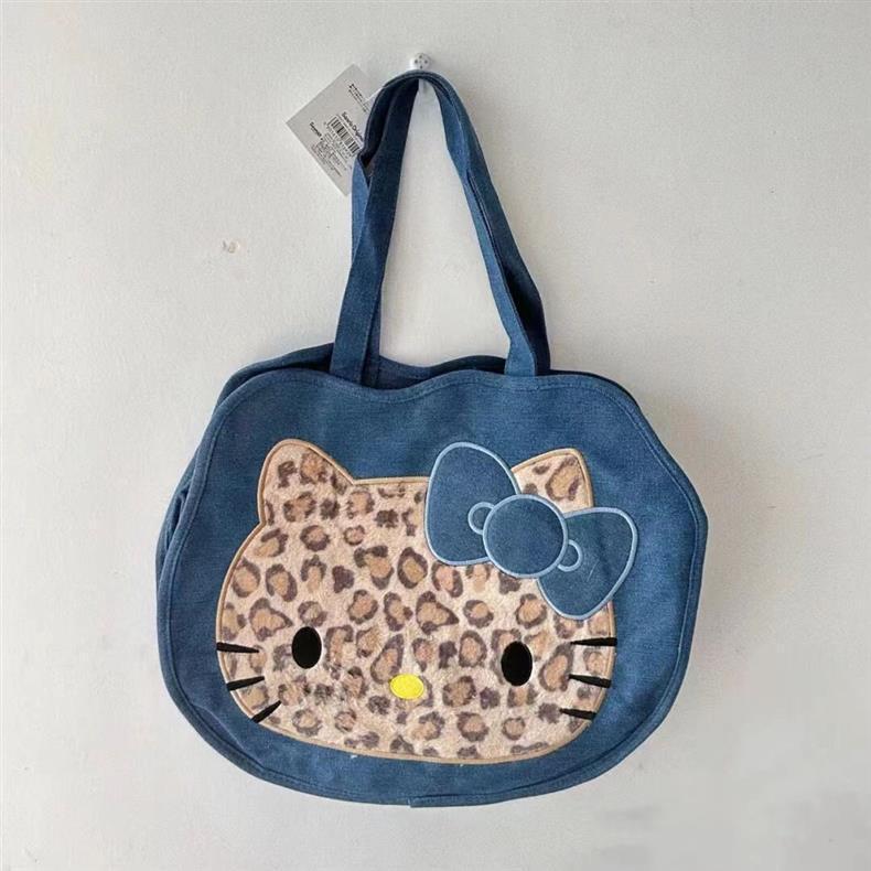 Сумка-тоут с леопардовым принтом «Hello Kitty», джинсовая парусиновая сумка на плечо с котенком, большая вместительная ручная сумка для девочек, сумка с героями мультфильмов