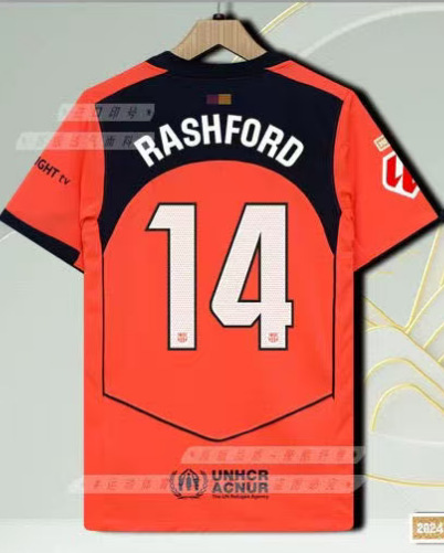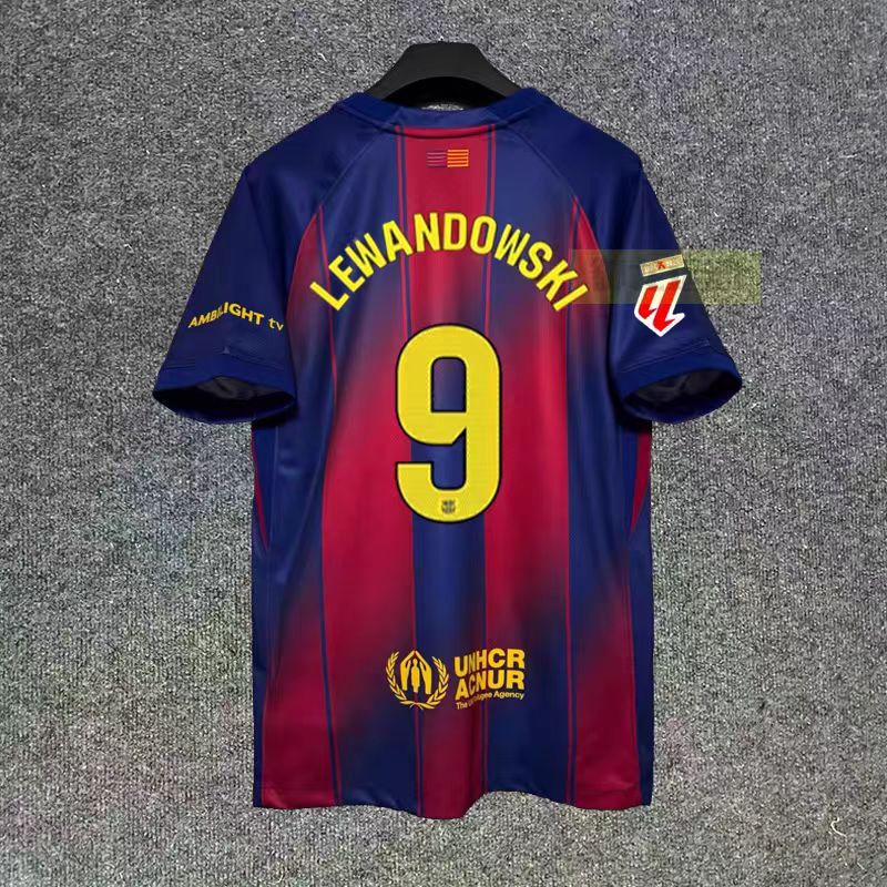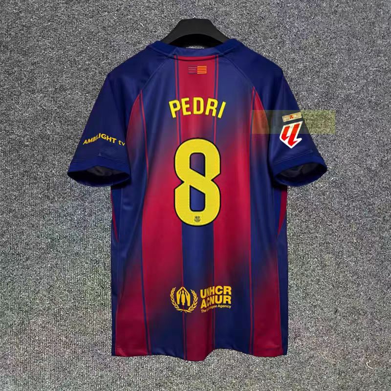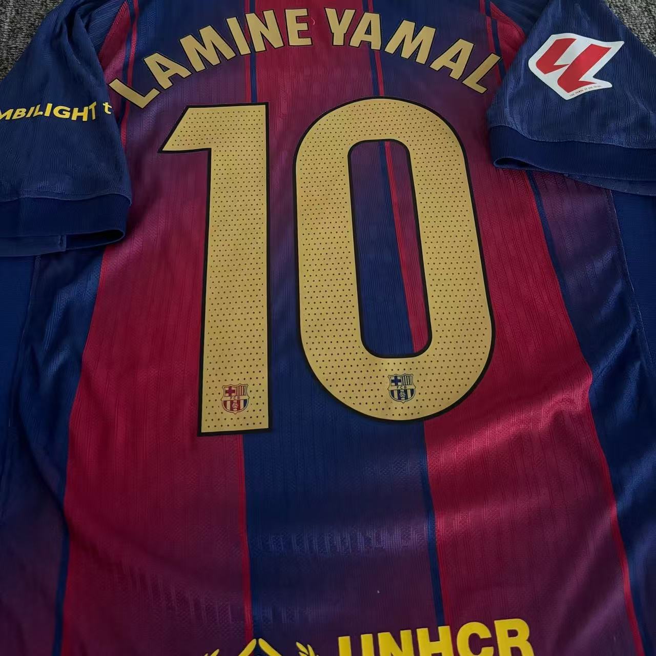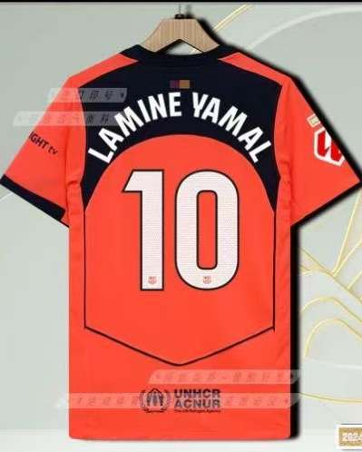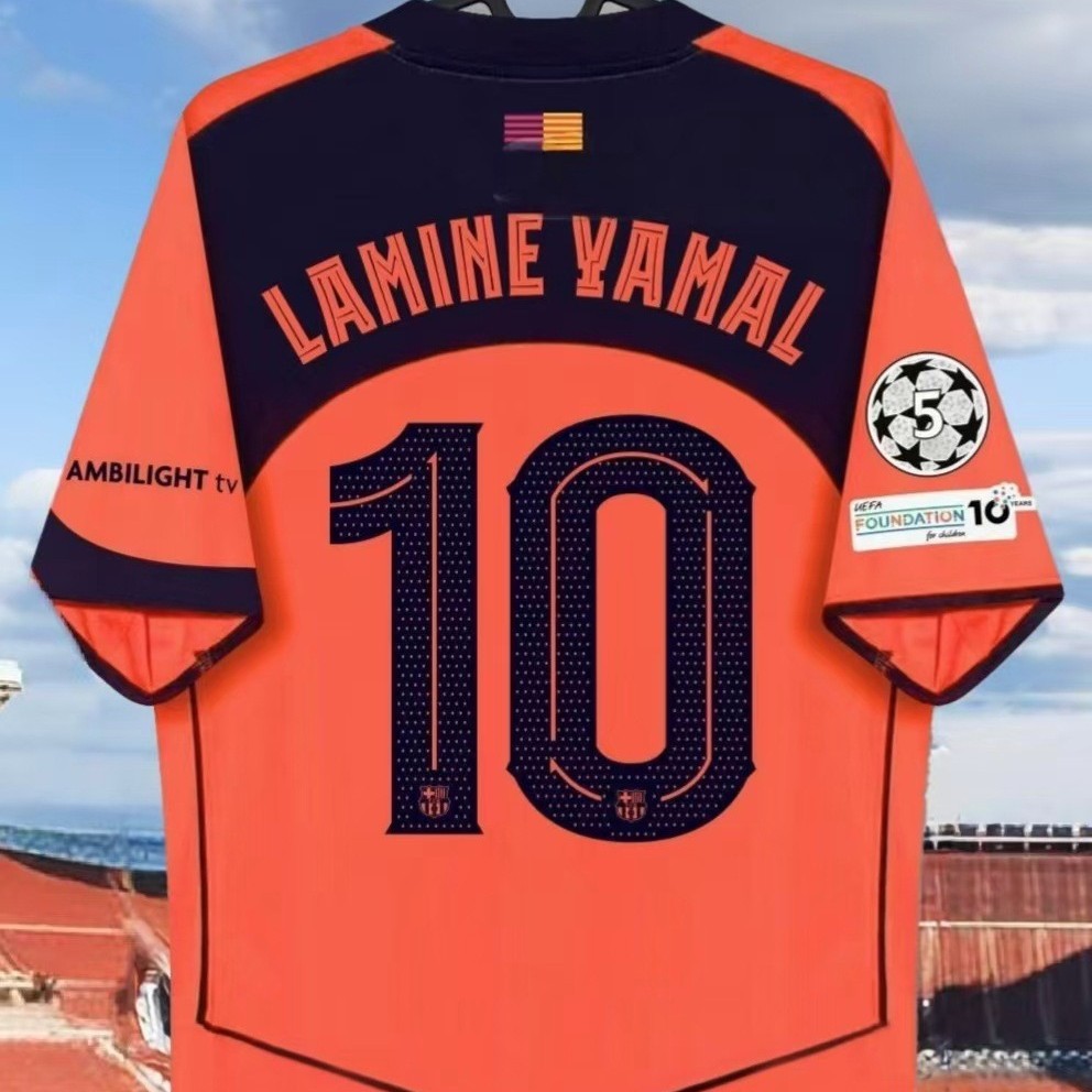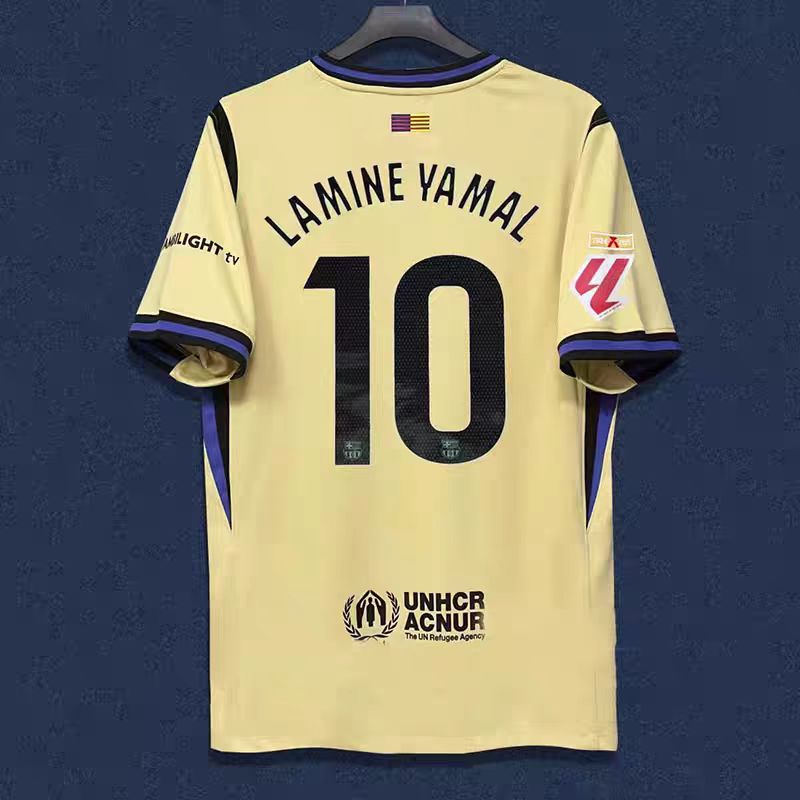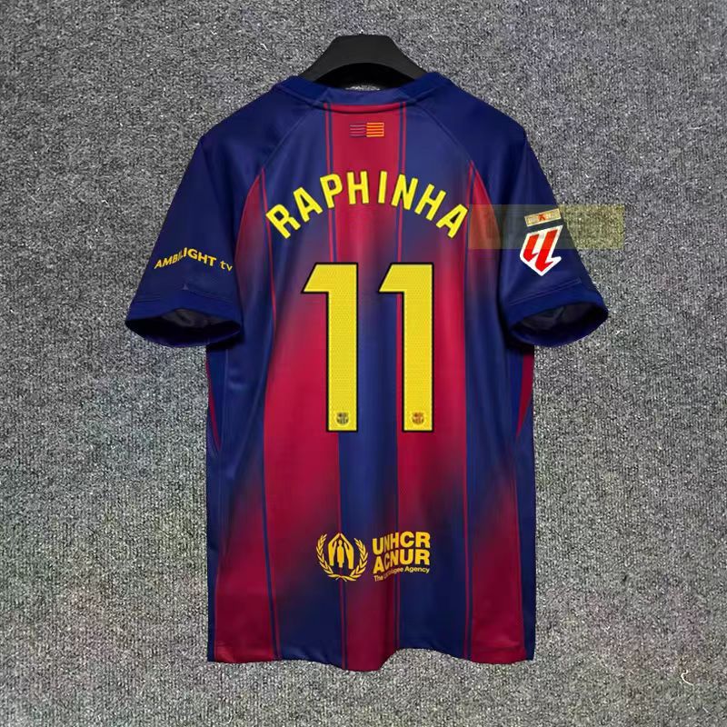 Футбольная форма Барселоны 25-26, домашняя и гостевая, номера 10 Ямал, 11 Рафина, 14 Рашфорд.