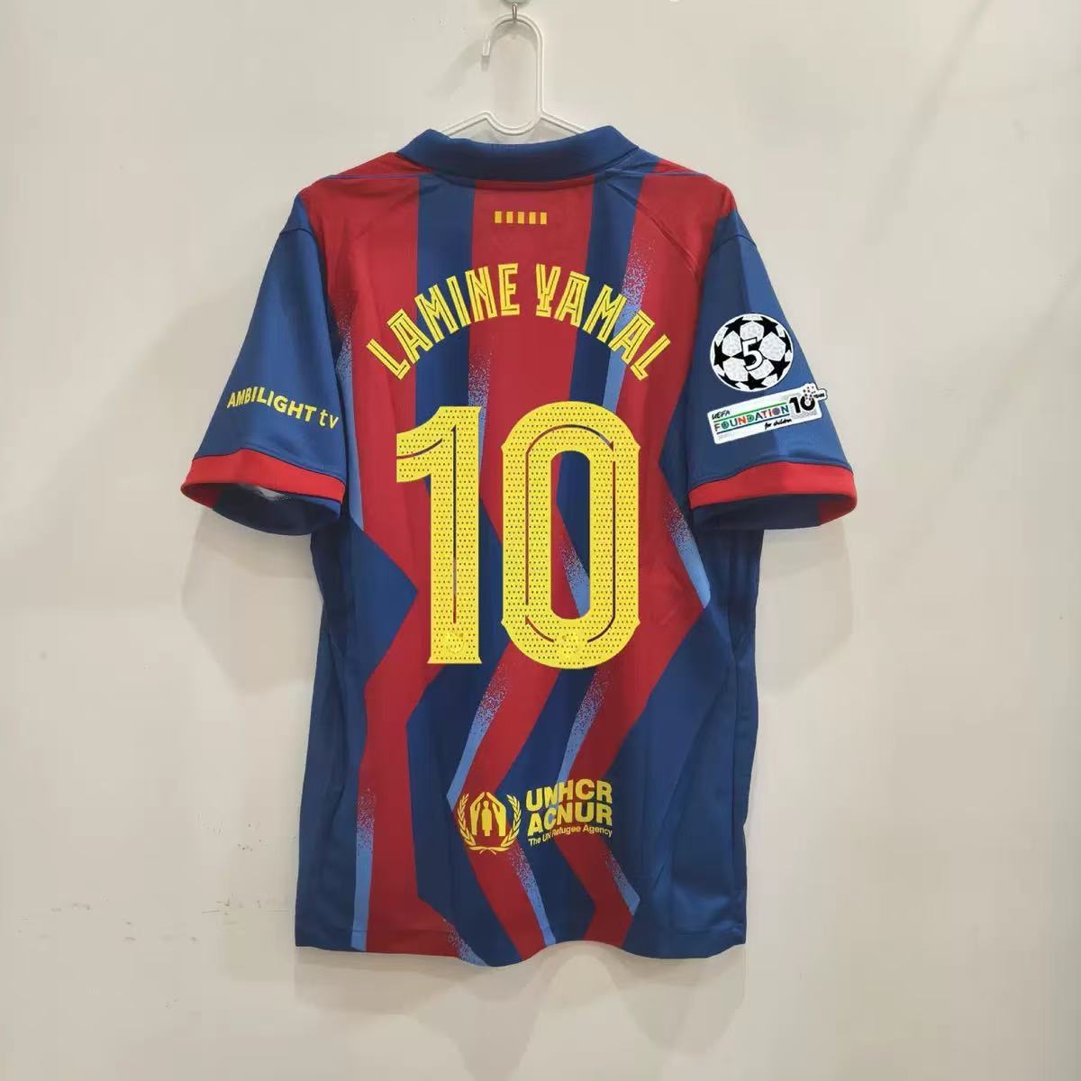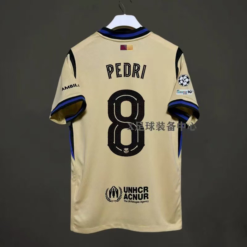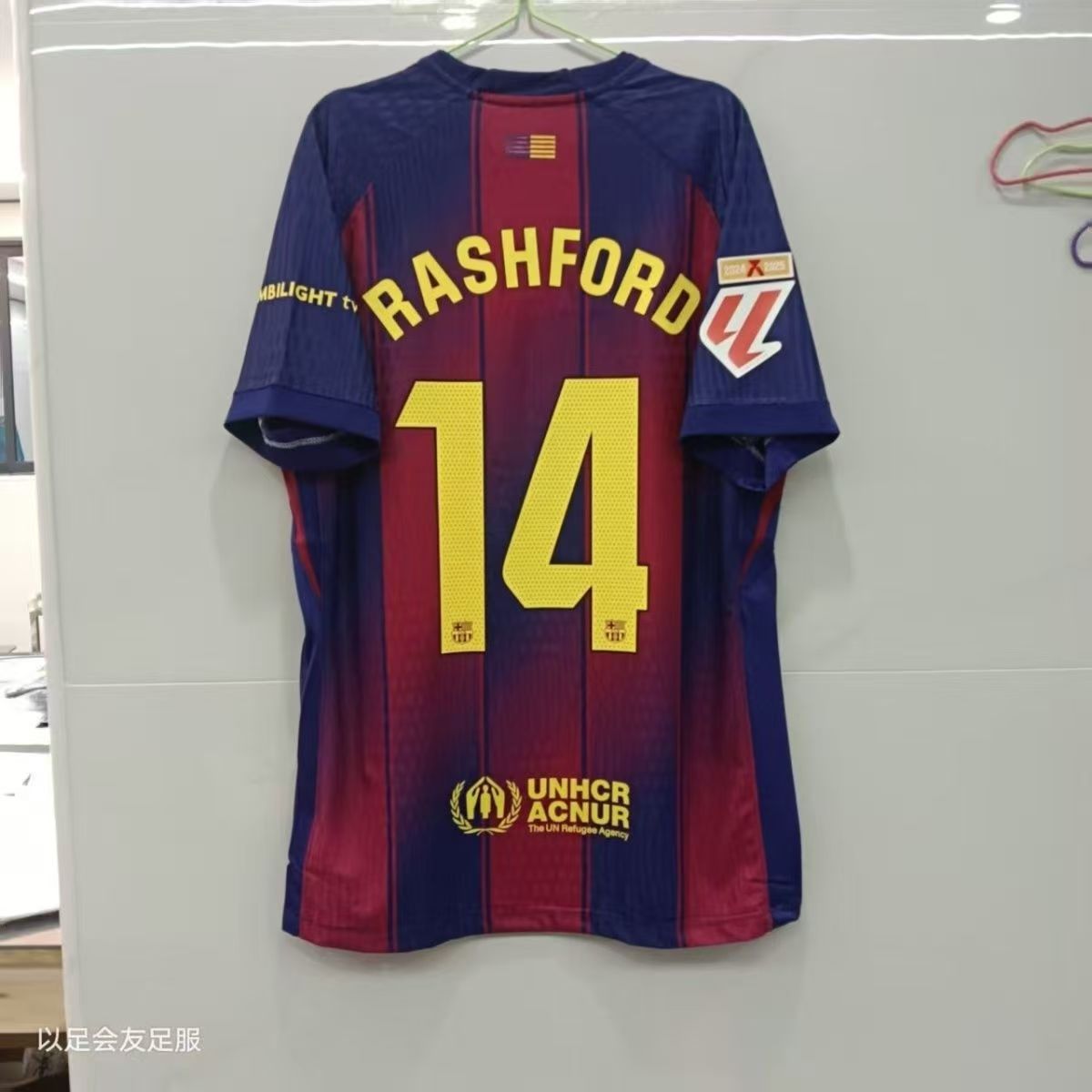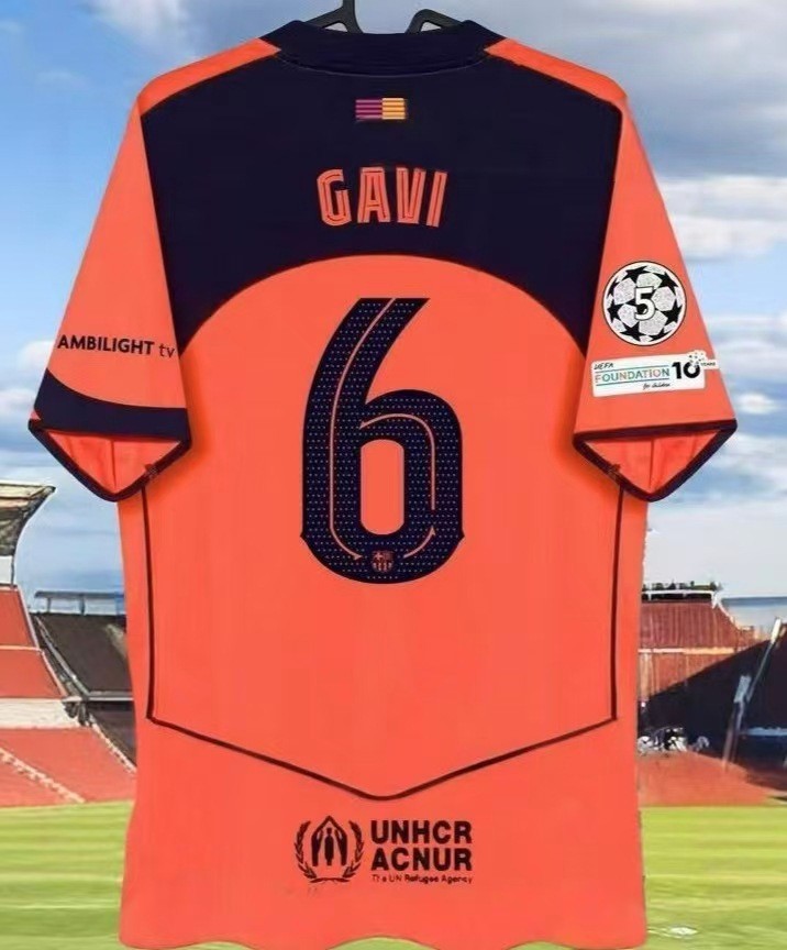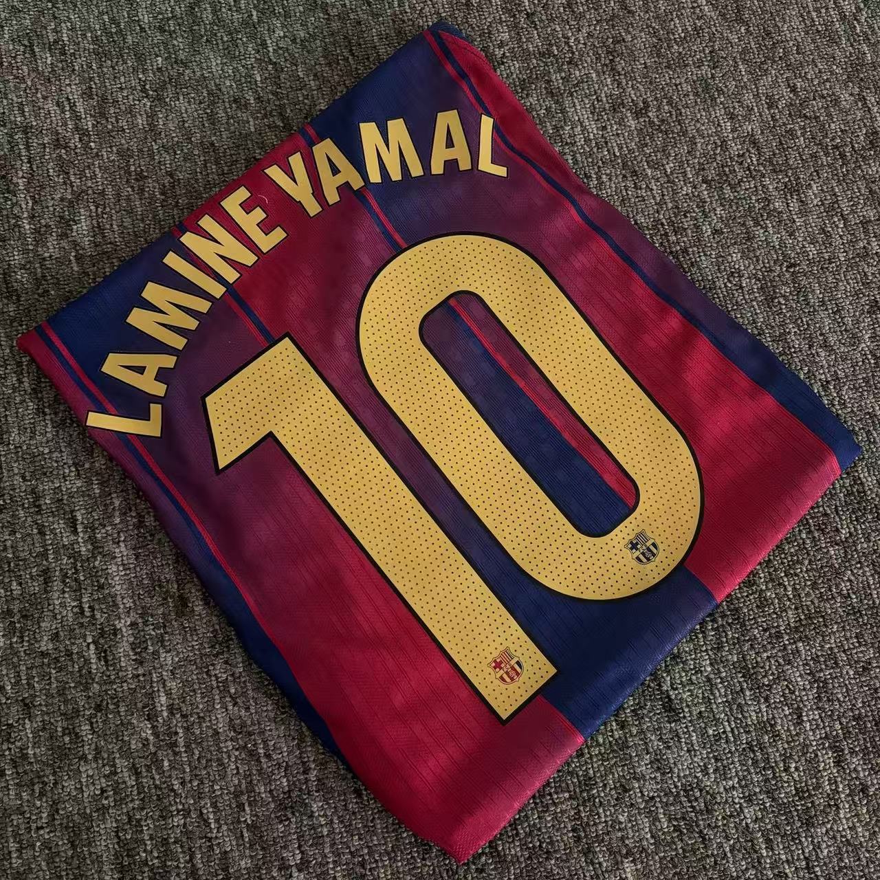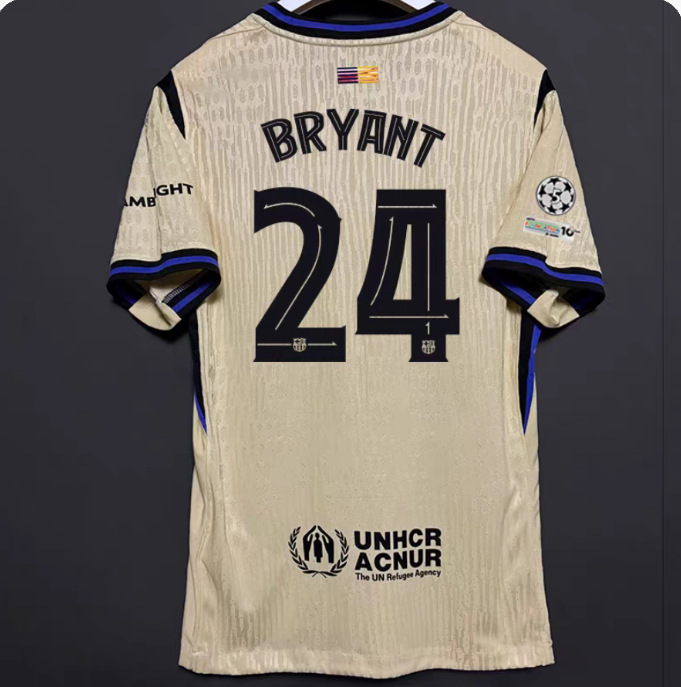 Футбольная форма Барселоны 25-26, домашняя и гостевая, номера 10 Ямал, 11 Рафина, 14 Рашфорд.