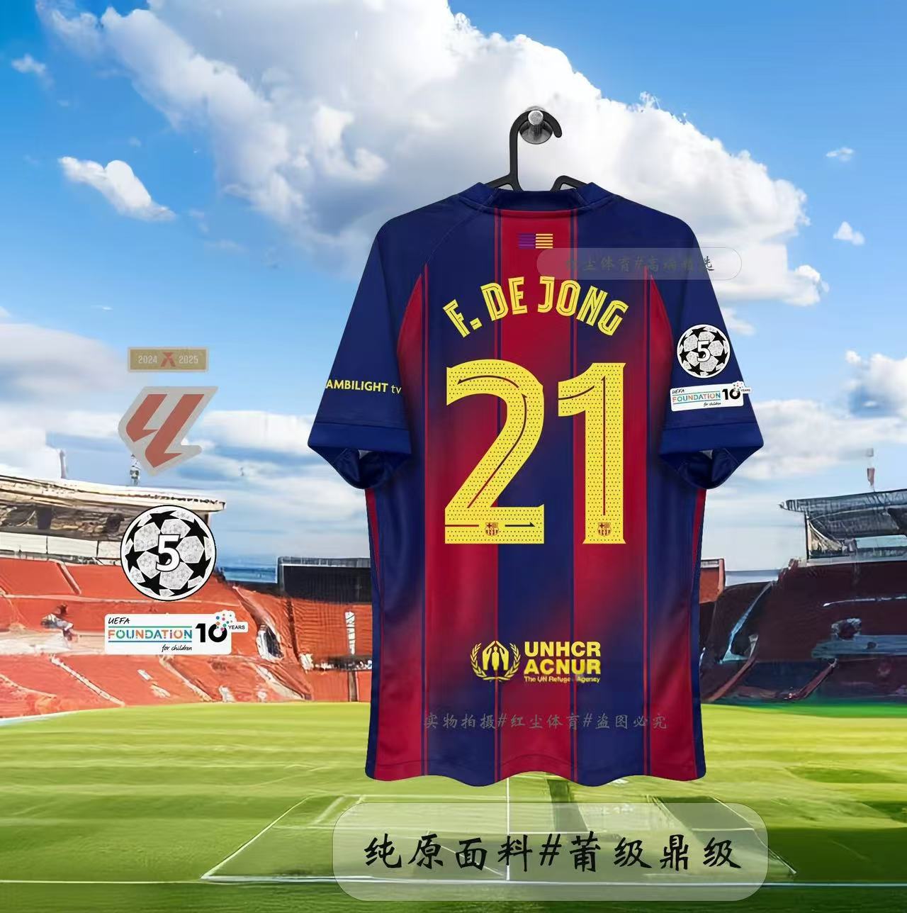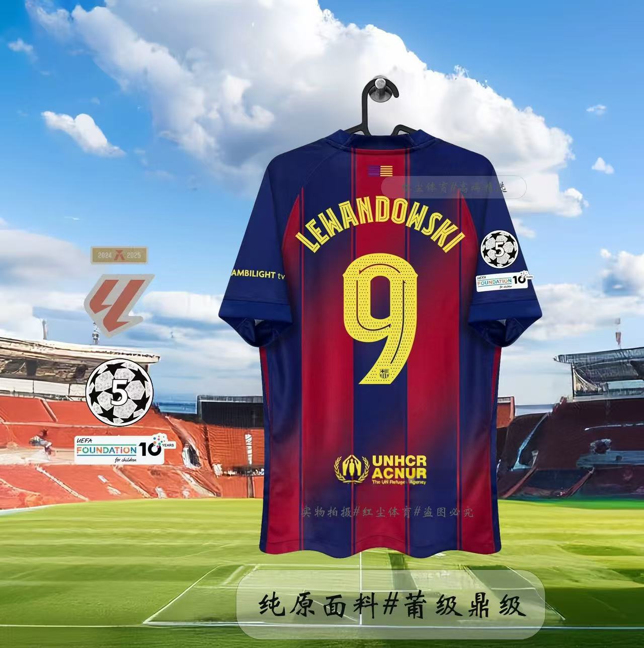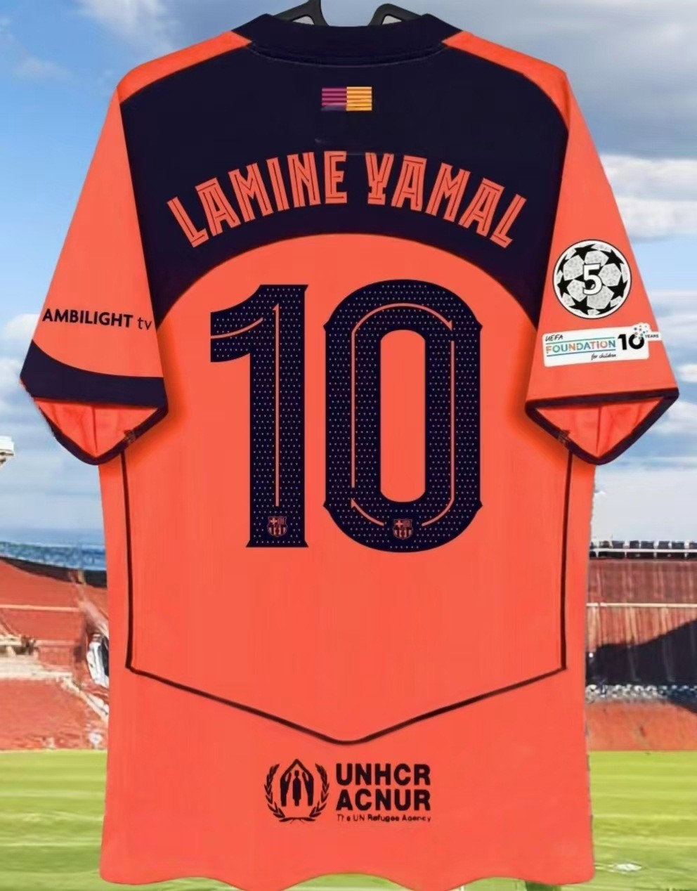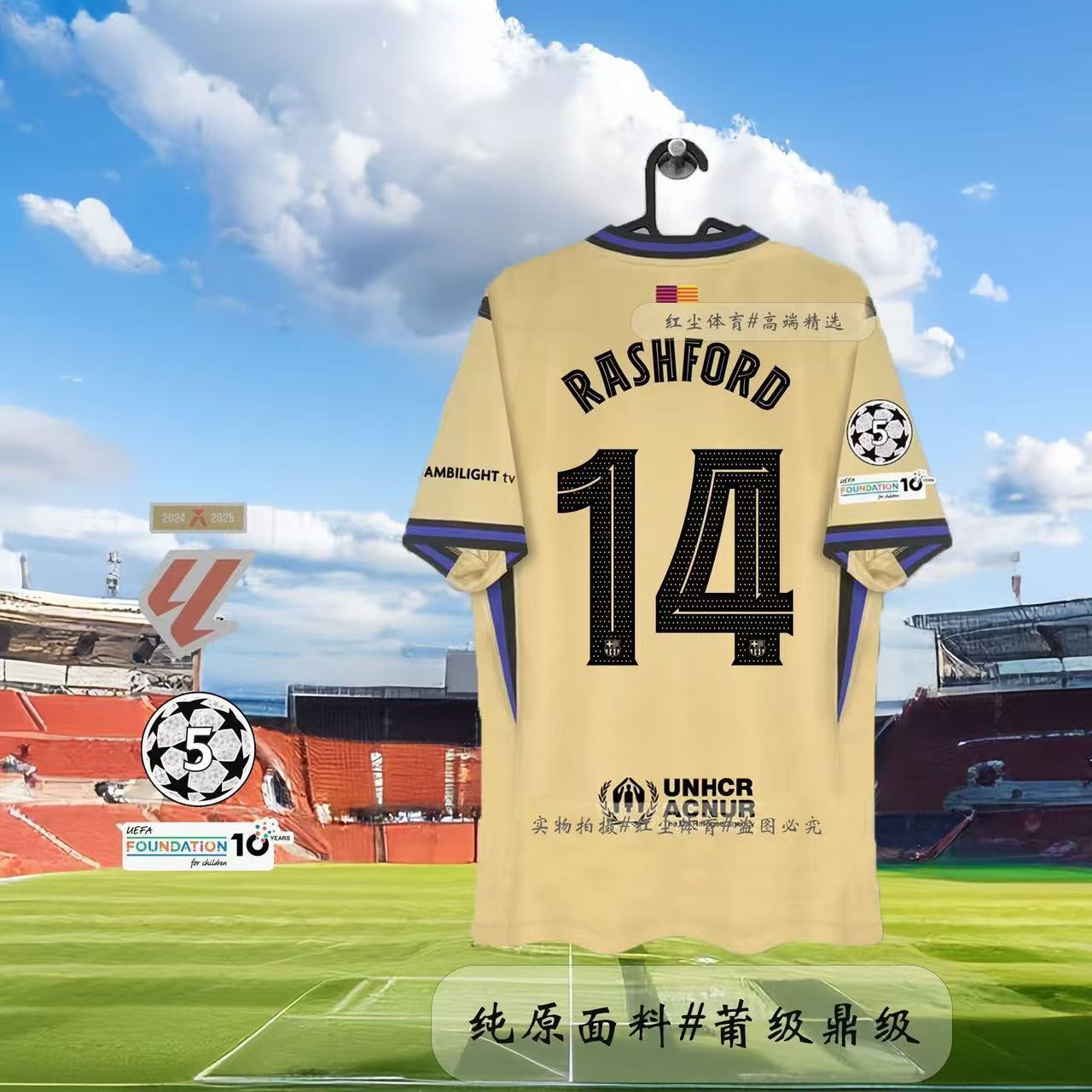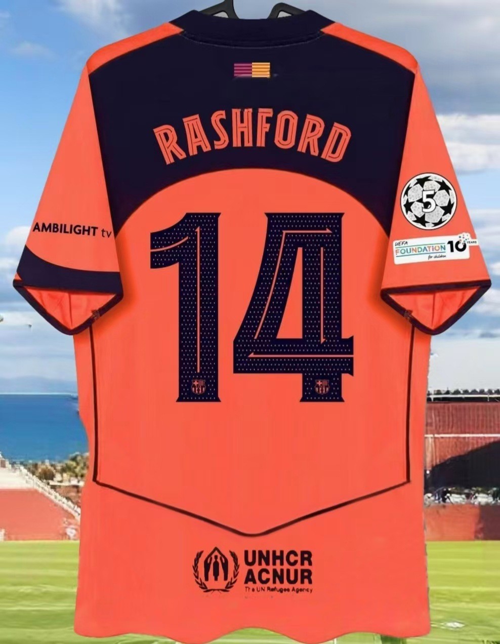 Футбольная форма Барселоны 25-26, домашняя и гостевая, номера 10 Ямал, 11 Рафина, 14 Рашфорд.