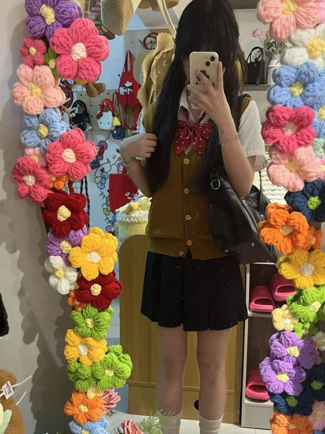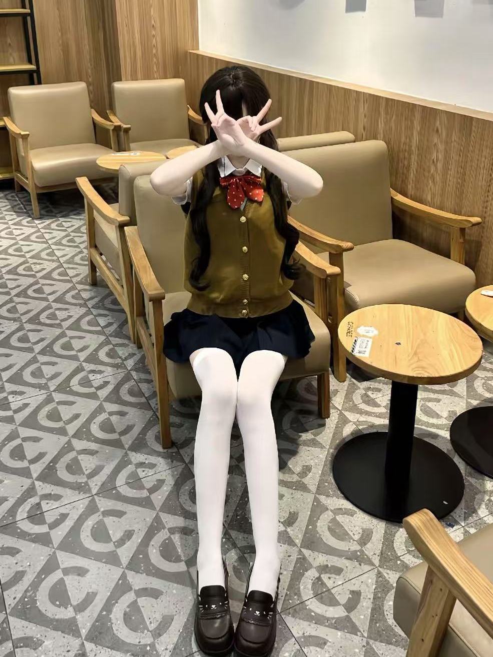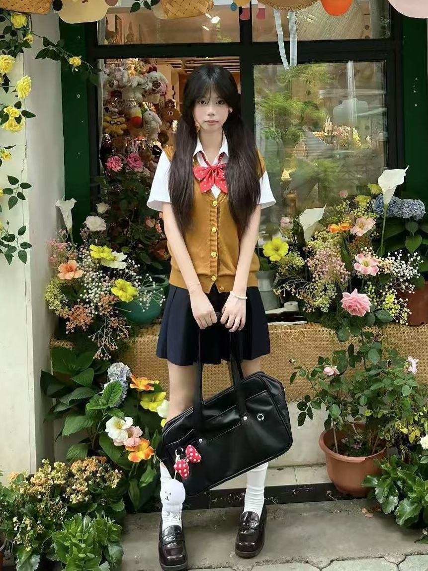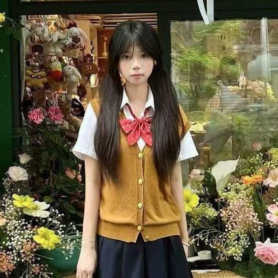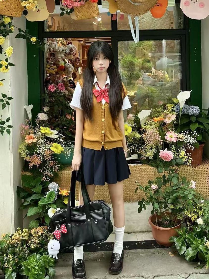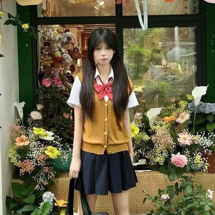 Жилет на пуговицах коричневого золота + рубашка + голубая юбка JK + красный галстук-бабочка в горошек; Рубашка + жилет на коричневых пуговицах + красный галстук-бабочка в горошек; Жилет на пуговицах коричневого золота + голубая юбка JK + красный галстук-бабочка в горошек; Свободная рубашка с короткими рукавами + голубая юбка JK + красный галстук-бабочка в горошек; Свободная рубашка с короткими рукавами + красный галстук-бабочка в горошек.; Жилет на пуговицах коричневого золота, цельный; Голубая юбка JK, цельная; Свободная рубашка с короткими рукавами, цельная