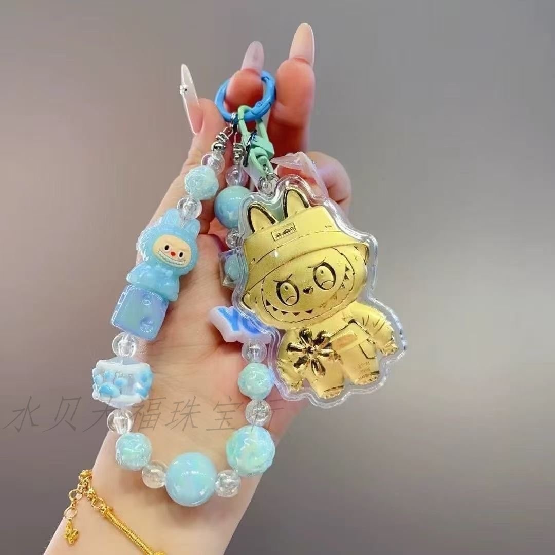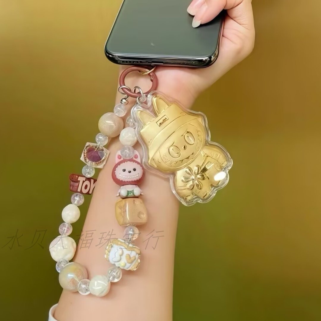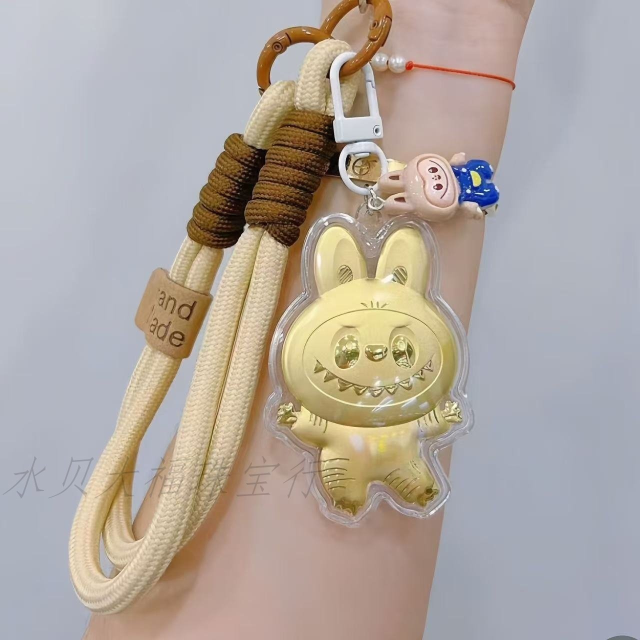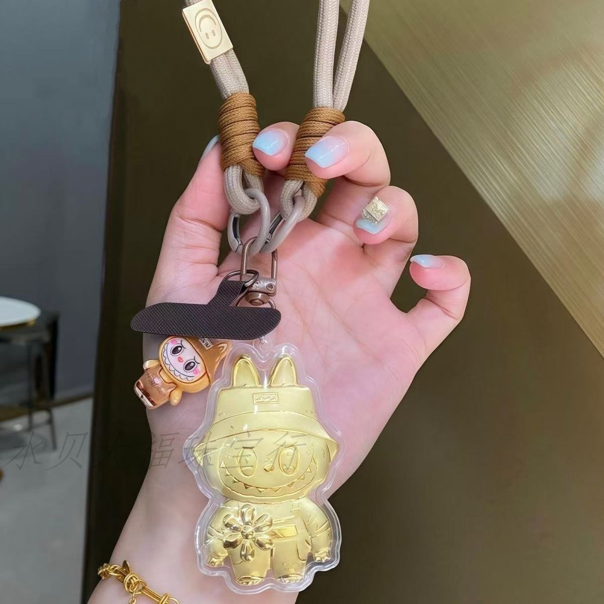Водяной бежевый золотой 999 Labubu ремешок для телефона, брелок из чистого золота, подвеска для сумки, подарок для подруги или лучшего друга.