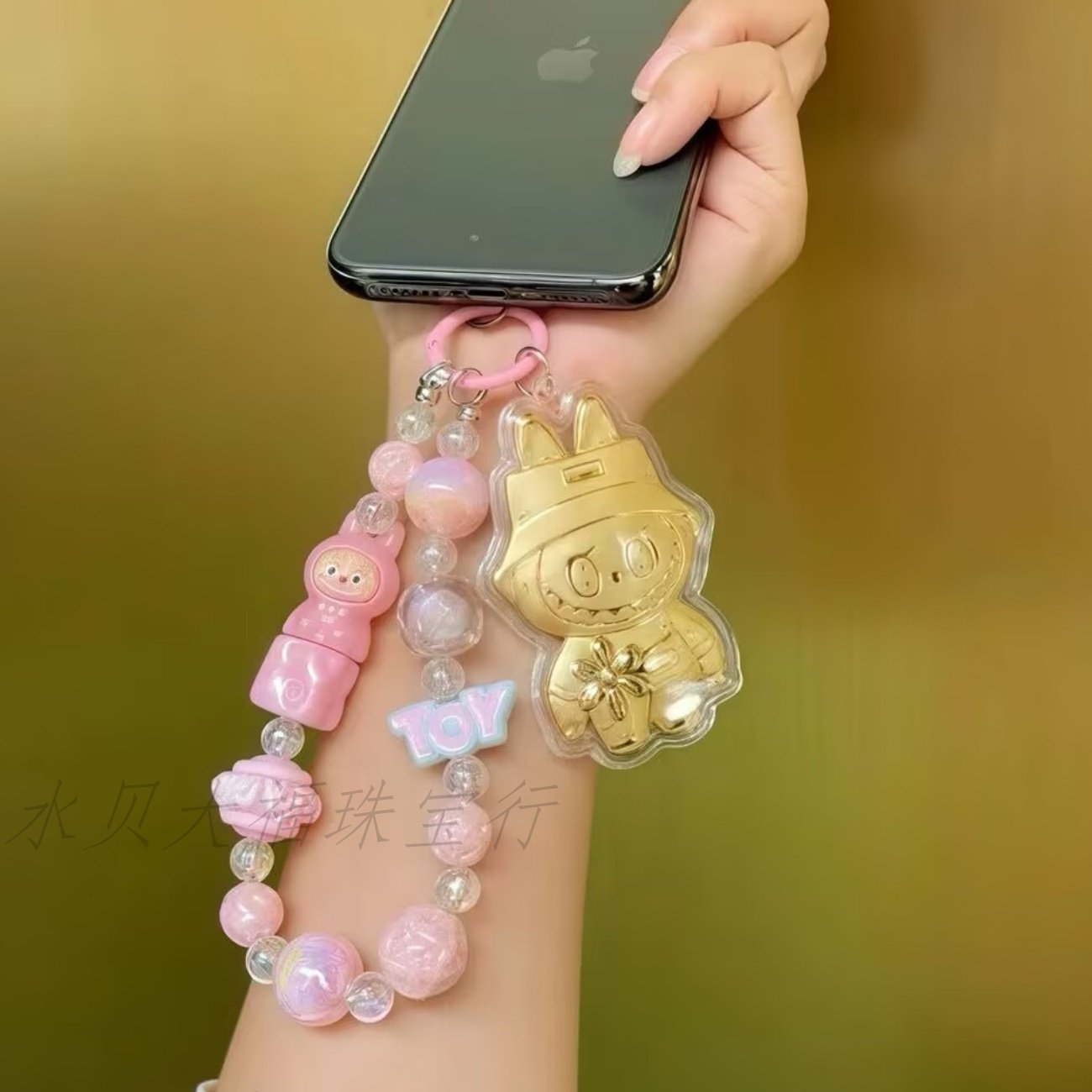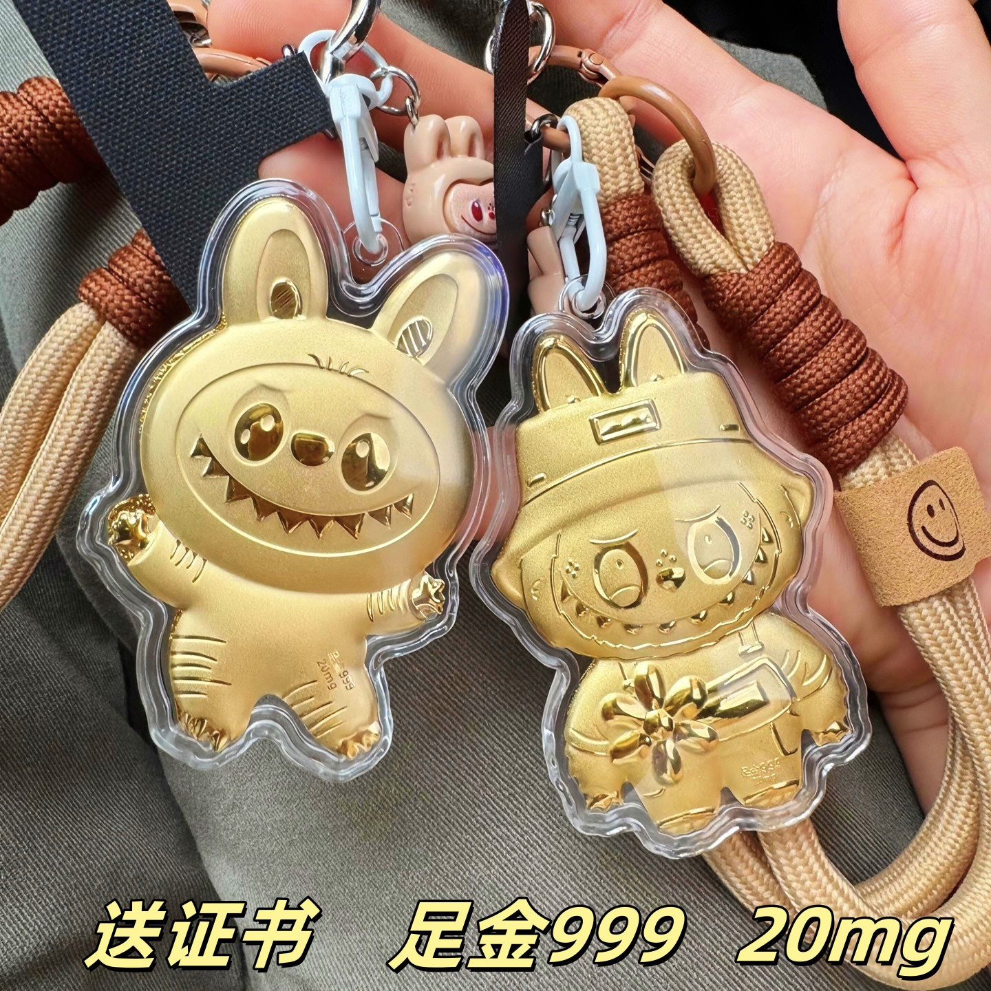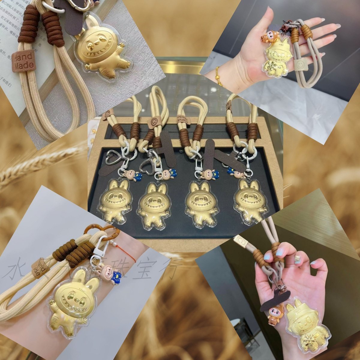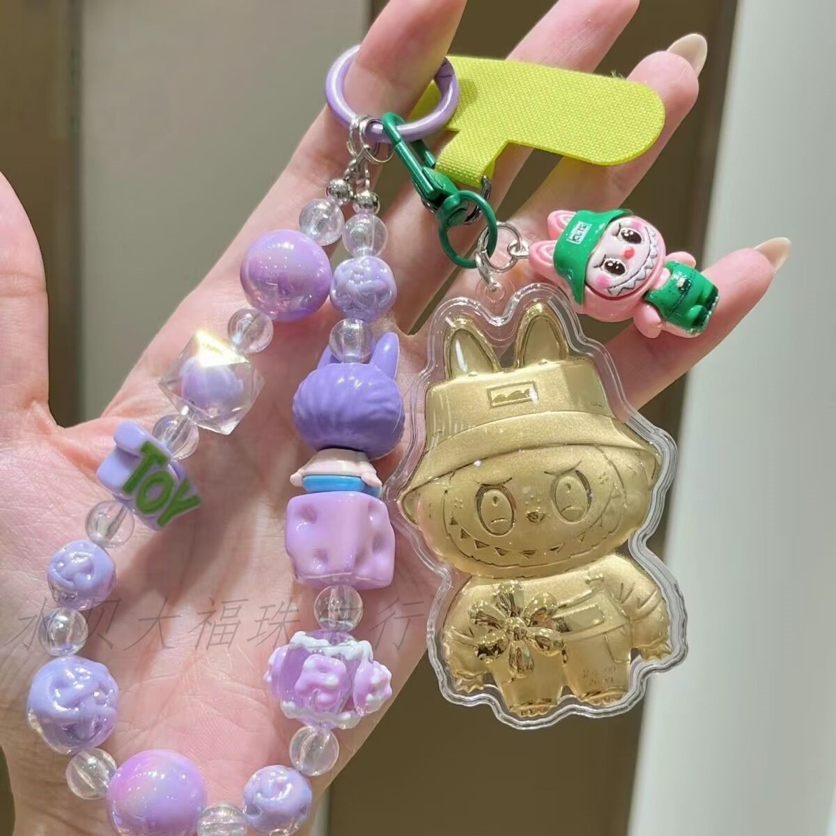 Водяной бежевый золотой 999 Labubu ремешок для телефона, брелок из чистого золота, подвеска для сумки, подарок для подруги или лучшего друга.
