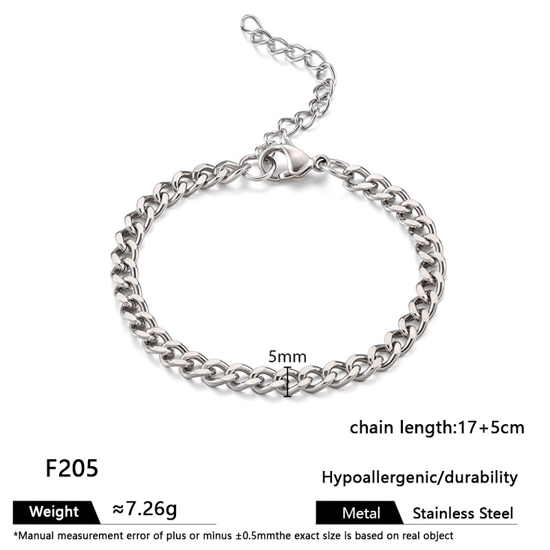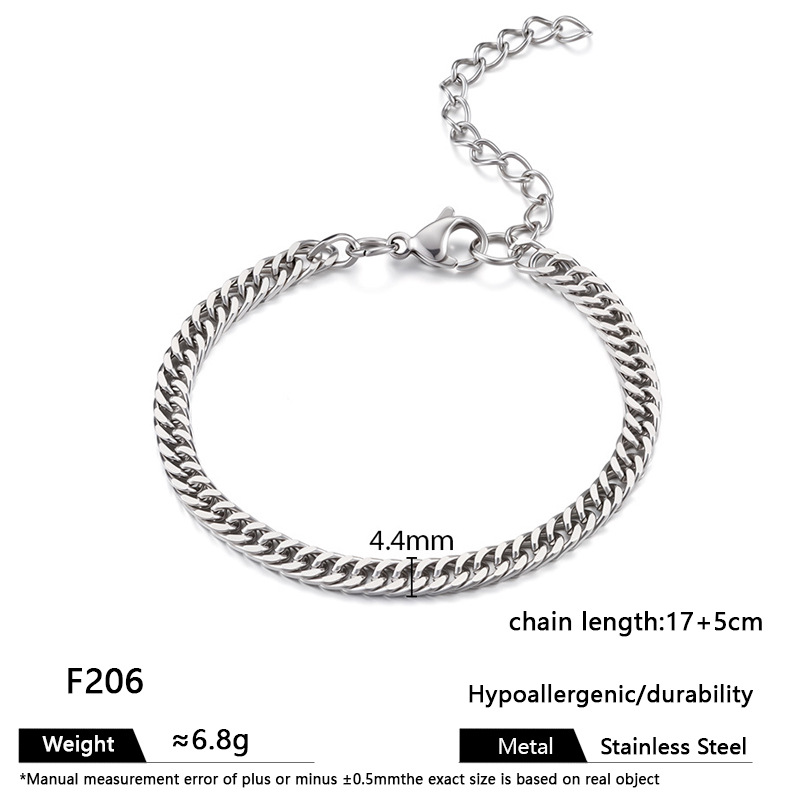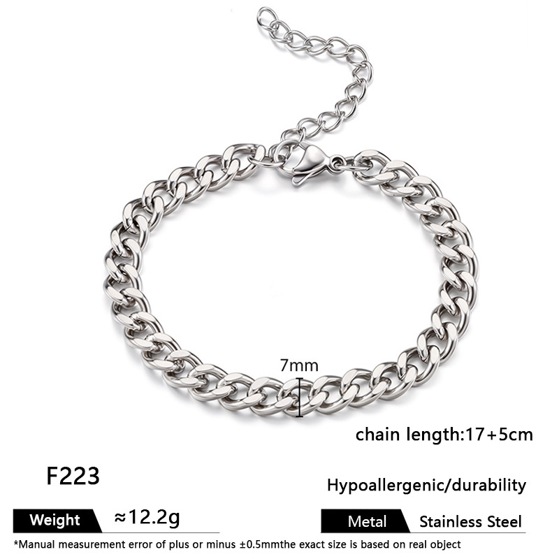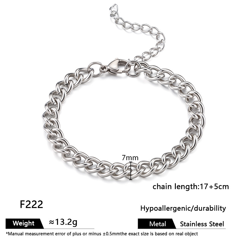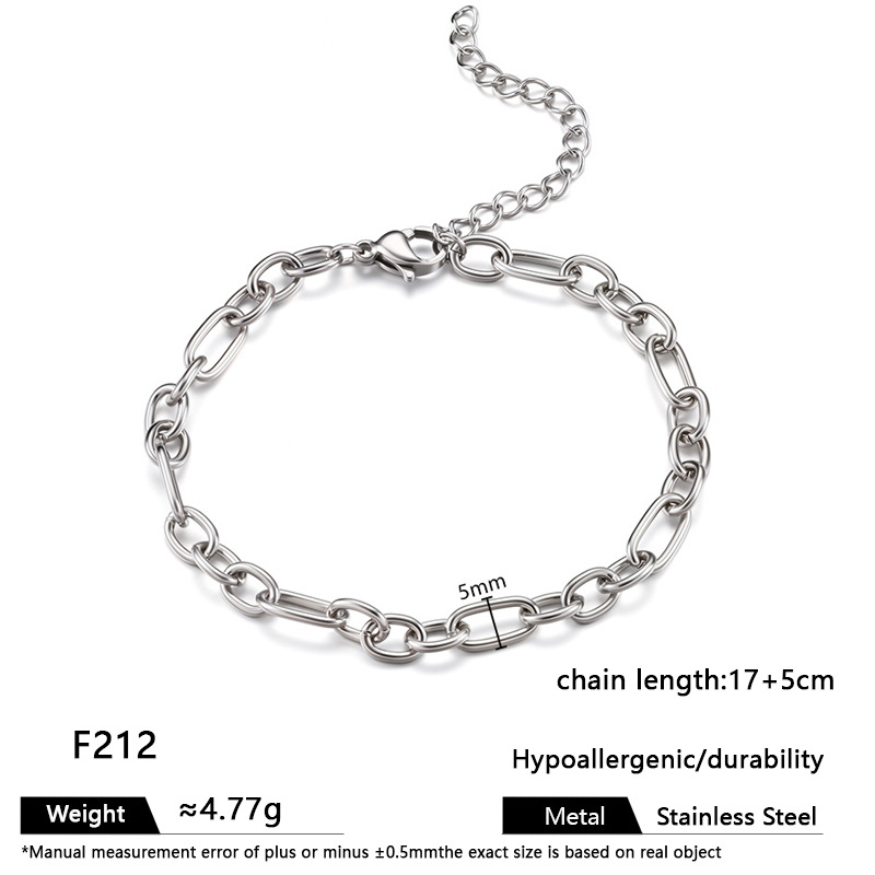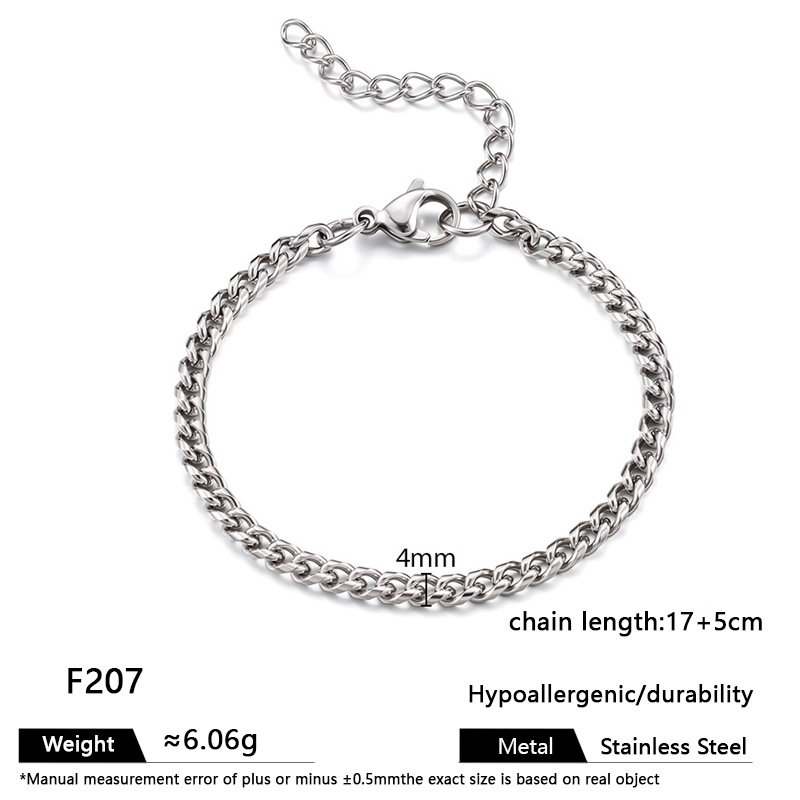 F097-Браслет-цепочка со змеиной цепочкой цвета стали, шириной 6 мм, длиной 17+5 см.; F205-браслет двусторонний шлифовальный стальной цвет шириной 5мм, 17+5см; F206-Браслет из двухслойного четырехстороннего шлифования цвета стали, ширина 4,4 мм, 17+5 см.; F207-Круглый шлифовальный браслет стального цвета шириной 4 мм и длиной 17+5 см.; F212-Стальной цвет О-образный браслет 3:1, ширина 5мм, длина 17+5см; F213-Браслет закрытого вдавливания цвета стали-ширина 4 мм, длина 17+5 см.; F218-Сварная плоская овальная крестовая цепочка стального цвета, ширина 4,3 мм, длина 17+5 см.; F219-Цепочка НК цвета сталь 1:l браслет-ширина 7мм, 17+5см; F220-Браслет шестигранной шлифовки цвета стали-ширина 7,5мм, длина 17+5см; F221-Браслет стального цвета NK3:1, ширина 7мм, длина 17+5см; F222-Браслет со одной пряжкой цвета стали, ширина 7 мм, 17+5 см.; F223-Двусторонний шлифовальный браслет стального цвета шириной 7 мм, 17+5 см.; F224-О-образный крест-браслет стального цвета-ширина 7мм, 17+5см; F225-Плоский овальный браслет с крестиком-ширина 7,5 мм, 17+5 см; F226-Стальная цветная открытая овальная крестовая цепочка шириной 7 мм, 17+5 см.; F227-стальная цветная квадратная проволочная цепь-ширина 1,2х6мм, длина 17+5см