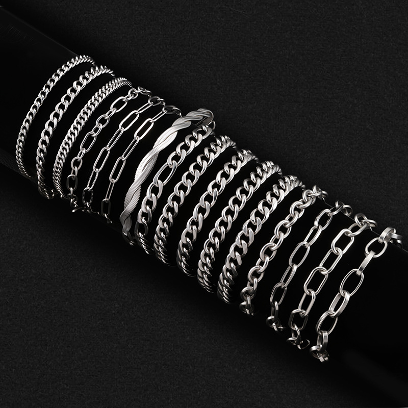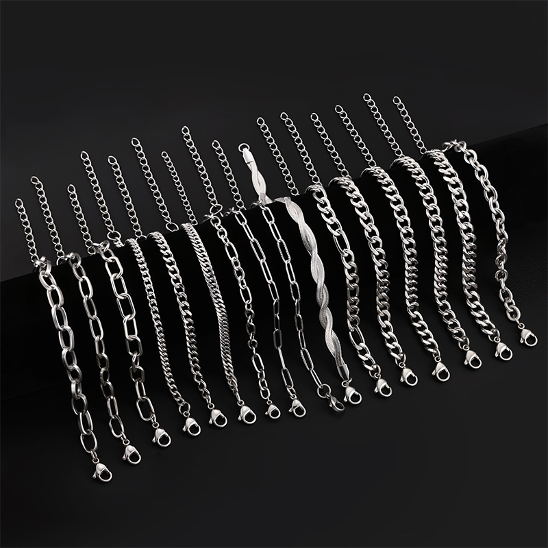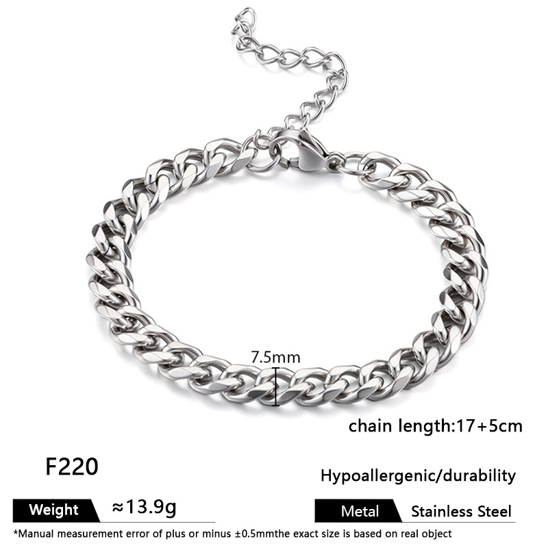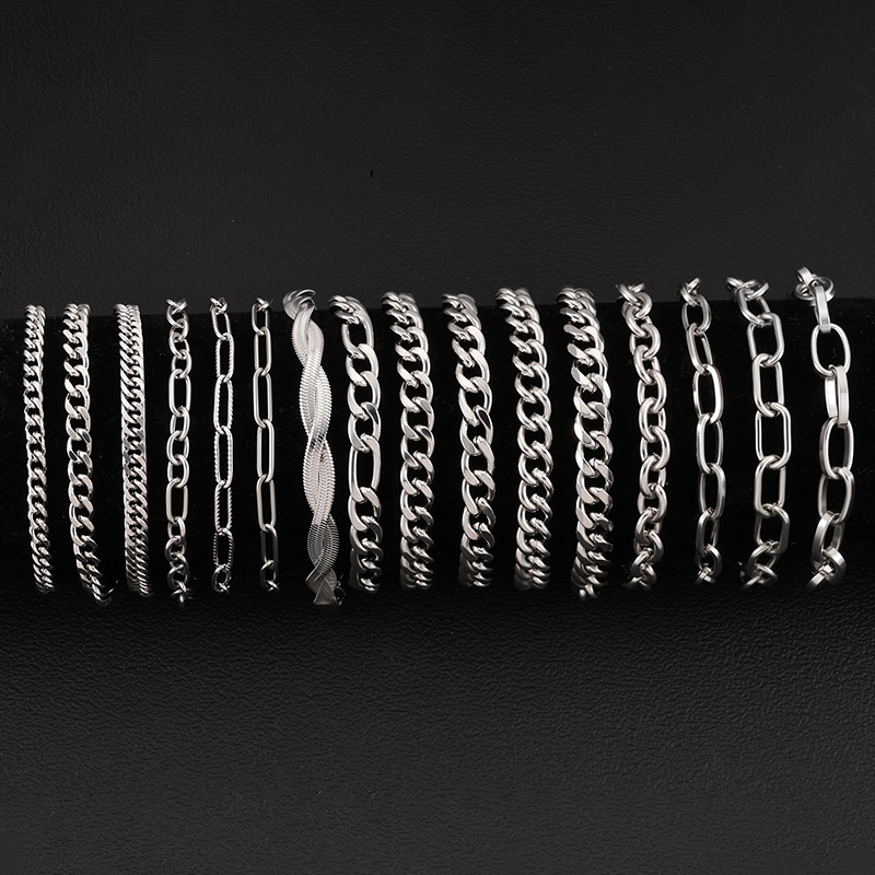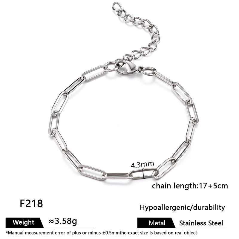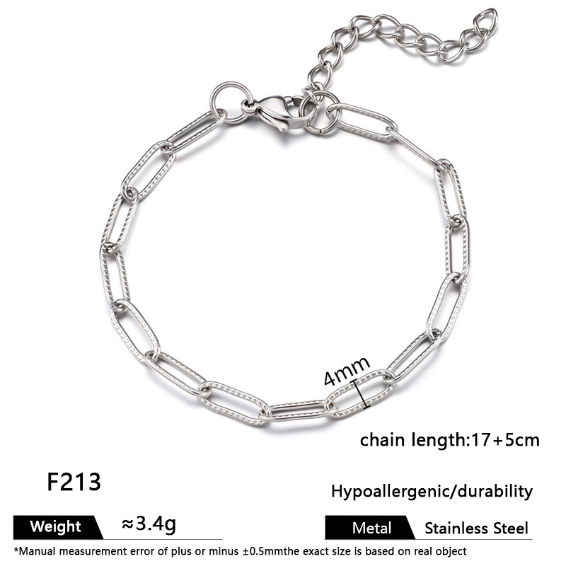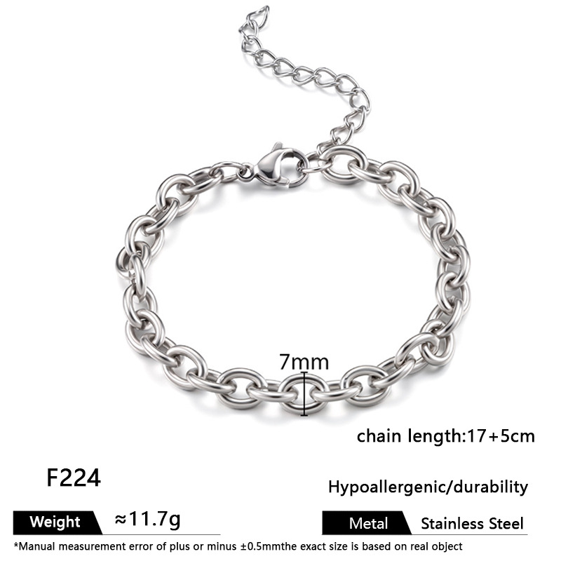 F097-Браслет-цепочка со змеиной цепочкой цвета стали, шириной 6 мм, длиной 17+5 см.; F205-браслет двусторонний шлифовальный стальной цвет шириной 5мм, 17+5см; F206-Браслет из двухслойного четырехстороннего шлифования цвета стали, ширина 4,4 мм, 17+5 см.; F207-Круглый шлифовальный браслет стального цвета шириной 4 мм и длиной 17+5 см.; F212-Стальной цвет О-образный браслет 3:1, ширина 5мм, длина 17+5см; F213-Браслет закрытого вдавливания цвета стали-ширина 4 мм, длина 17+5 см.; F218-Сварная плоская овальная крестовая цепочка стального цвета, ширина 4,3 мм, длина 17+5 см.; F219-Цепочка НК цвета сталь 1:l браслет-ширина 7мм, 17+5см; F220-Браслет шестигранной шлифовки цвета стали-ширина 7,5мм, длина 17+5см; F221-Браслет стального цвета NK3:1, ширина 7мм, длина 17+5см; F222-Браслет со одной пряжкой цвета стали, ширина 7 мм, 17+5 см.; F223-Двусторонний шлифовальный браслет стального цвета шириной 7 мм, 17+5 см.; F224-О-образный крест-браслет стального цвета-ширина 7мм, 17+5см; F225-Плоский овальный браслет с крестиком-ширина 7,5 мм, 17+5 см; F226-Стальная цветная открытая овальная крестовая цепочка шириной 7 мм, 17+5 см.; F227-стальная цветная квадратная проволочная цепь-ширина 1,2х6мм, длина 17+5см
