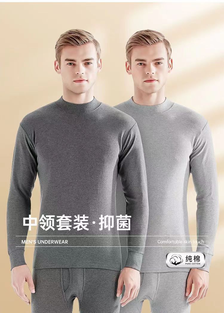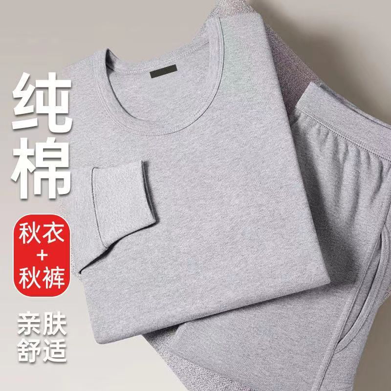 Мужской комплект из чистого хлопка: свитер с круглым вырезом и тонкое антибактериальное термобелье, оптом, утолщенный для тепла.