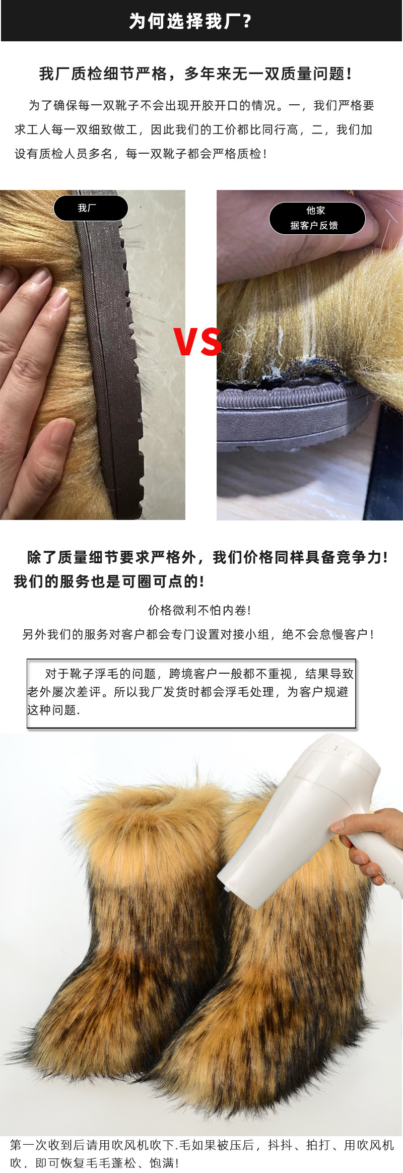 建议跨境或者贸易公司的客户们,可以在包装里面附张说明小纸条:毛毛在路途中会被压,收到后用吹风机吹下,毛毛即可恢复图片中的饱满样子,穿上就会特别漂亮!我们可以帮亲免费【打印英文说明小纸条】