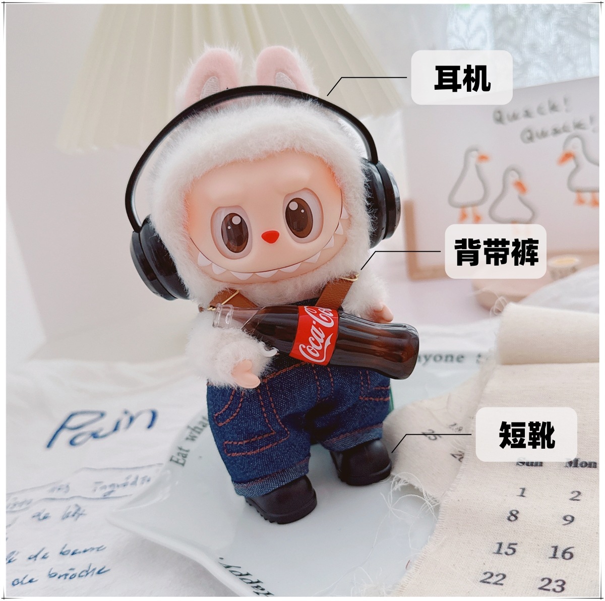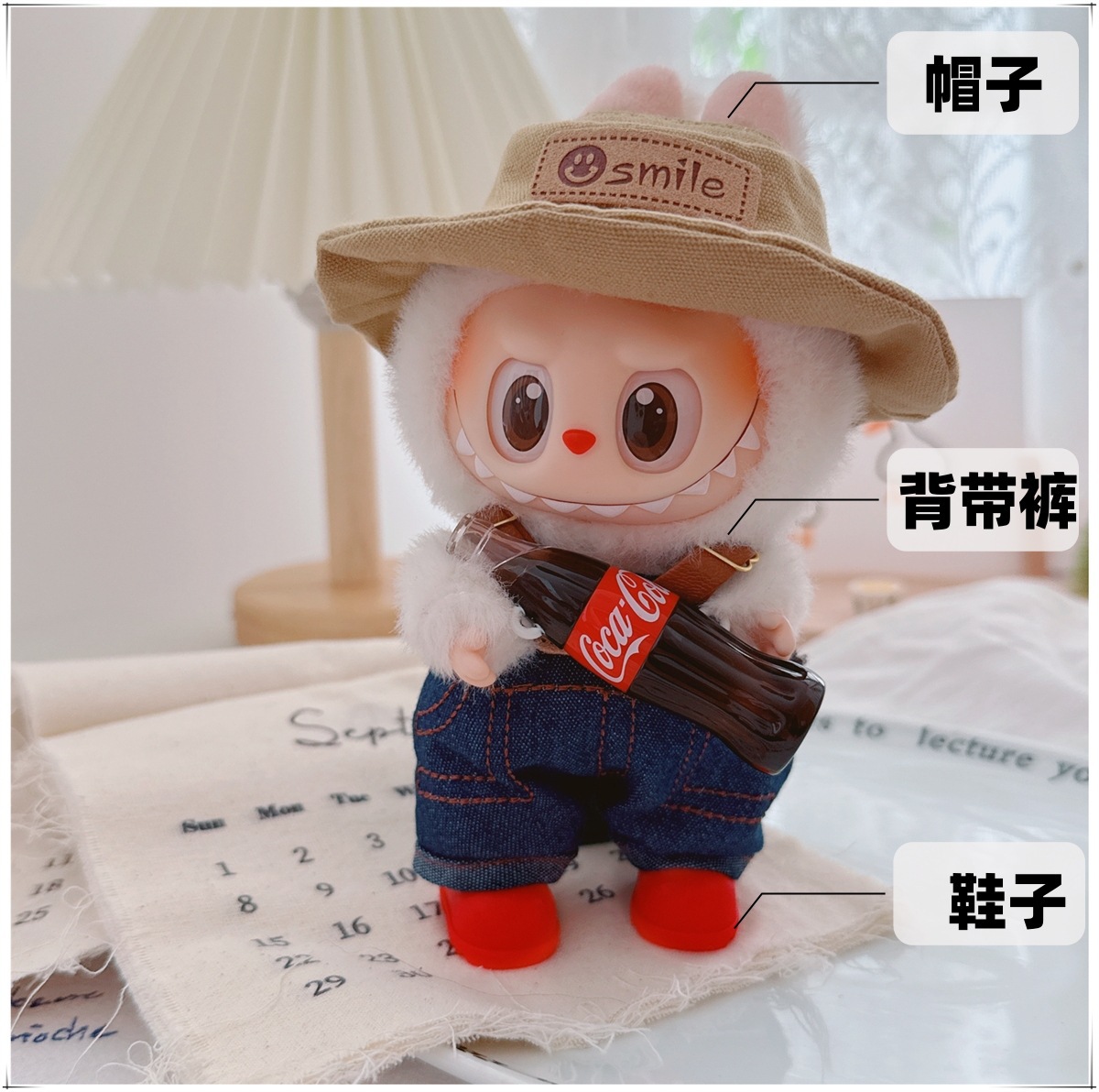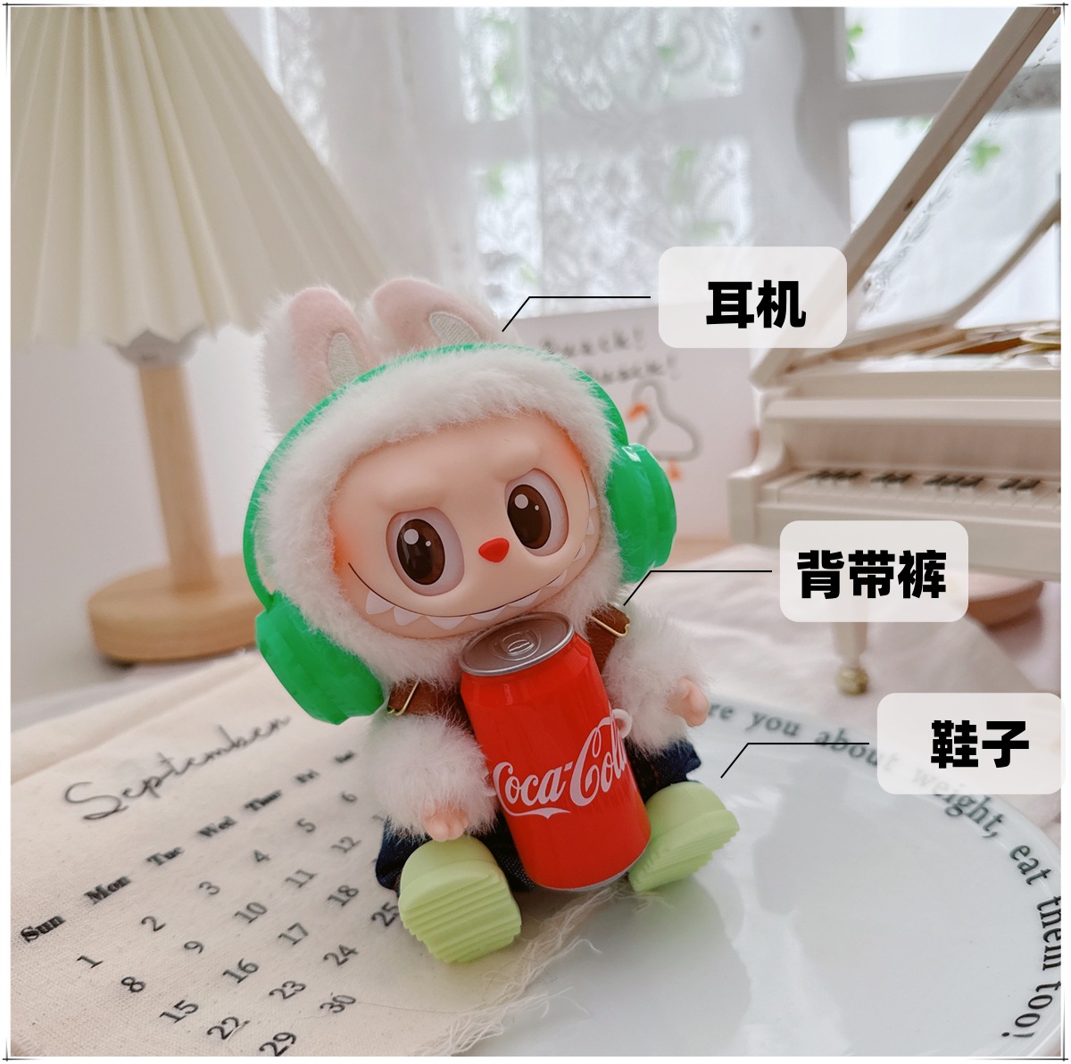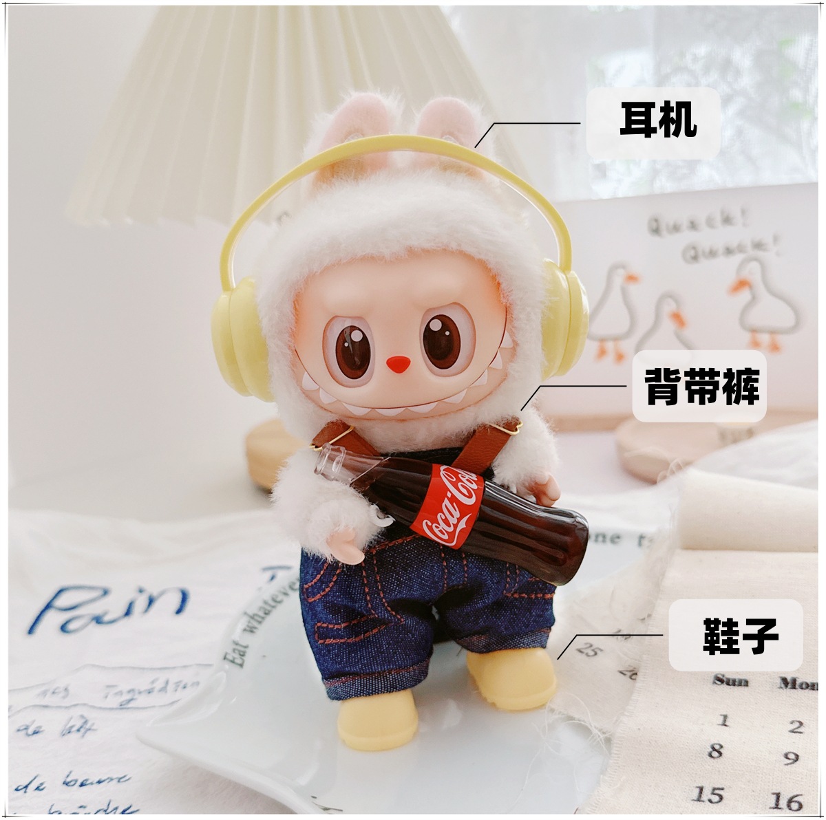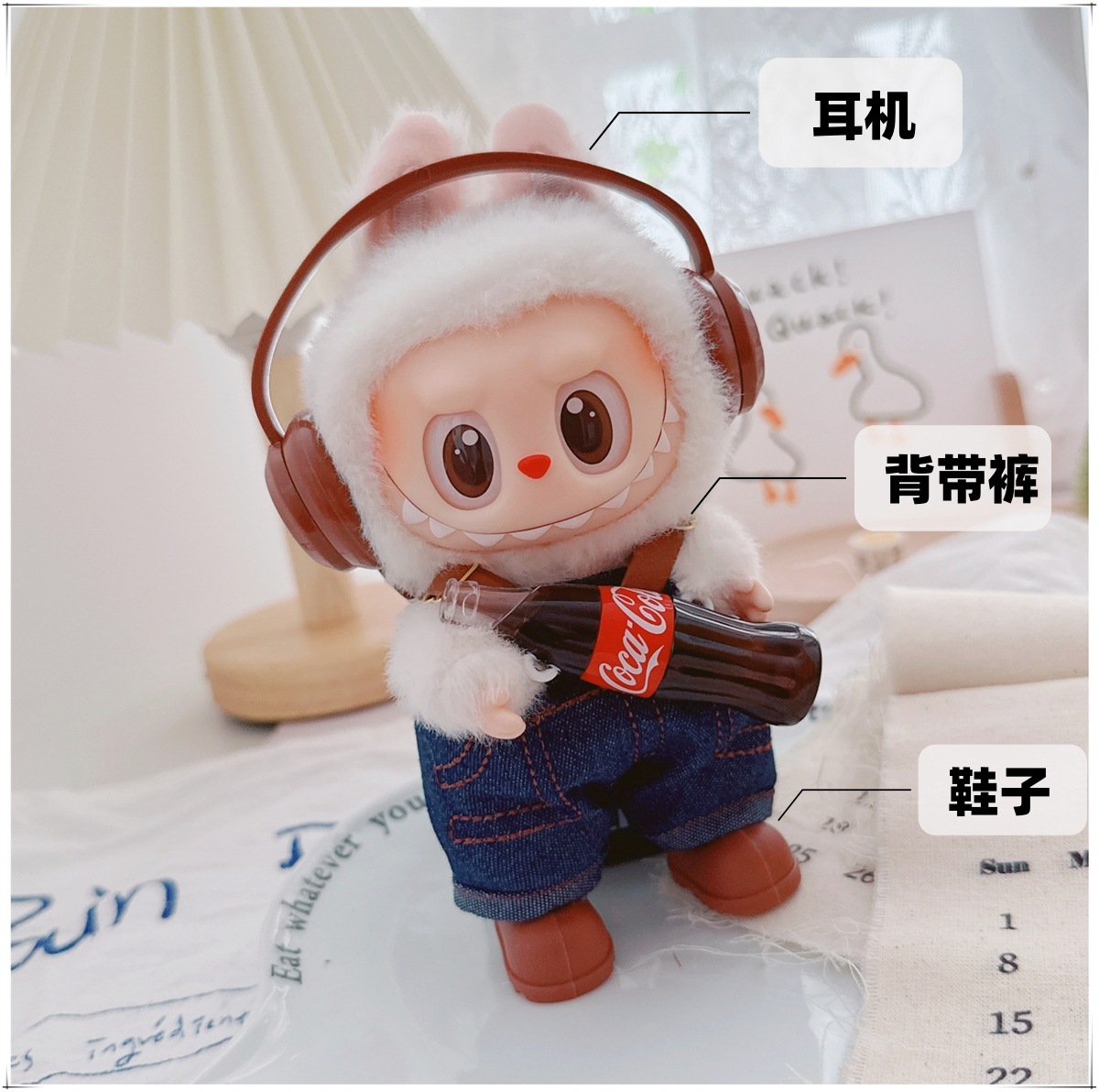 Детская одежда Labubu Coca-Cola первого, второго и третьего поколения, виниловая одежда Labubu для сидения и стояния, комбинезон, наушники, обувь