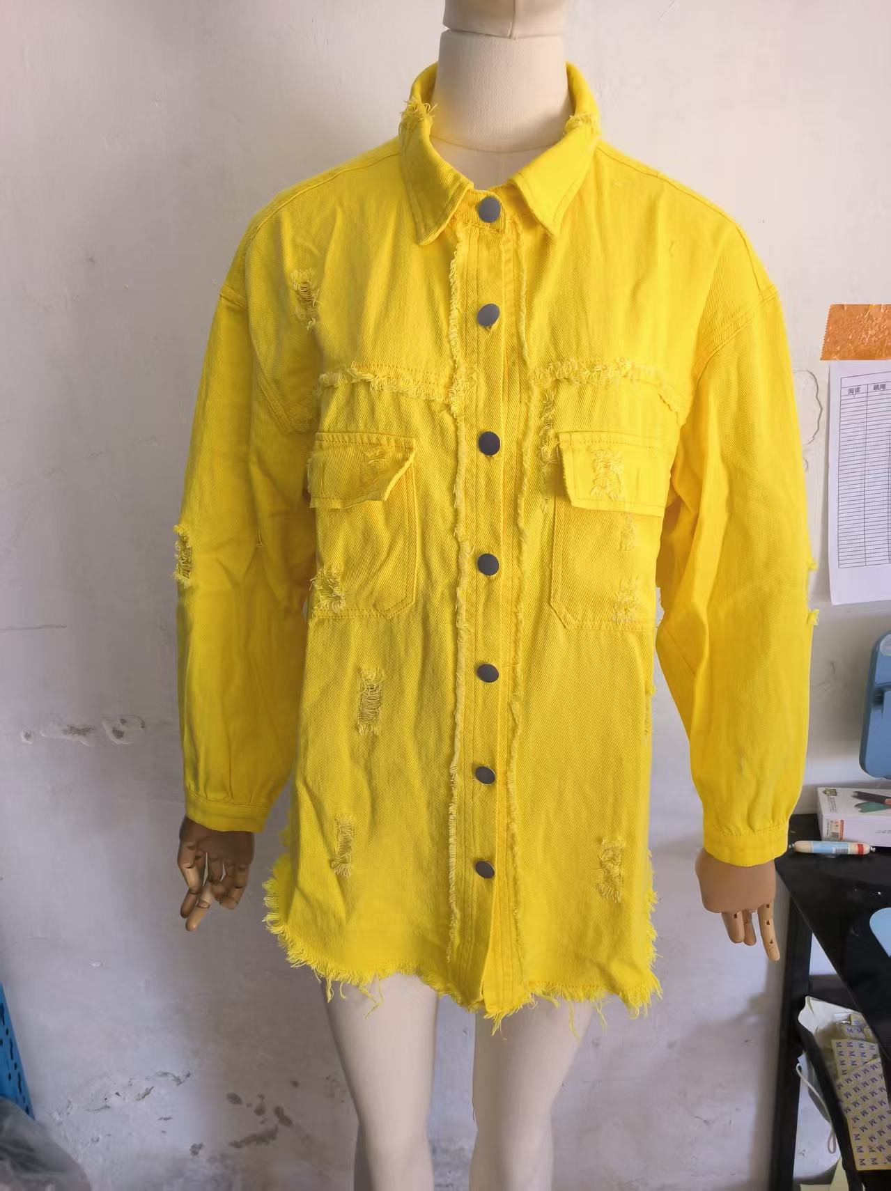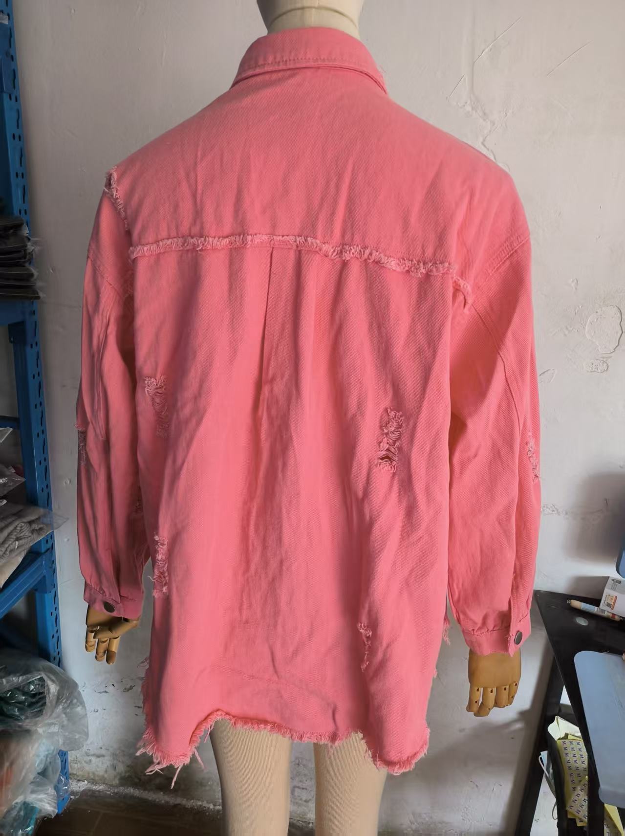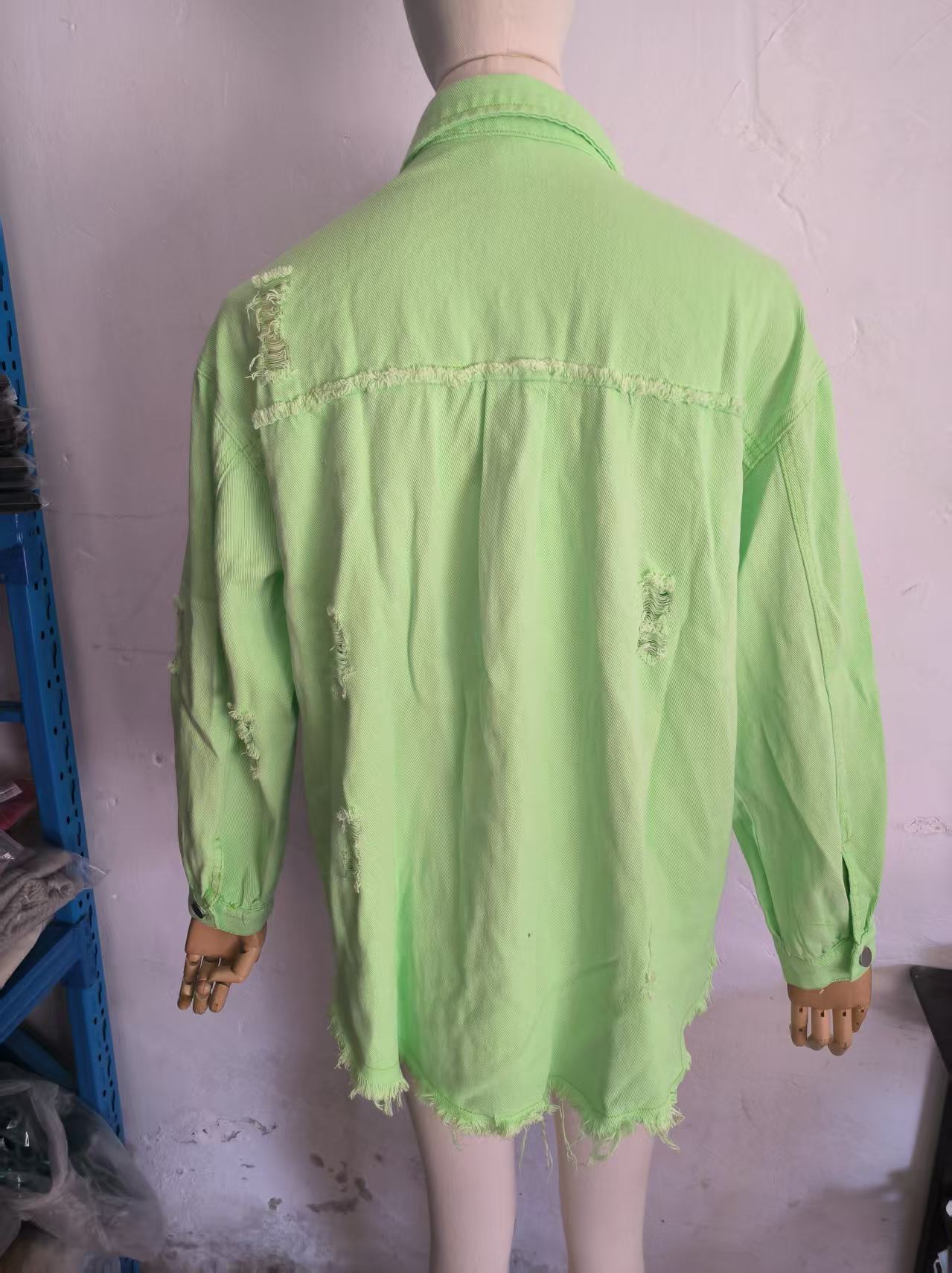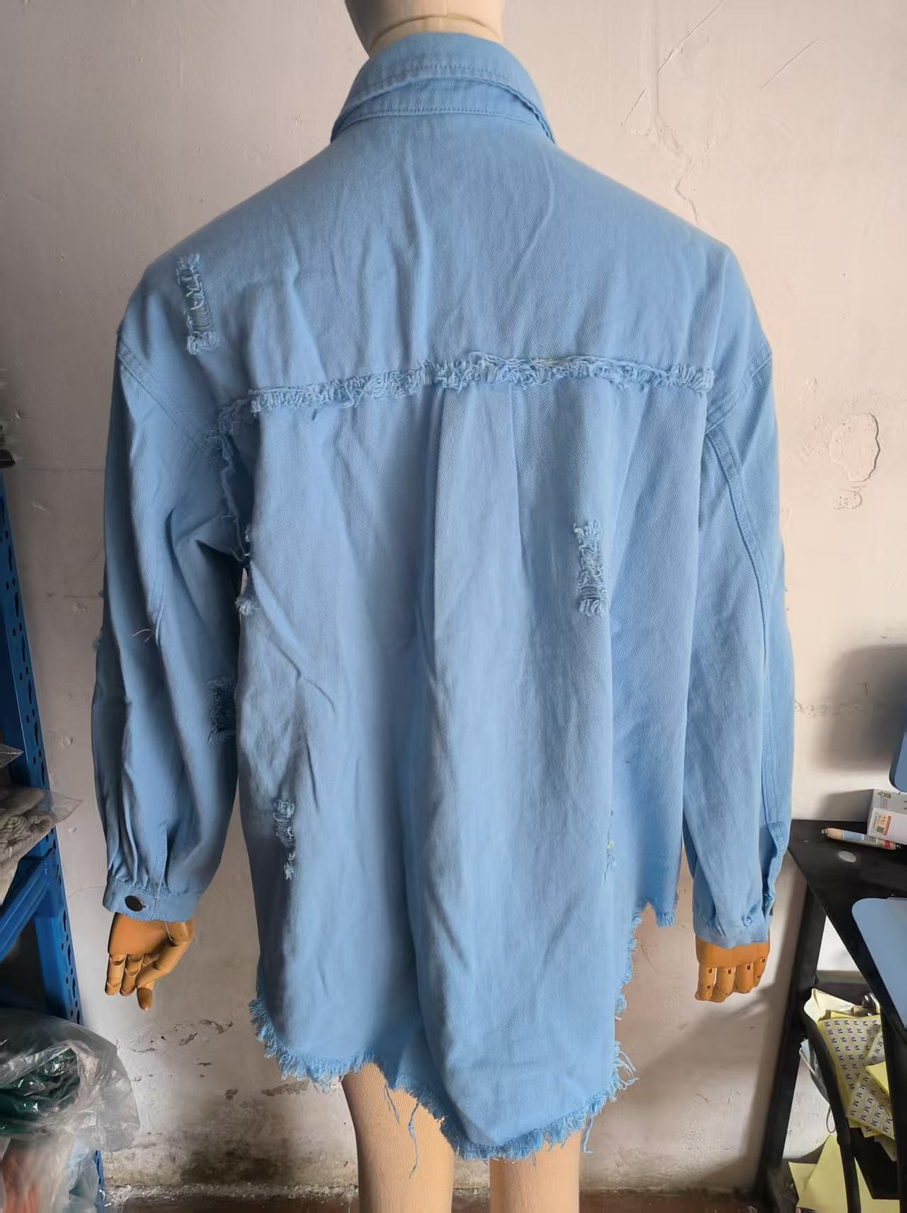 厂家直销跨境新款美式纯色中长款破洞长袖牛仔外套欧美风夹克女