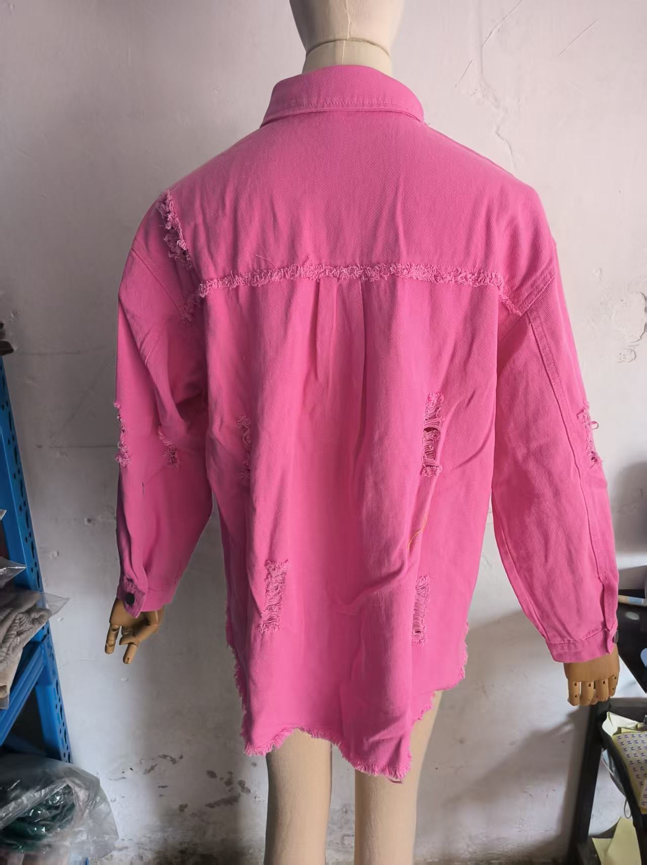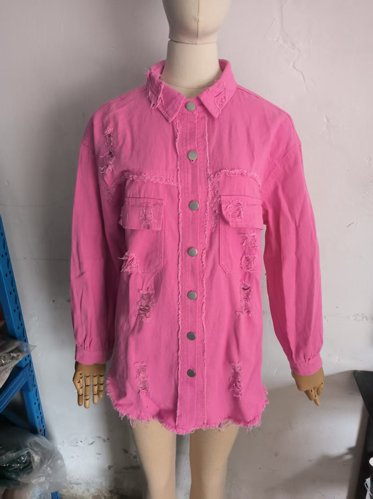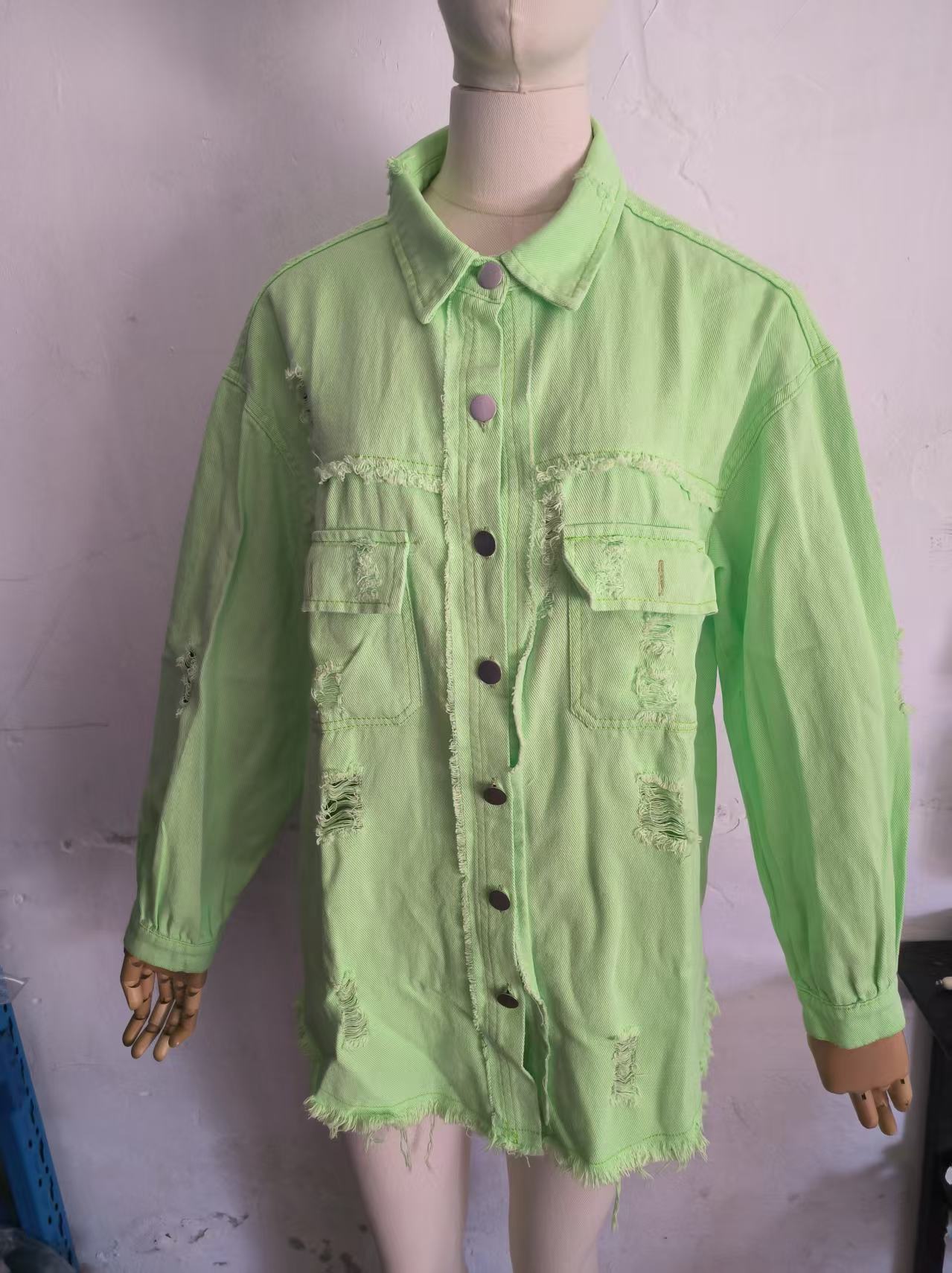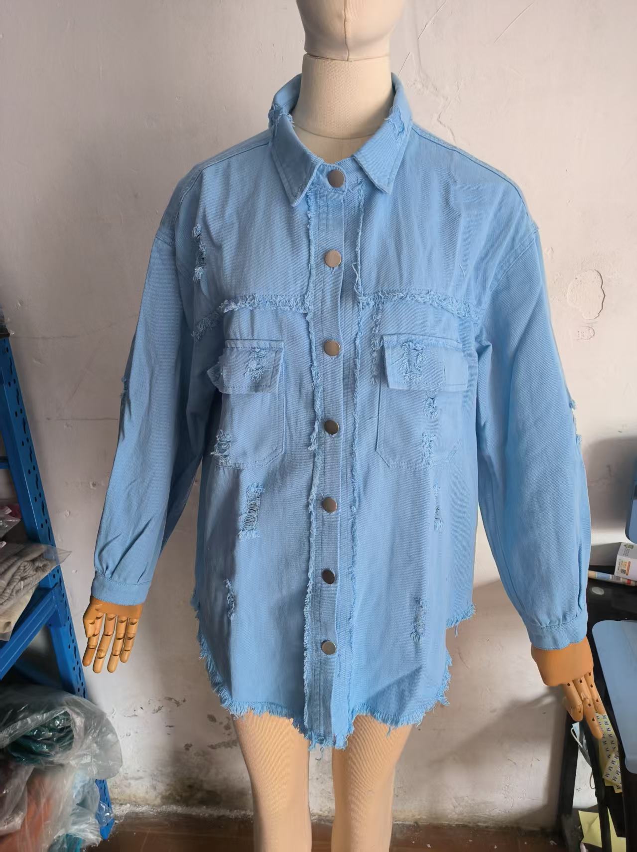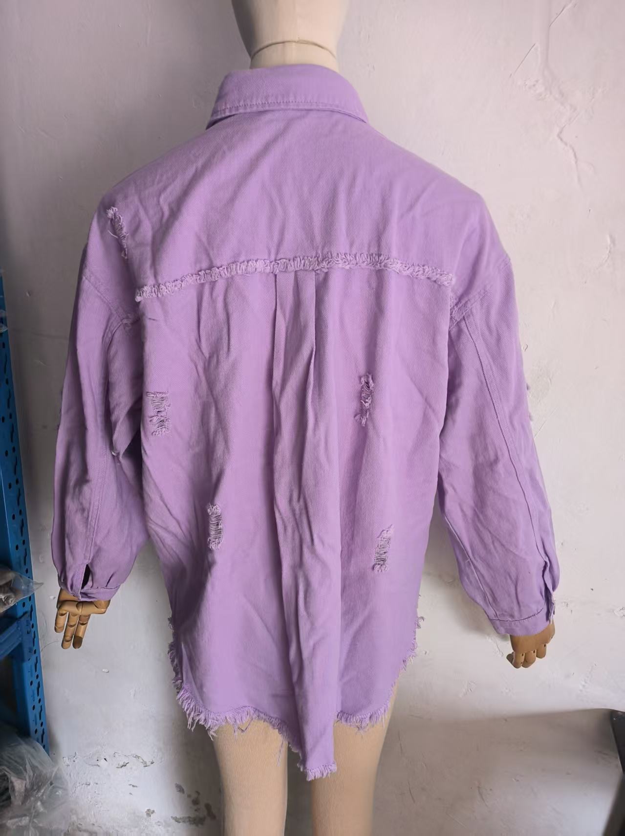 厂家直销跨境新款美式纯色中长款破洞长袖牛仔外套欧美风夹克女