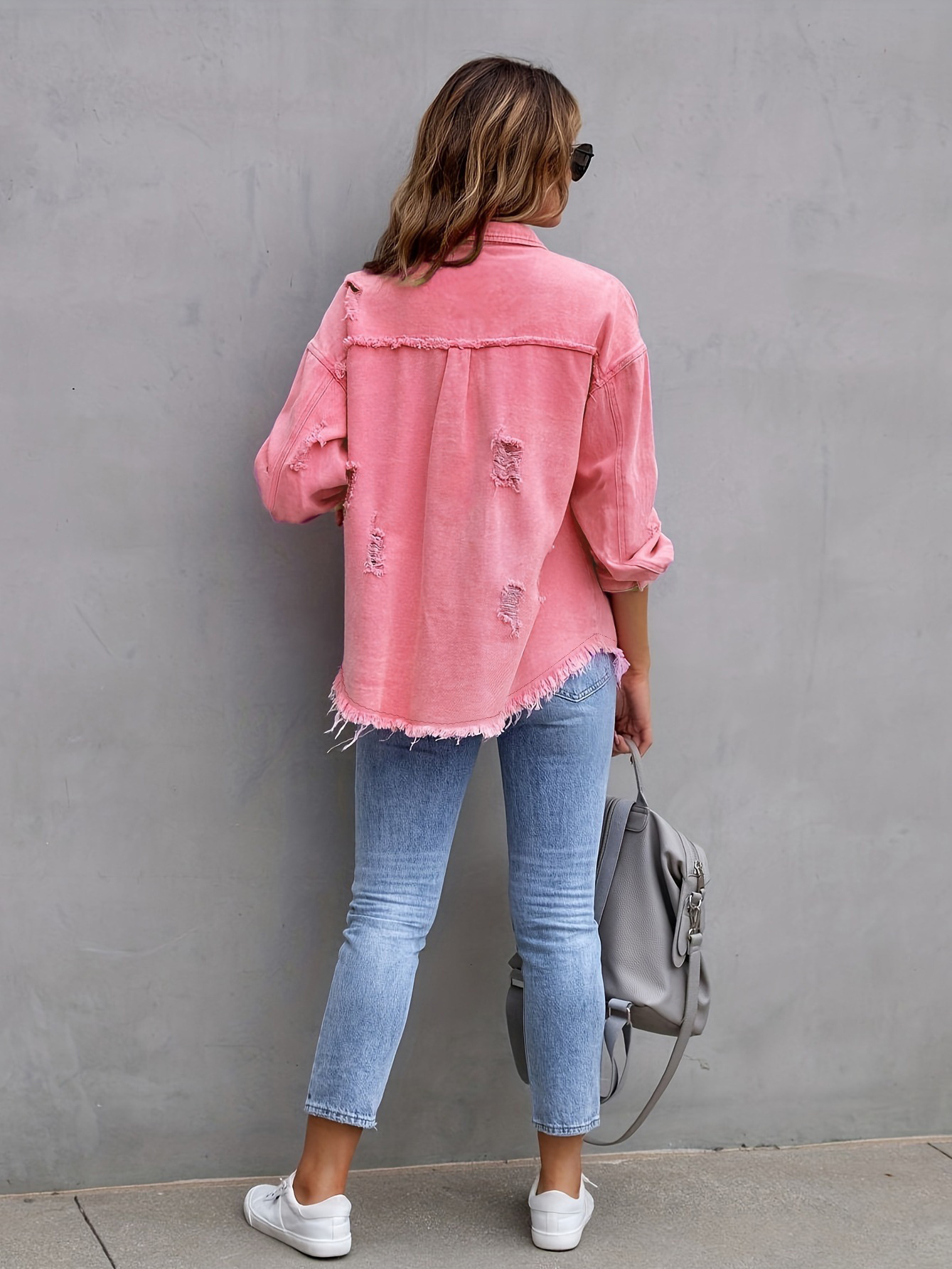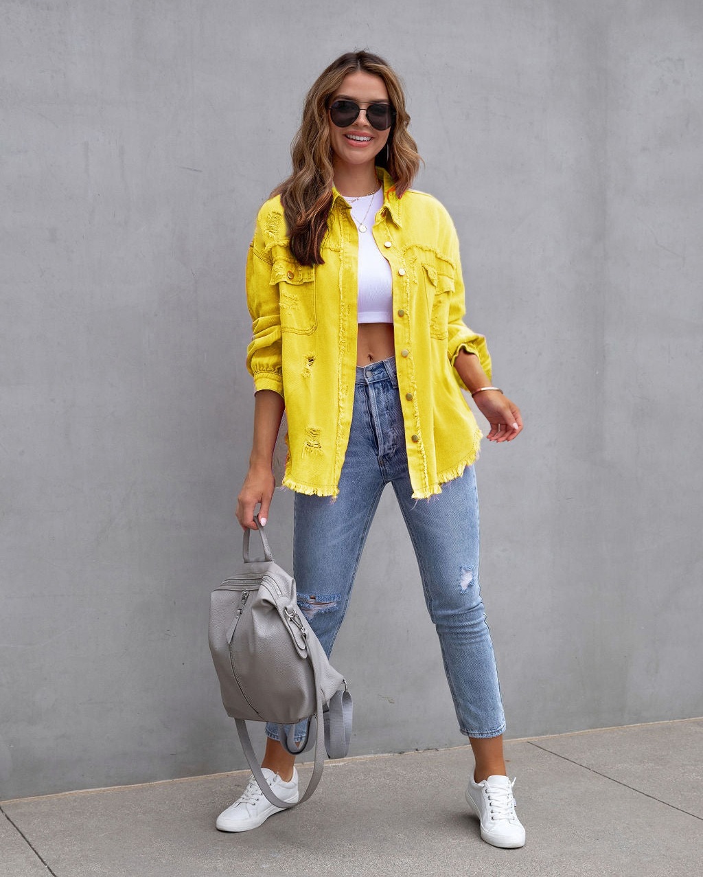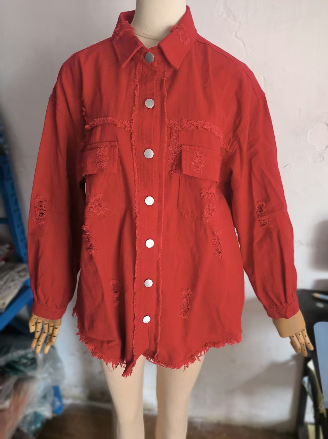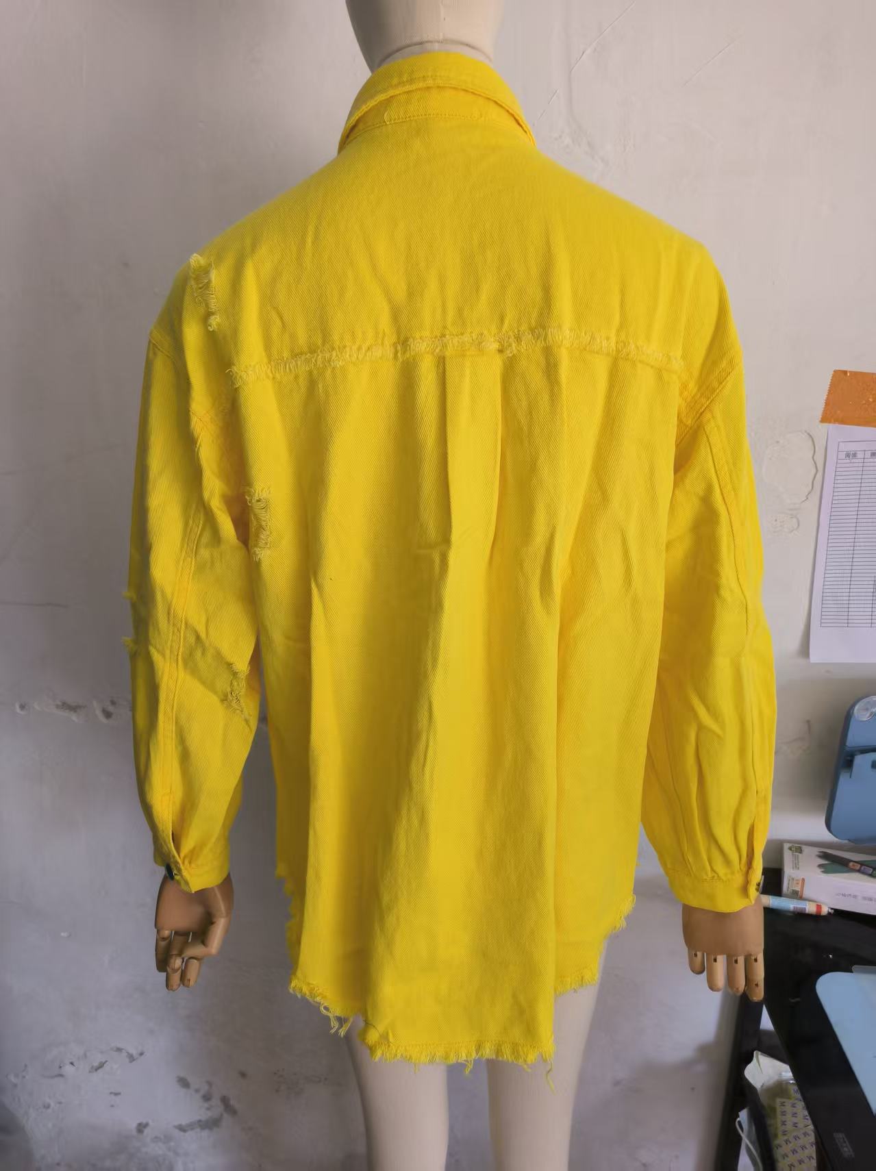 厂家直销跨境新款美式纯色中长款破洞长袖牛仔外套欧美风夹克女
