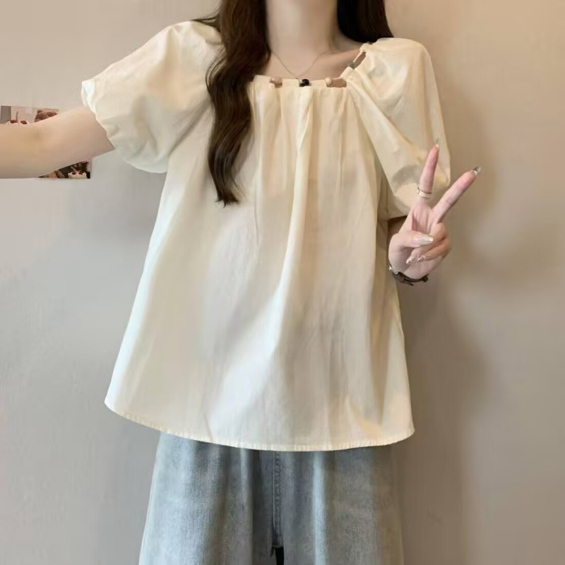 Летняя женская рубашка с короткими рукавами и синими пышными рукавами, украшенная бисером.