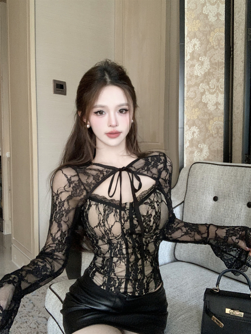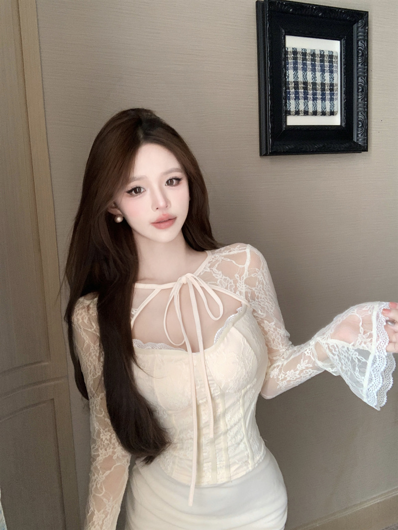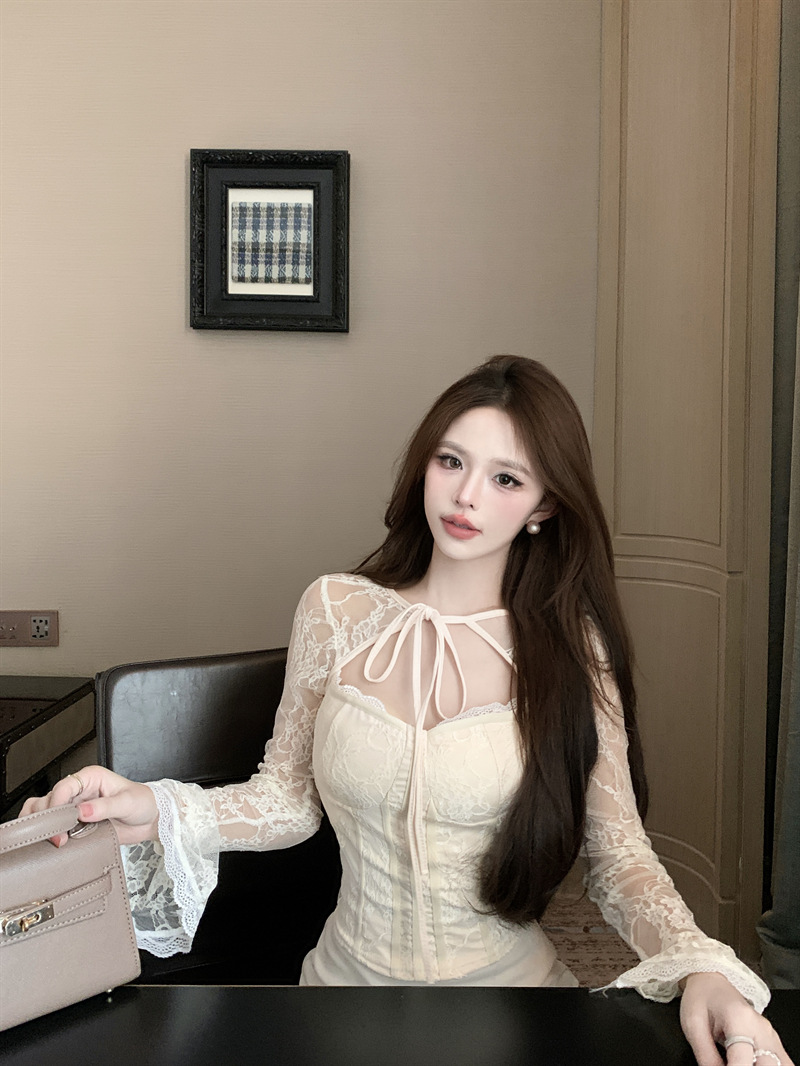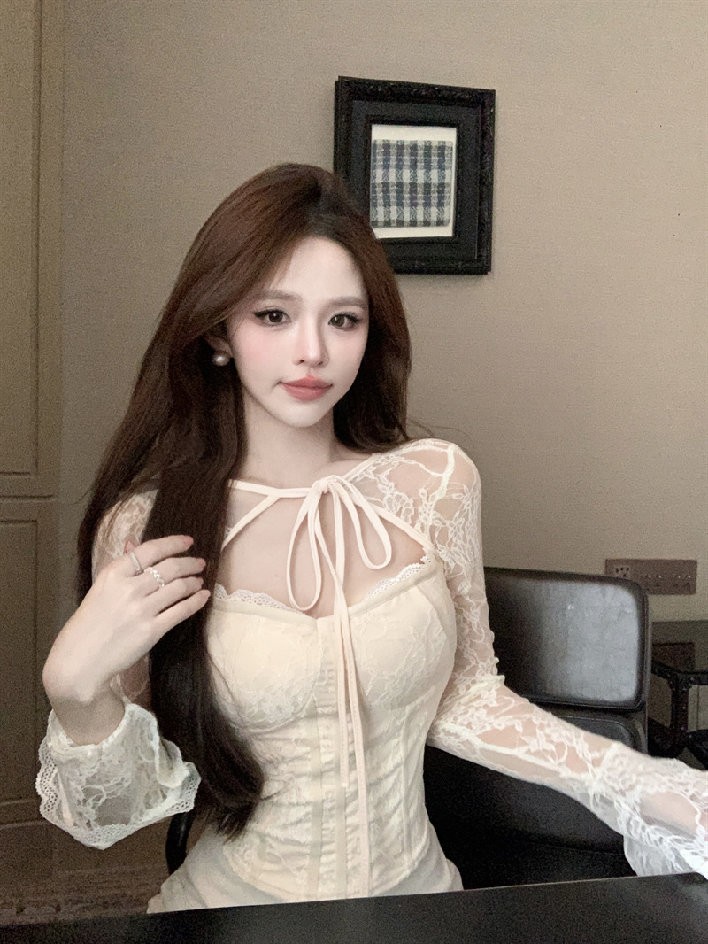 Настоящая весенне-осенняя дизайнерская кружевная рубашка с воротником, супертонкая и милая элегантная кружевная рубашка с рукавами-фонариками